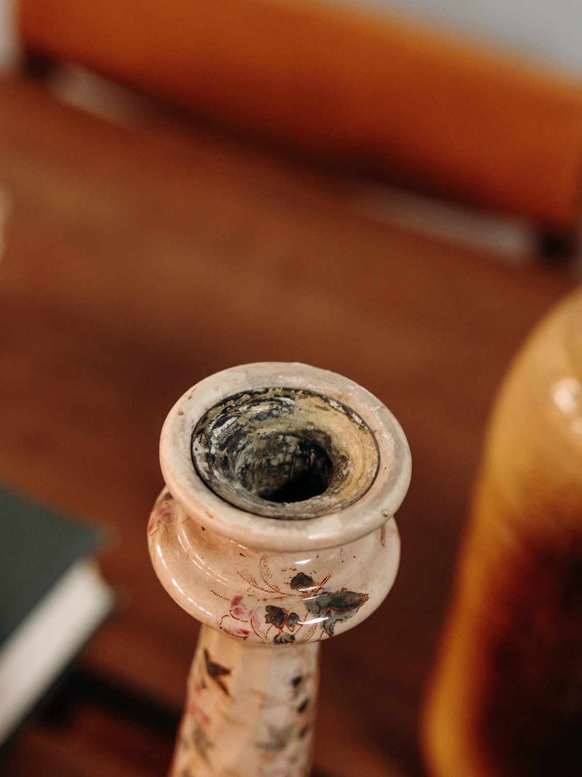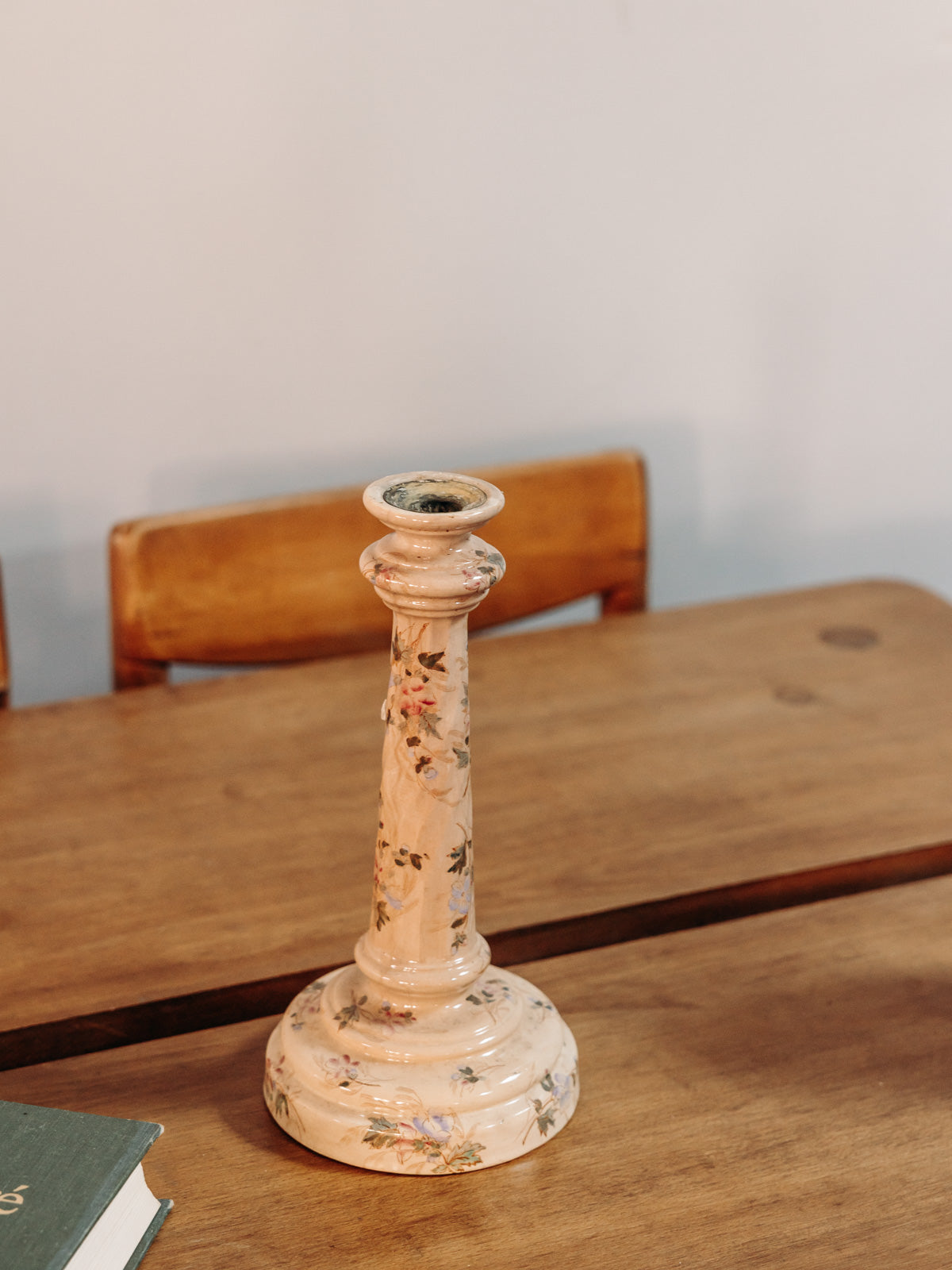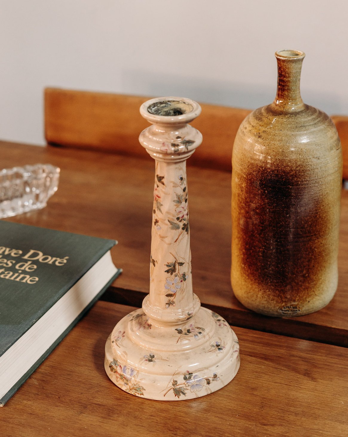 Enhance your interior with this pink ceramic candle holder, adorned with a delicate floral motif that evokes a sense of poetry. Its slender silhouette, resting on a round base, ensures perfect stability while showcasing the flame, the smooth surface subtly playing with the light. Perfect for creating a soft and warm ambiance on a console table, bedside table, or as a centerpiece, it adds a feminine and refined touch to your evenings. Some minor wear is present.