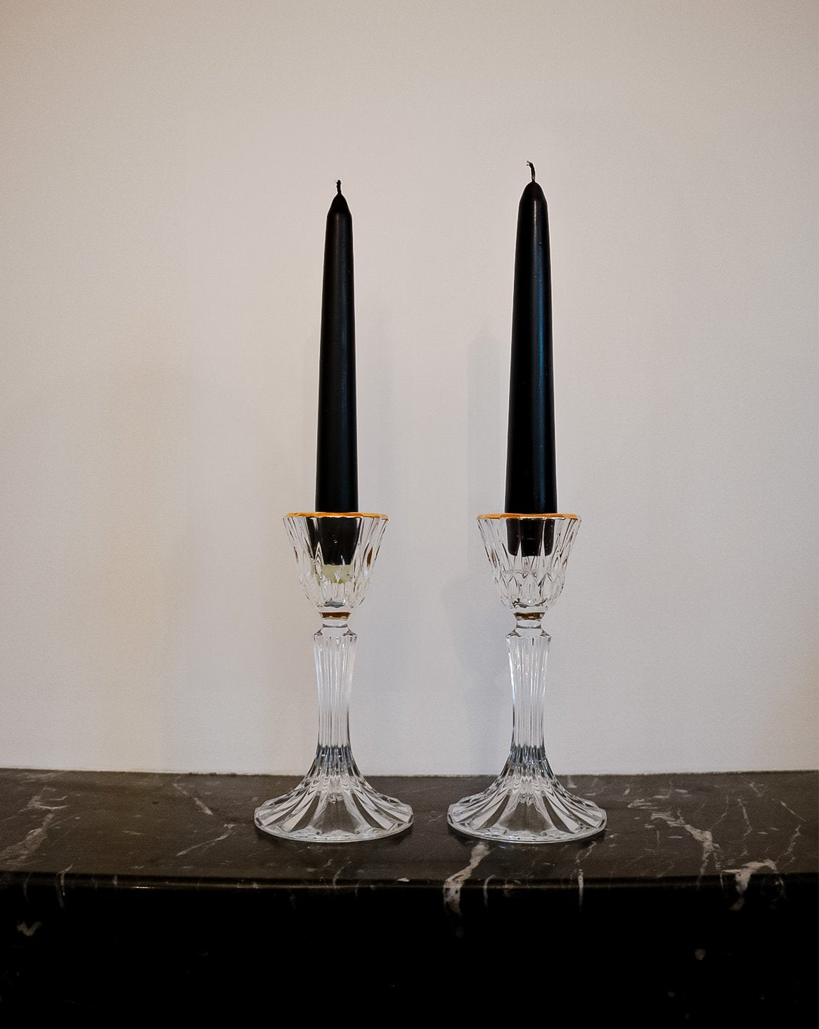 Elevate your table setting with this pair of crystal and gilt candlesticks. Their slender stems and compact bases create an elegant and stable balance. The faceted crystal captures and diffuses the candlelight for a warm and refined ambiance, ideal for an intimate dinner, an entryway console, or a mantelpiece. The contrasting gilt accentuates their understated, classic appeal, adding a luminous and sophisticated touch to your décor.