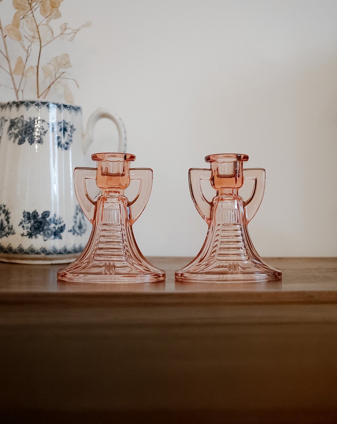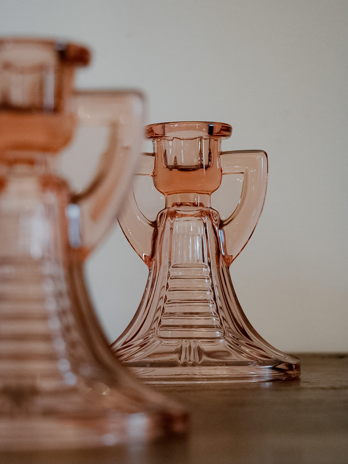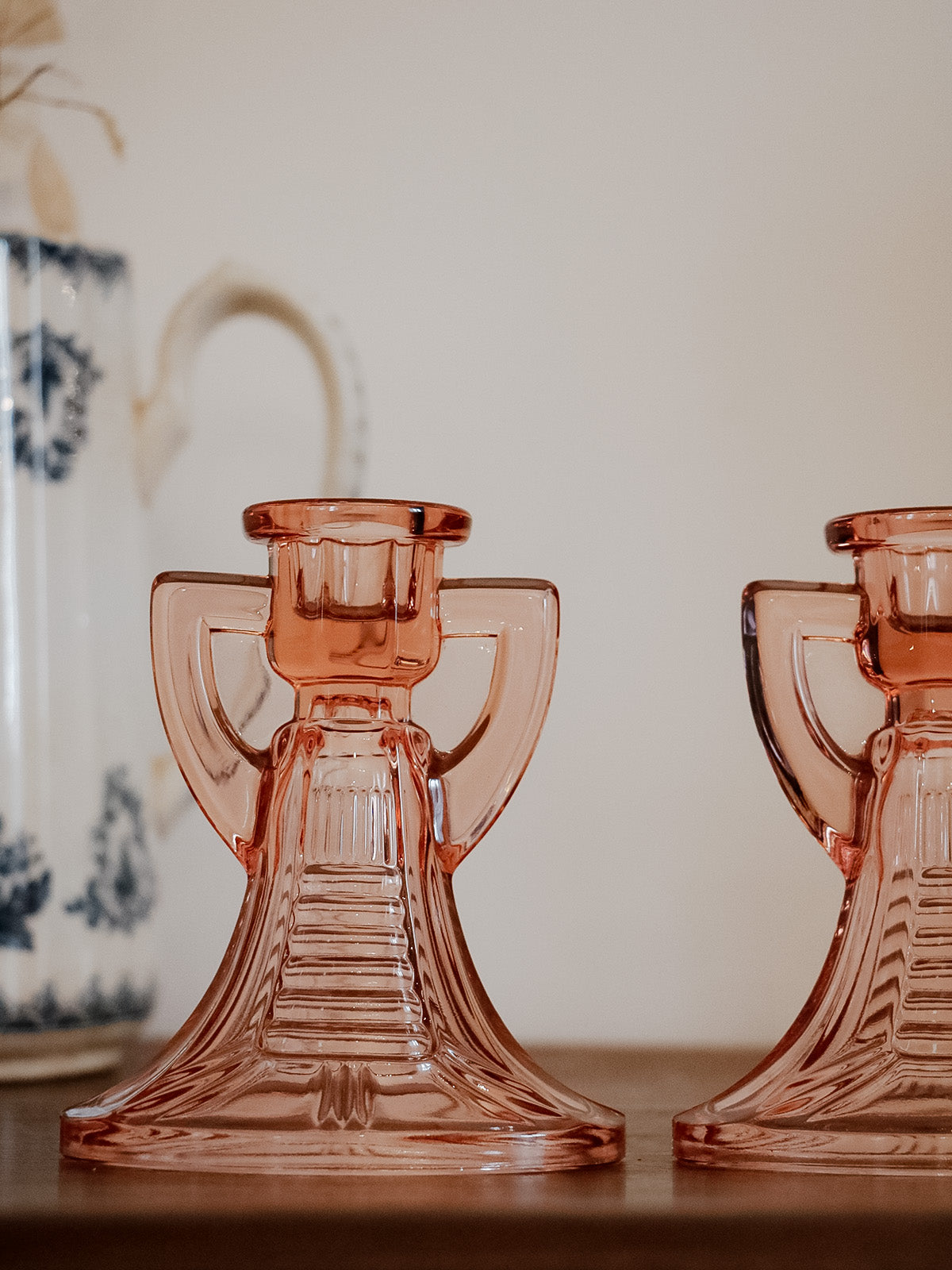 Discover this pair of Val Saint Lambert pink crystal candlesticks, dating from 1935, with their delicate and elegant design. Their slender silhouette and compact size make them perfect for adorning an intimate table or mantelpiece without overwhelming the space. The polished crystal captures the flame and diffuses a rosy glow, creating a warm and refined ambiance for your dinners or quiet moments. A set that evokes Belgian craftsmanship and the aesthetics of the 1930s.