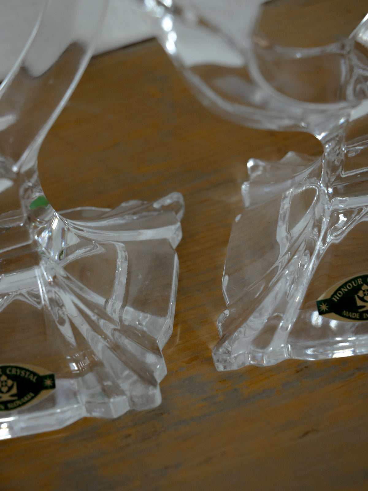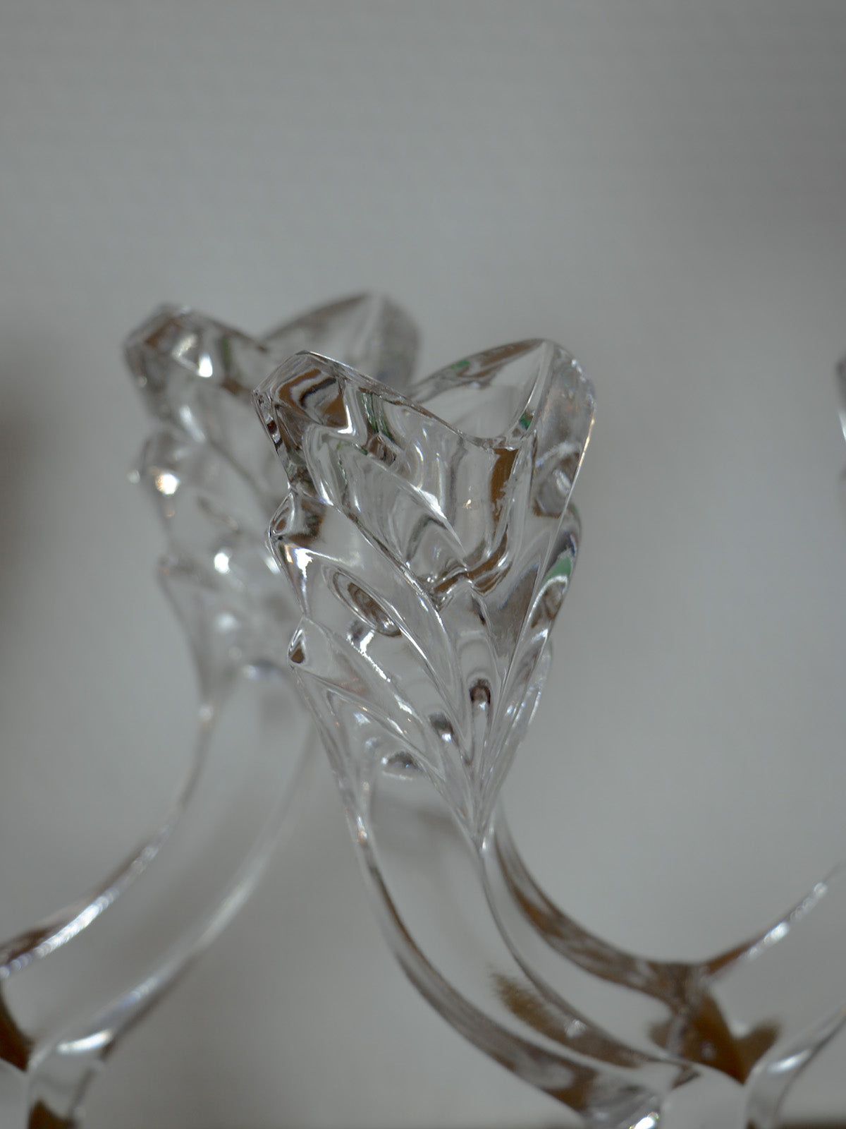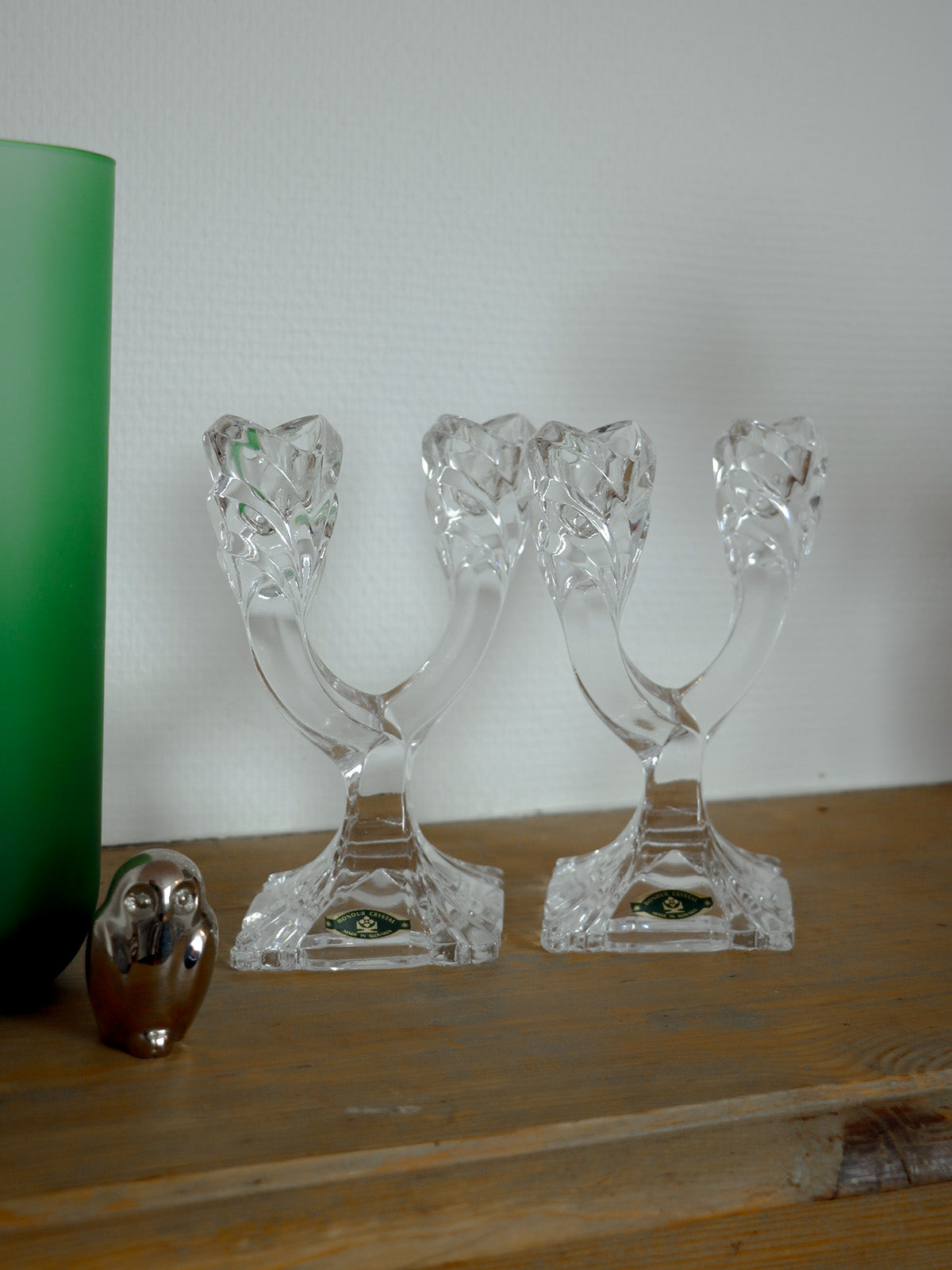 Elevate your table setting with this pair of two-branch Slovakian crystal candlesticks. Their faceted design captures the light, creating a refined sparkle. Their compact size and square base provide excellent stability, making them ideal for the center of an intimate dinner party or a mantelpiece, creating a warm and elegant ambiance. Perfect for blending modern and traditional styles, they offer a discreet yet striking presence.