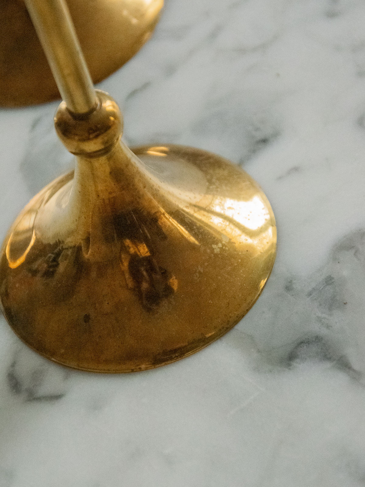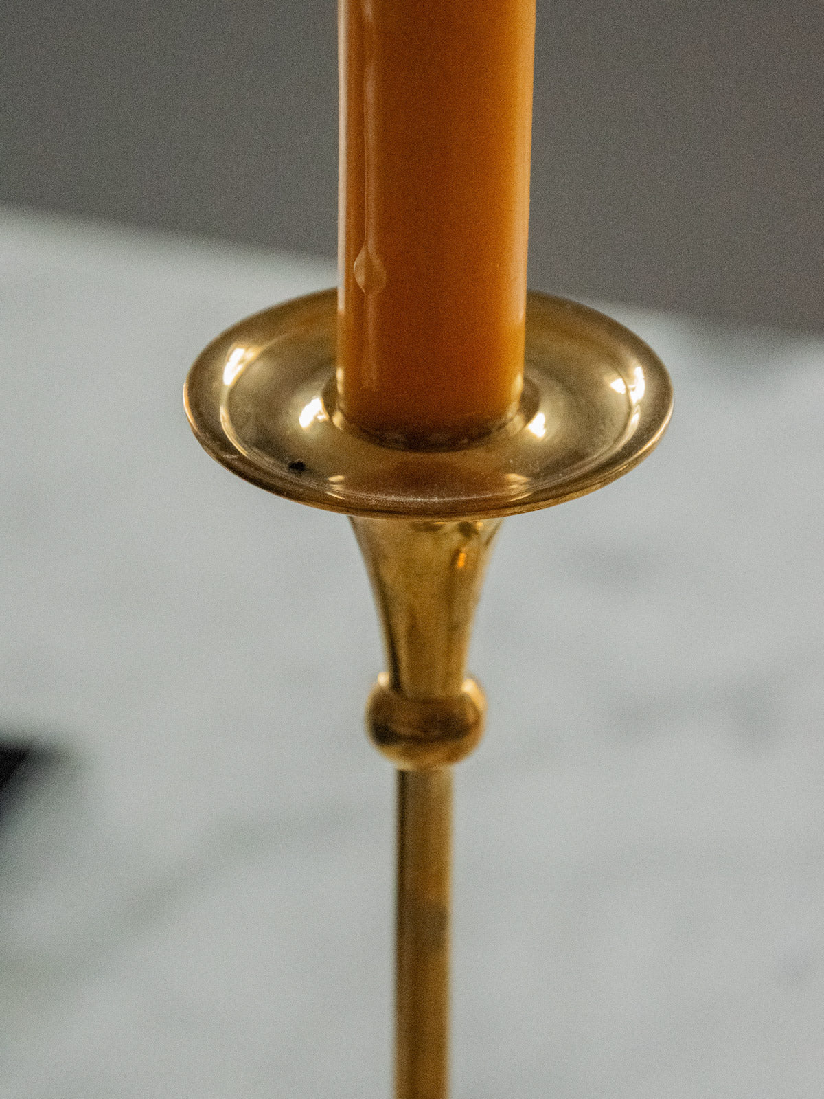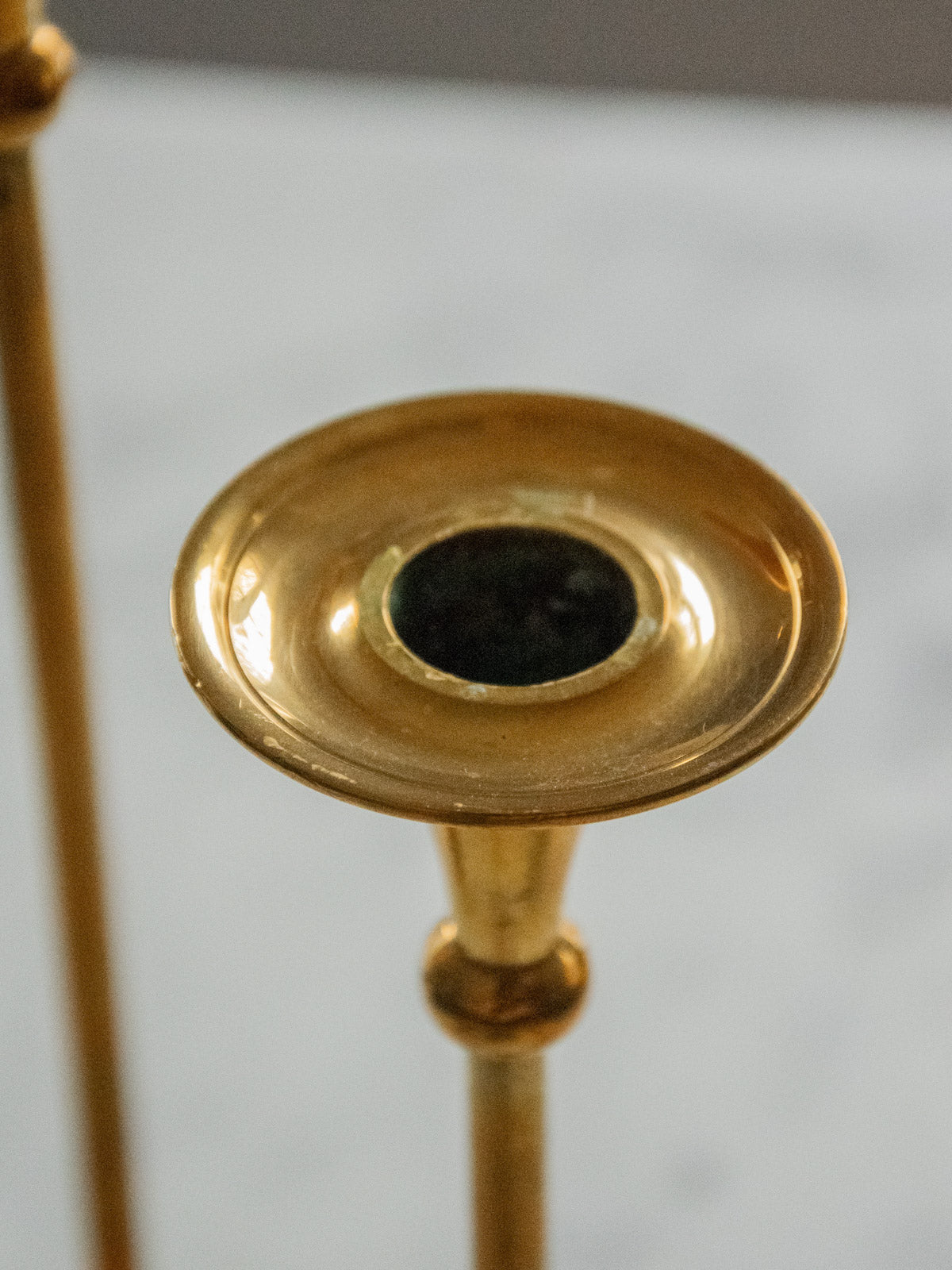 Découvrez cet ensemble de trois bougeoirs en laiton des années 1960, à la silhouette trompette très fine et socle rond qui leur confère stabilité et élégance. Le jeu de hauteurs dégressives souligne leurs proportions élancées et crée un rythme visuel parfait pour une table, une cheminée ou une console. En laiton chaleureux, ils diffusent une lumière tamisée et instaurent une ambiance intimiste et raffinée, idéale pour sublimer un intérieur aux accents vintage.