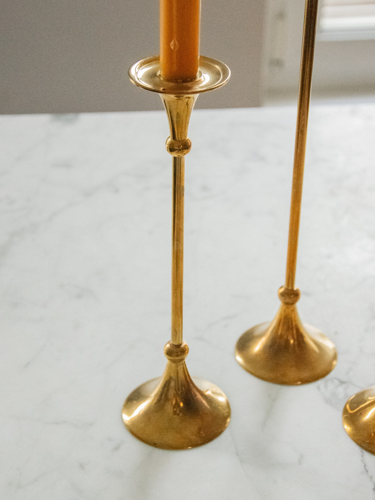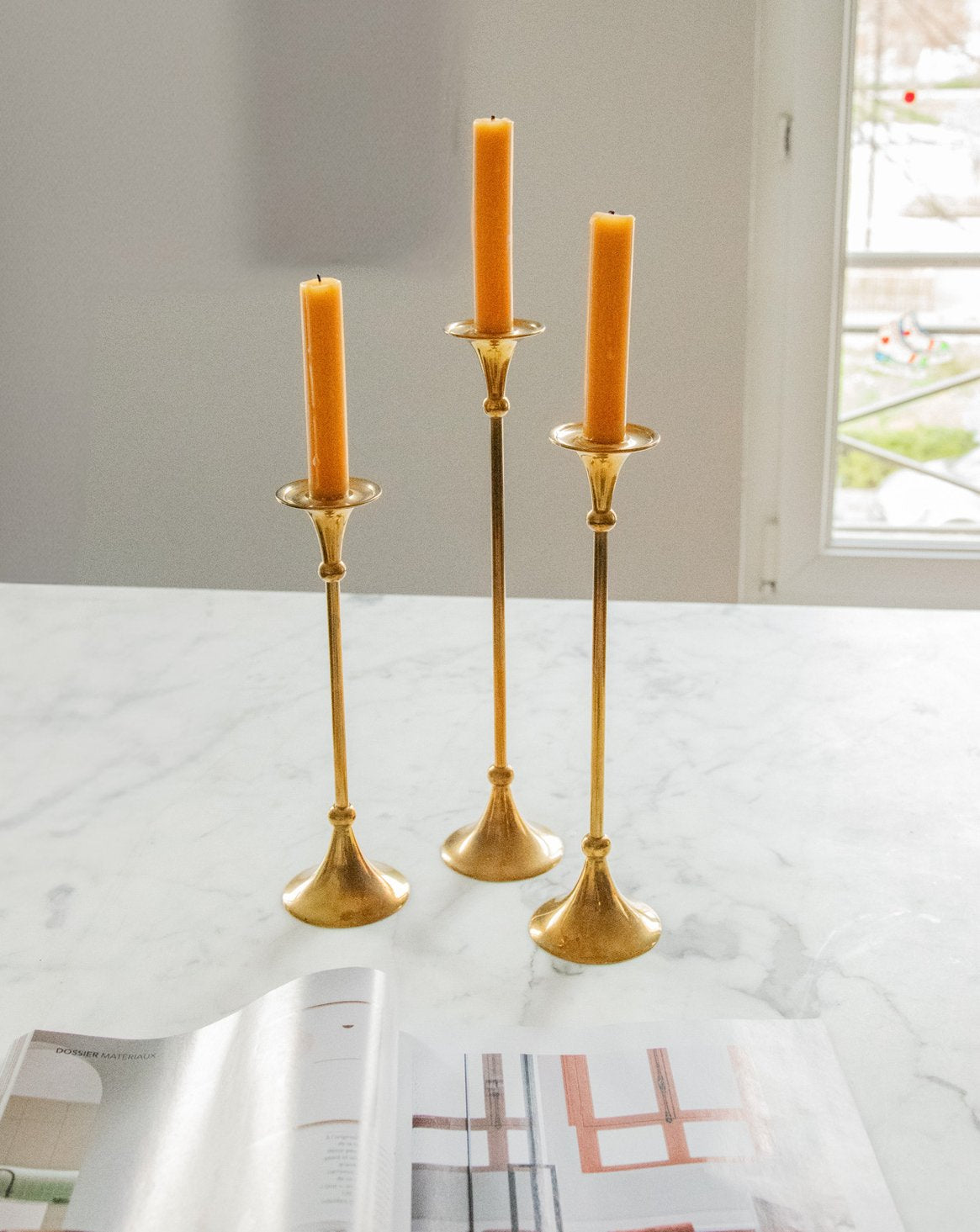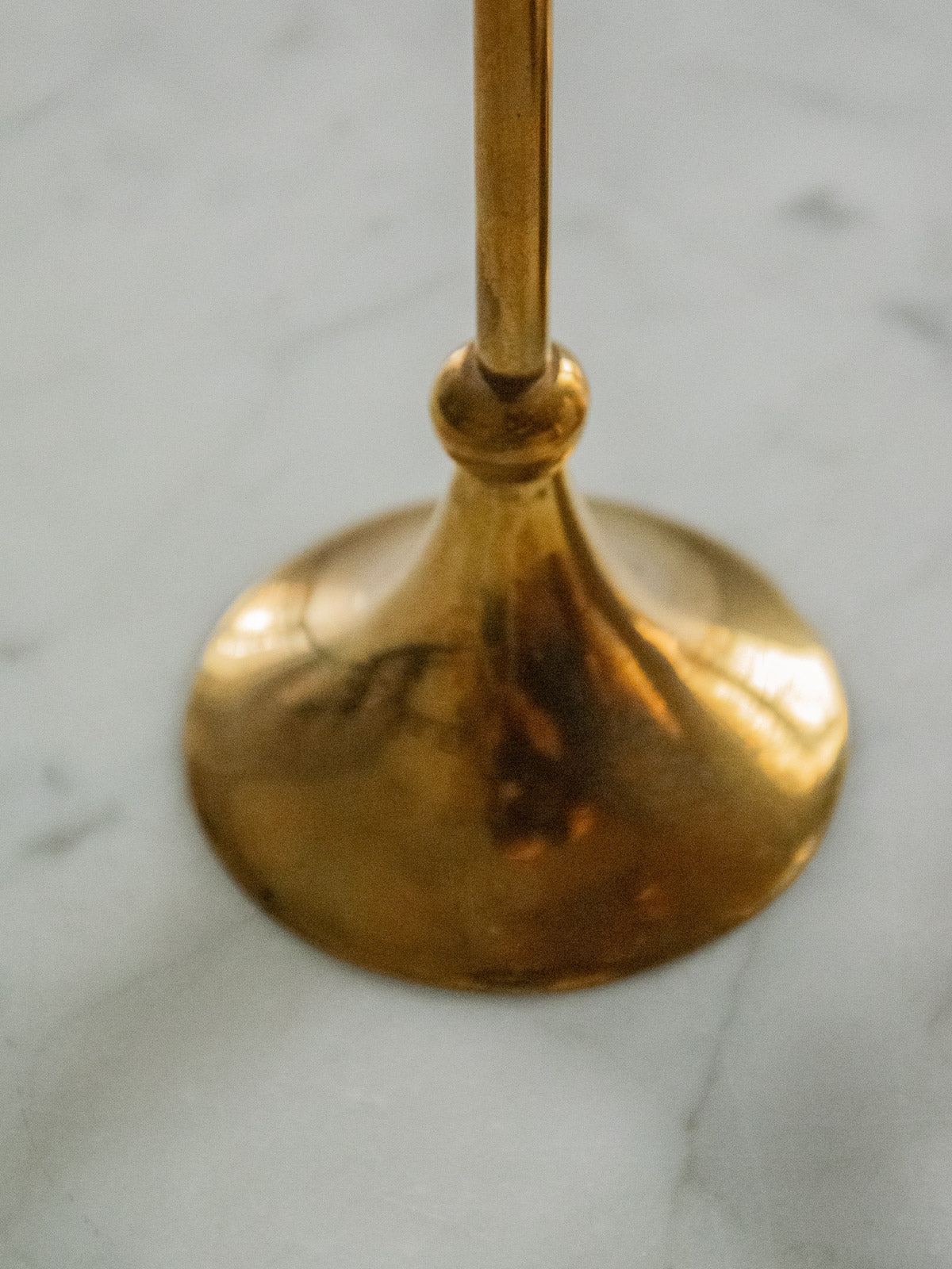 Découvrez cet ensemble de trois bougeoirs en laiton des années 1960, à la silhouette trompette très fine et socle rond qui leur confère stabilité et élégance. Le jeu de hauteurs dégressives souligne leurs proportions élancées et crée un rythme visuel parfait pour une table, une cheminée ou une console. En laiton chaleureux, ils diffusent une lumière tamisée et instaurent une ambiance intimiste et raffinée, idéale pour sublimer un intérieur aux accents vintage.