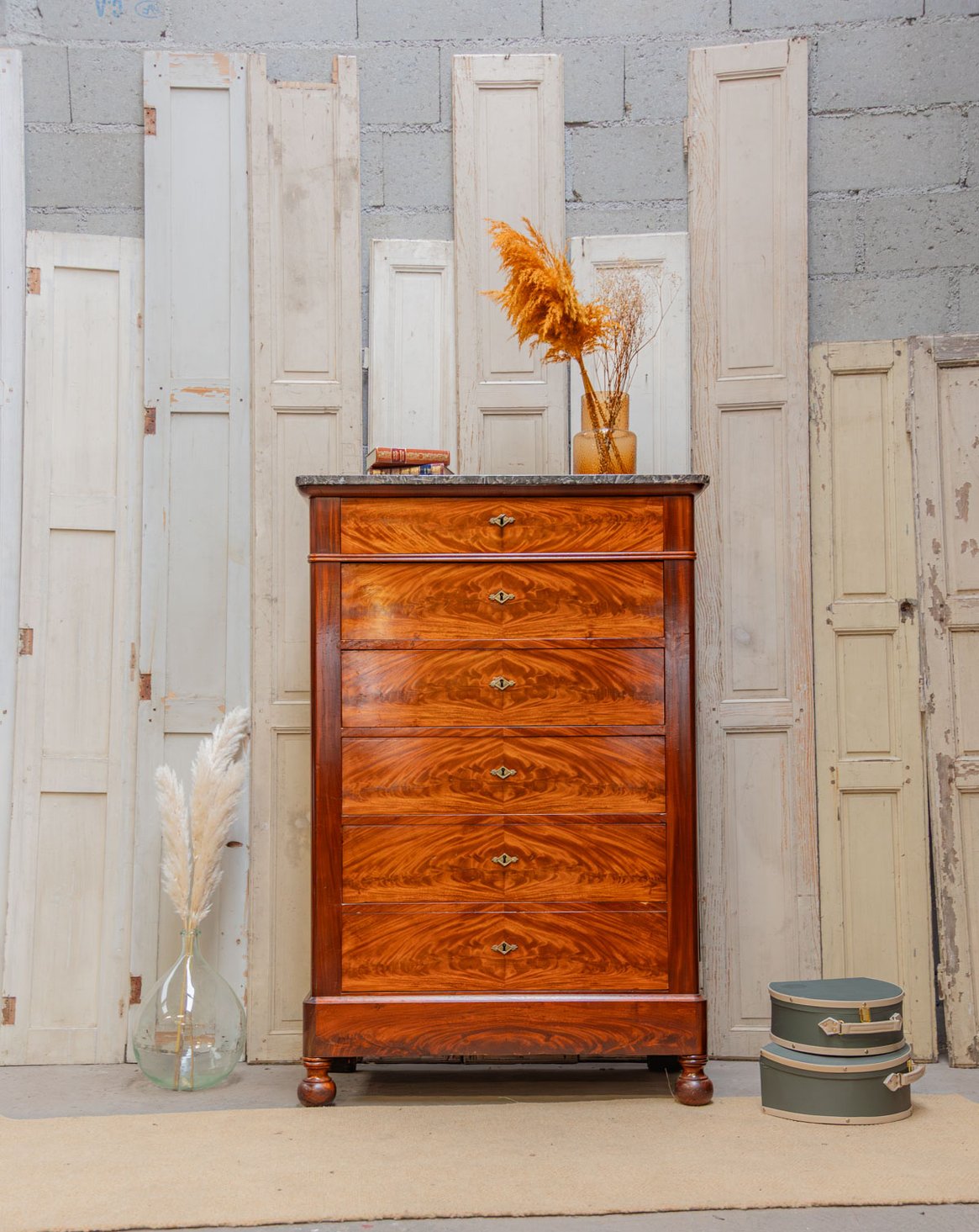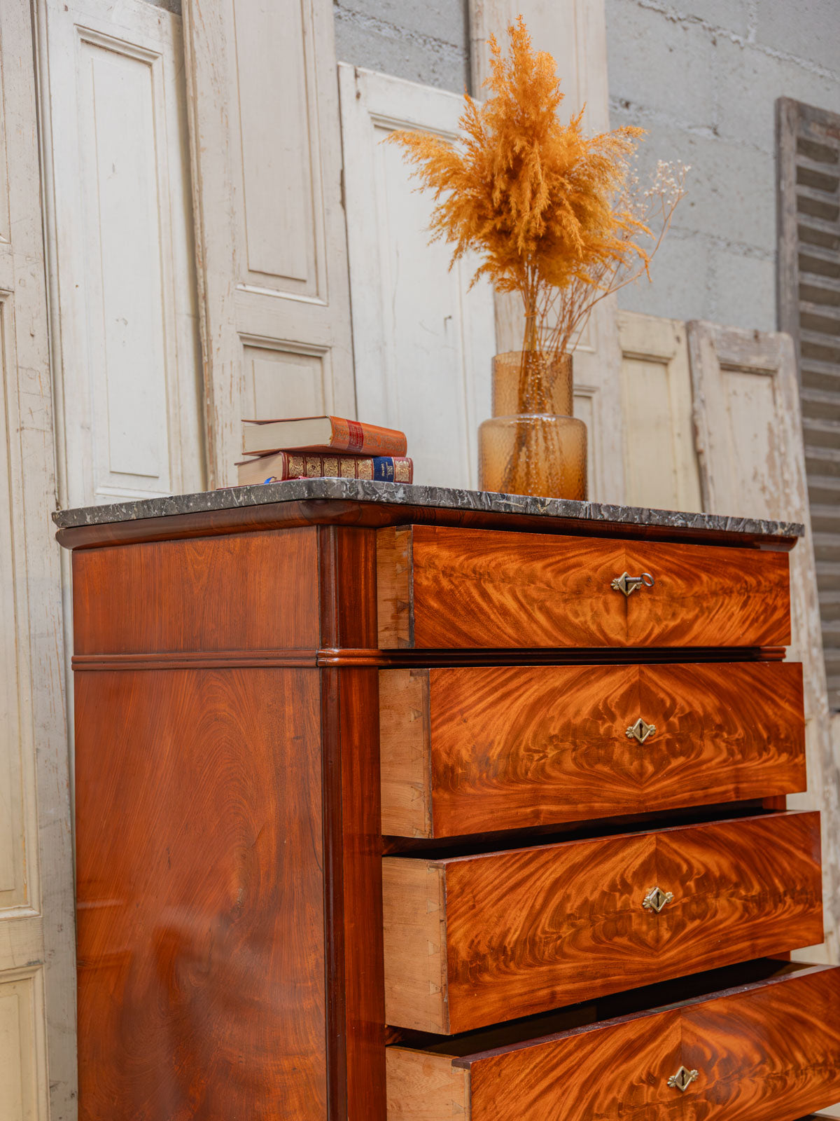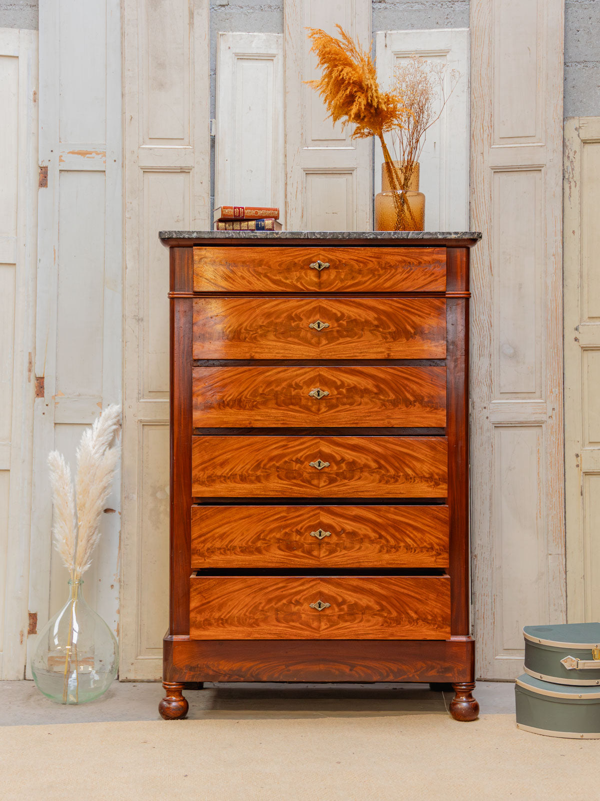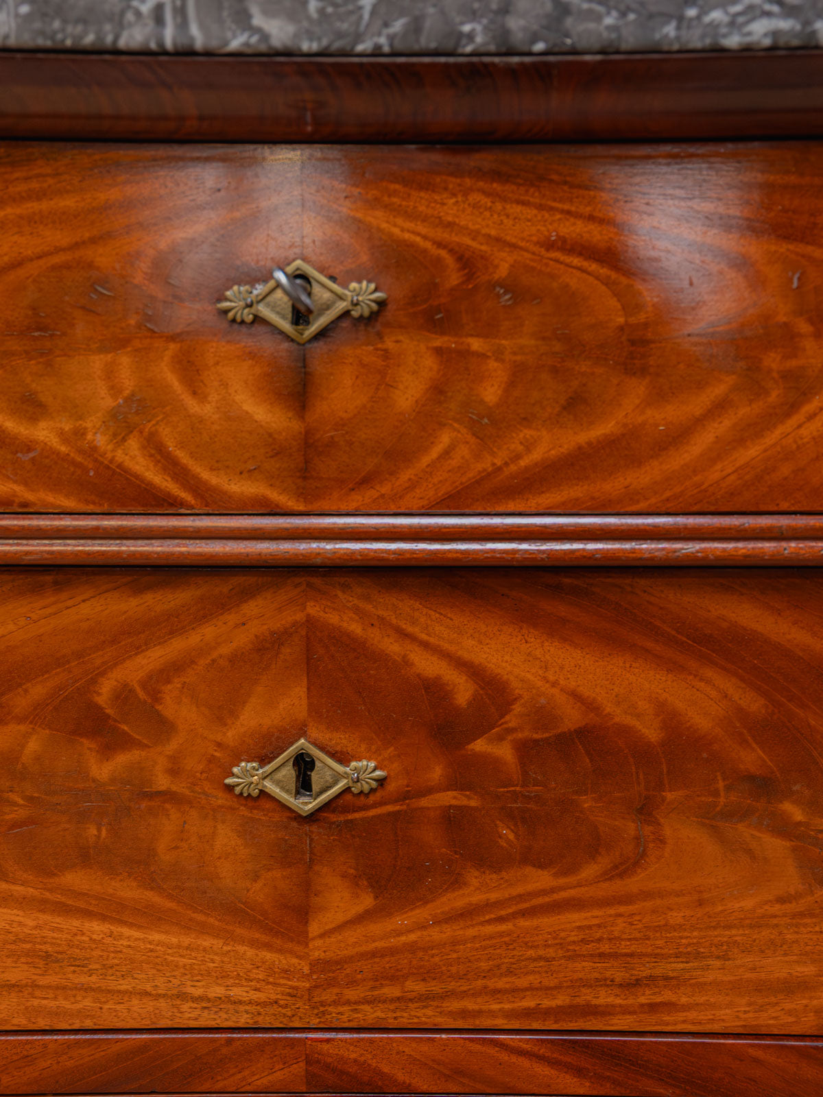 Elevate your interior with this mahogany and mahogany veneer chest of drawers, where classic lines meet understated elegance. Its six drawers, each lockable and operated by a single key, offer structured storage for linens and clothing, while the dark gray marble top provides a refined finish that contrasts with the brass handles and rounded legs. Both practical and decorative, this piece creates a warm and sophisticated atmosphere. The marble top has been discreetly restored, and there are minor signs of age.