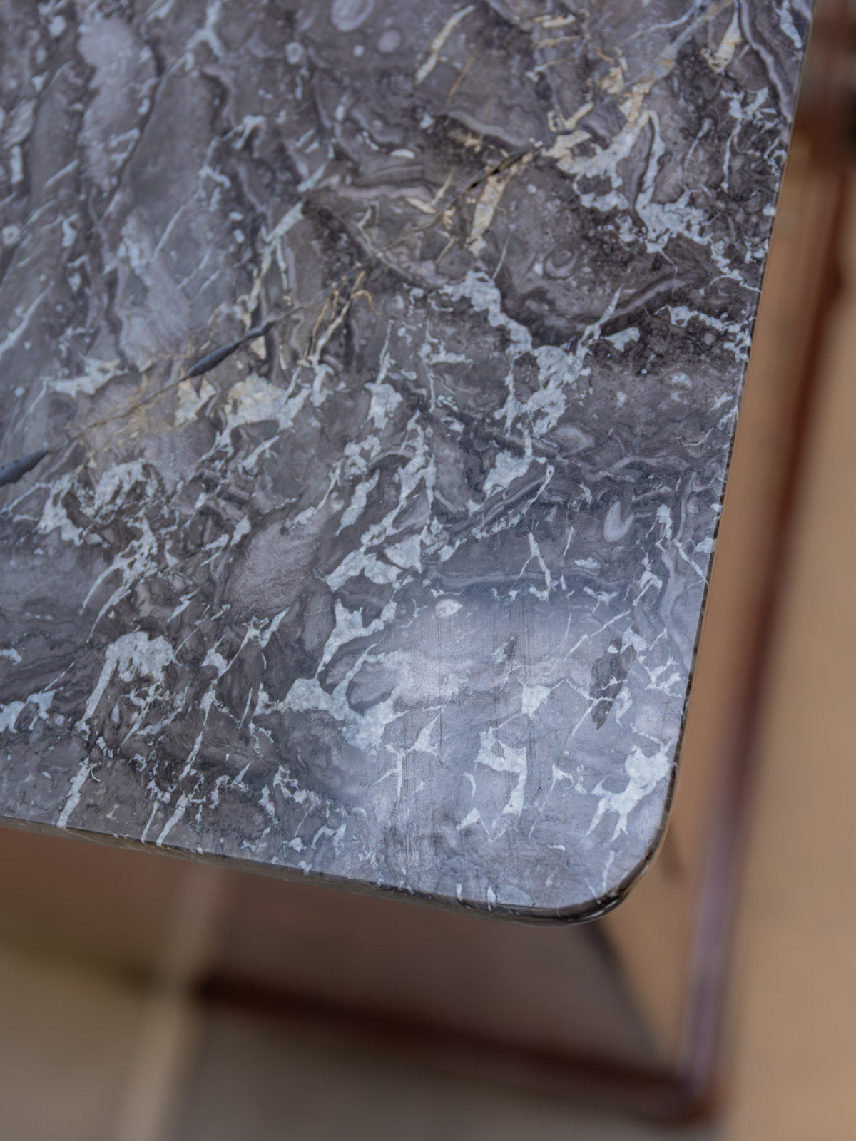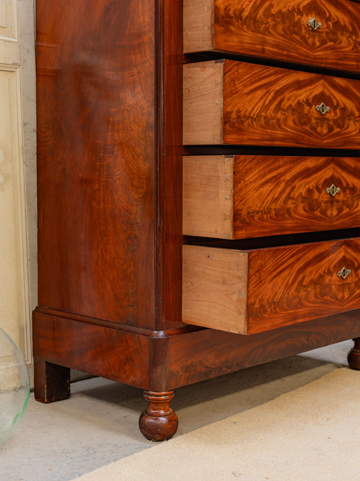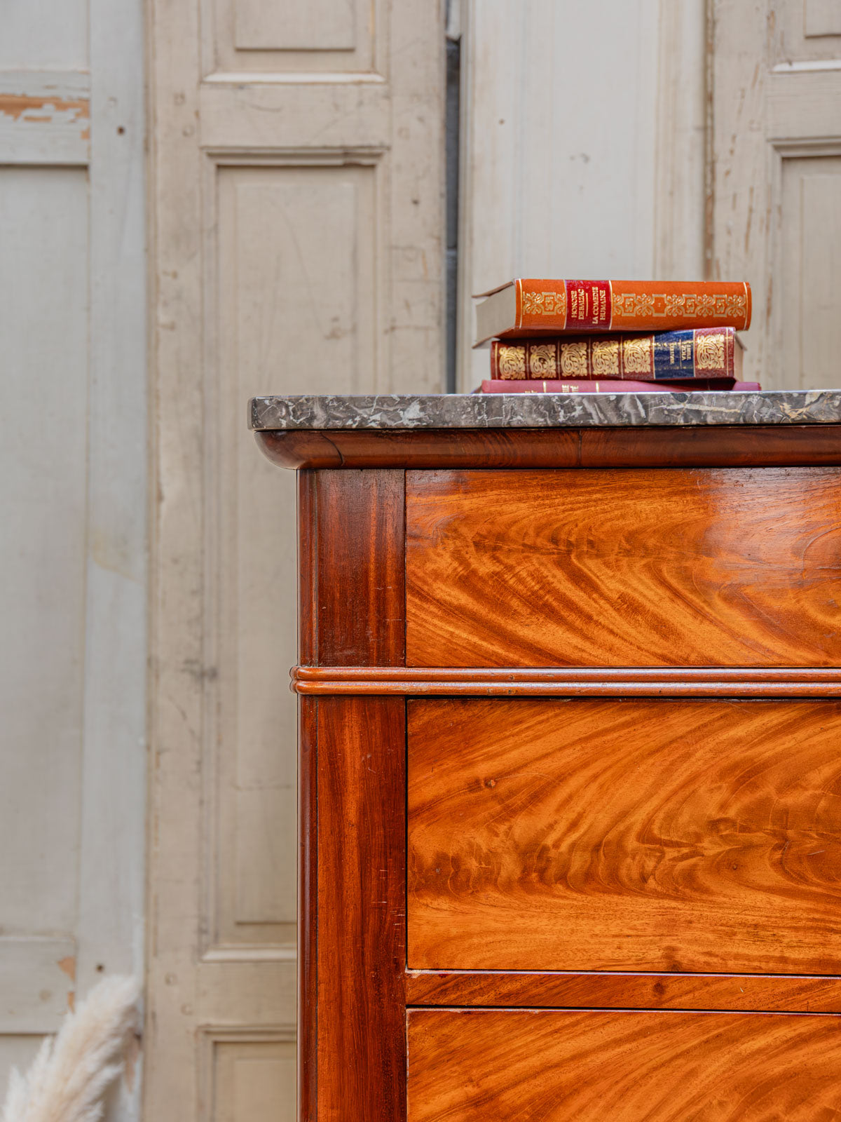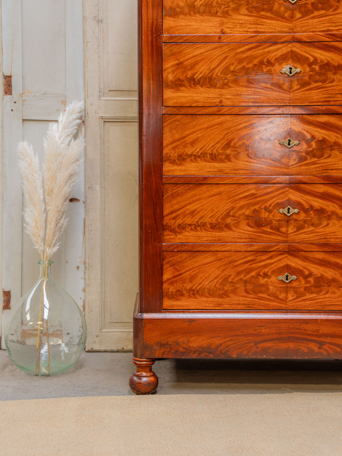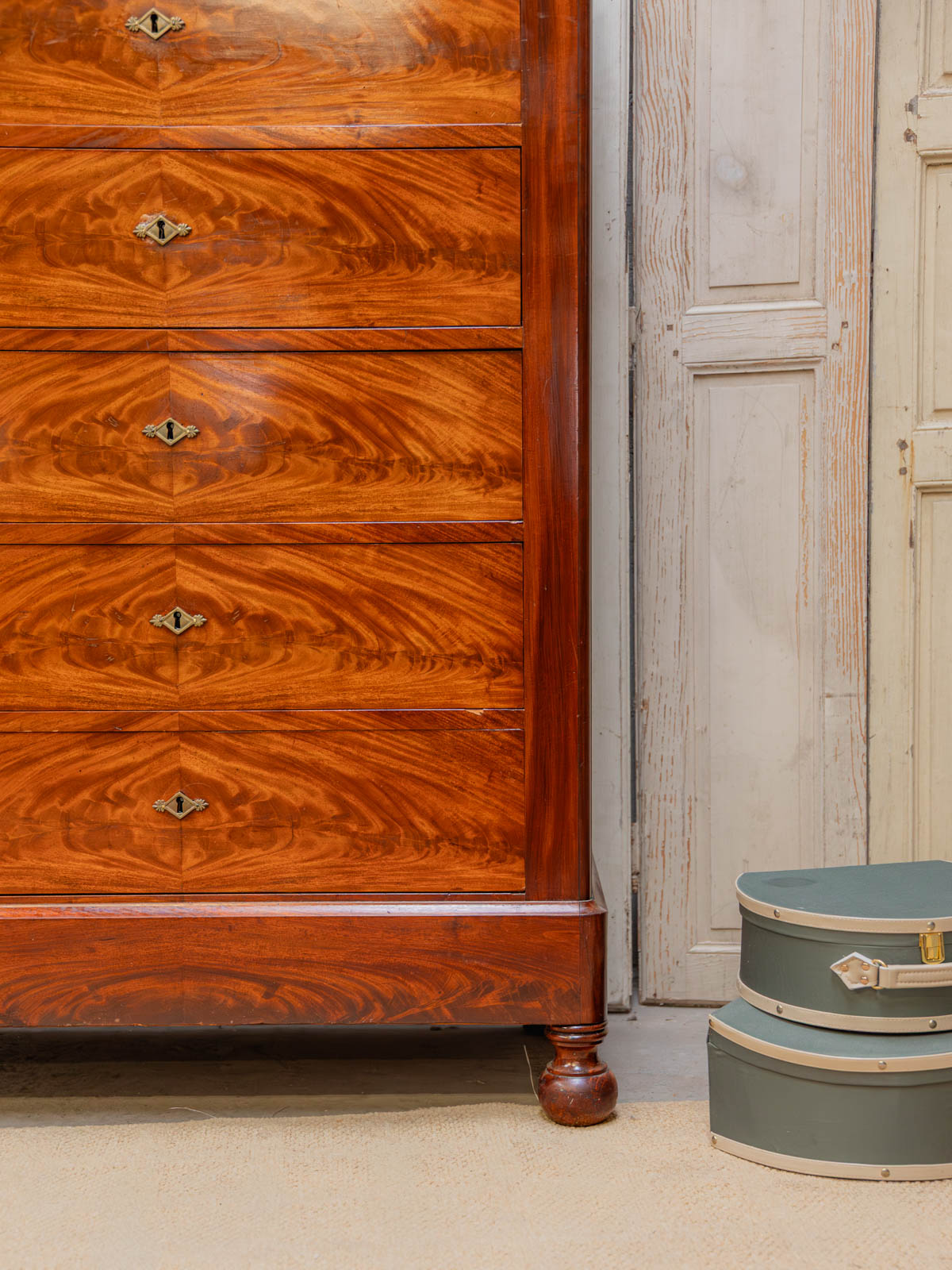 Elevate your interior with this mahogany and mahogany veneer chest of drawers, where classic lines meet understated elegance. Its six drawers, each lockable and operated by a single key, offer structured storage for linens and clothing, while the dark gray marble top provides a refined finish that contrasts with the brass handles and rounded legs. Both practical and decorative, this piece creates a warm and sophisticated atmosphere. The marble top has been discreetly restored, and there are minor signs of age.