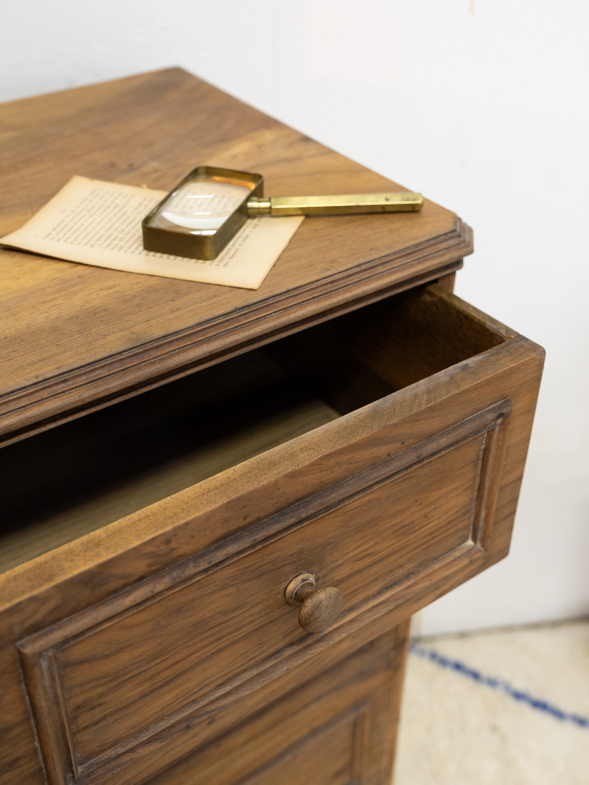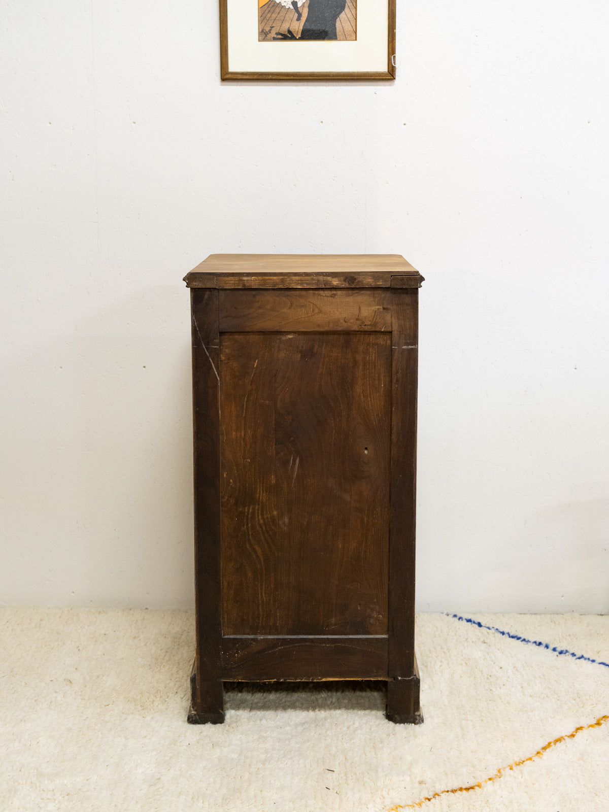 Embrace this walnut chest of drawers with its warm lines, where the wood grain highlights its undeniable elegance. Four drawers offer flexible storage, ideal for a bedroom, entryway, or for structuring a small space thanks to its balanced proportions. Its natural finish creates a soft and timeless atmosphere, blending understated modernity with workshop charm. A few signs of age tell its story.