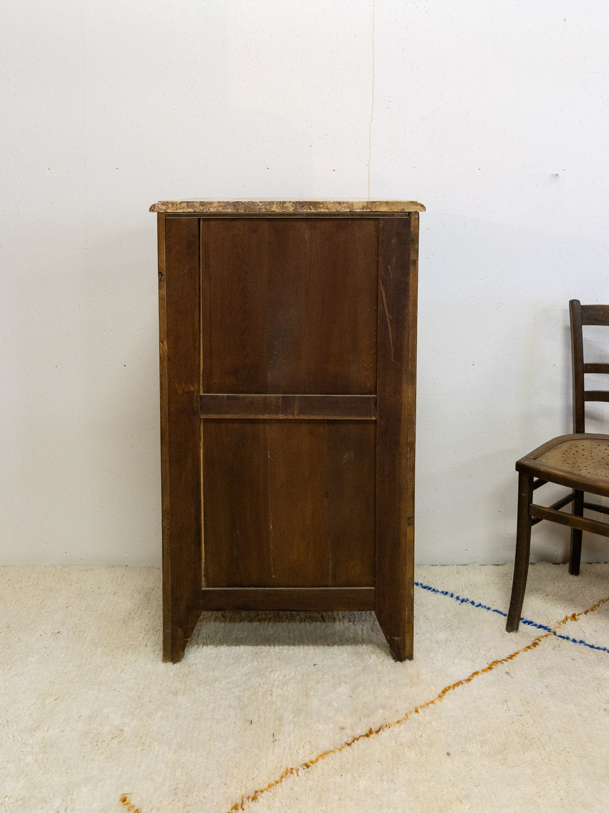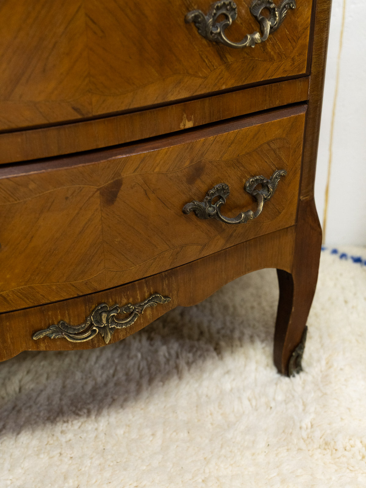 Embrace this Louis XV style wooden chest of drawers, enhanced with gilt metal handles and a beige marble top. Its six drawers offer practical storage for linens and accessories, ideal for a refined bedroom or an entryway seeking a touch of classic elegance. Its warm patina and sculpted lines tell a story of craftsmanship and refinement. A few signs of wear only add to its authenticity.