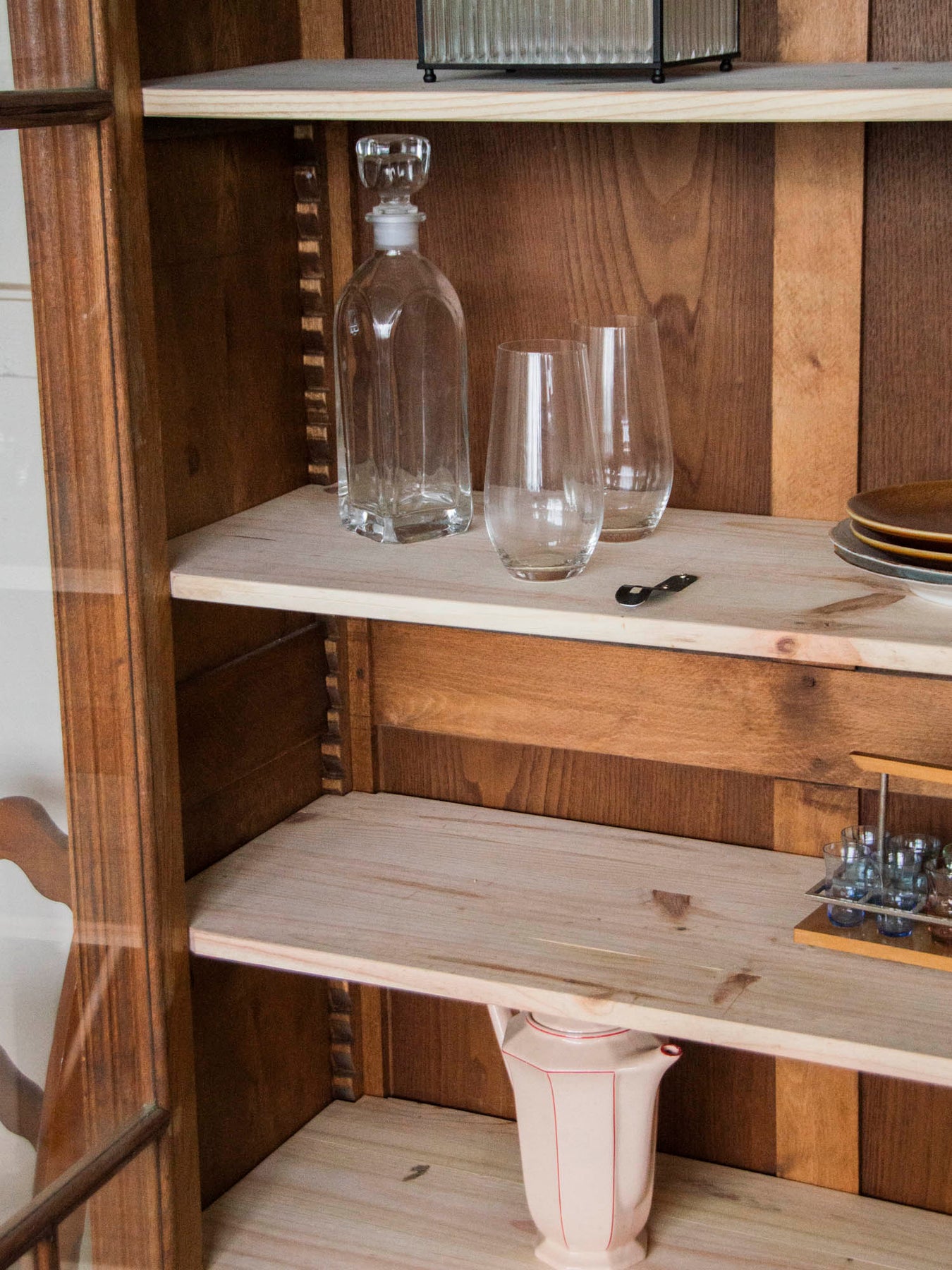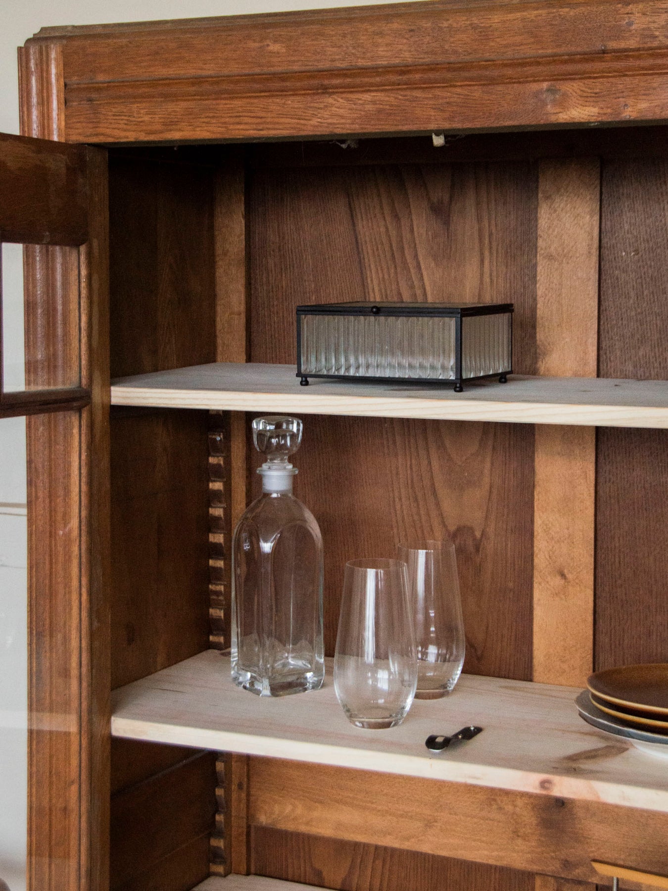 Discover this dark wood display cabinet with its vertical, compact profile, resting on delicately crafted feet that accentuate its character. The interior features modern, adjustable shelves in light wood, perfect for showcasing dishes, books, or decorative objects, while offering modularity to accommodate evolving collections. An elegant contrast between the dark facade and light-colored shelves, it fits equally well in a contemporary living room or a refined entryway, adding warmth and style without being overwhelming.