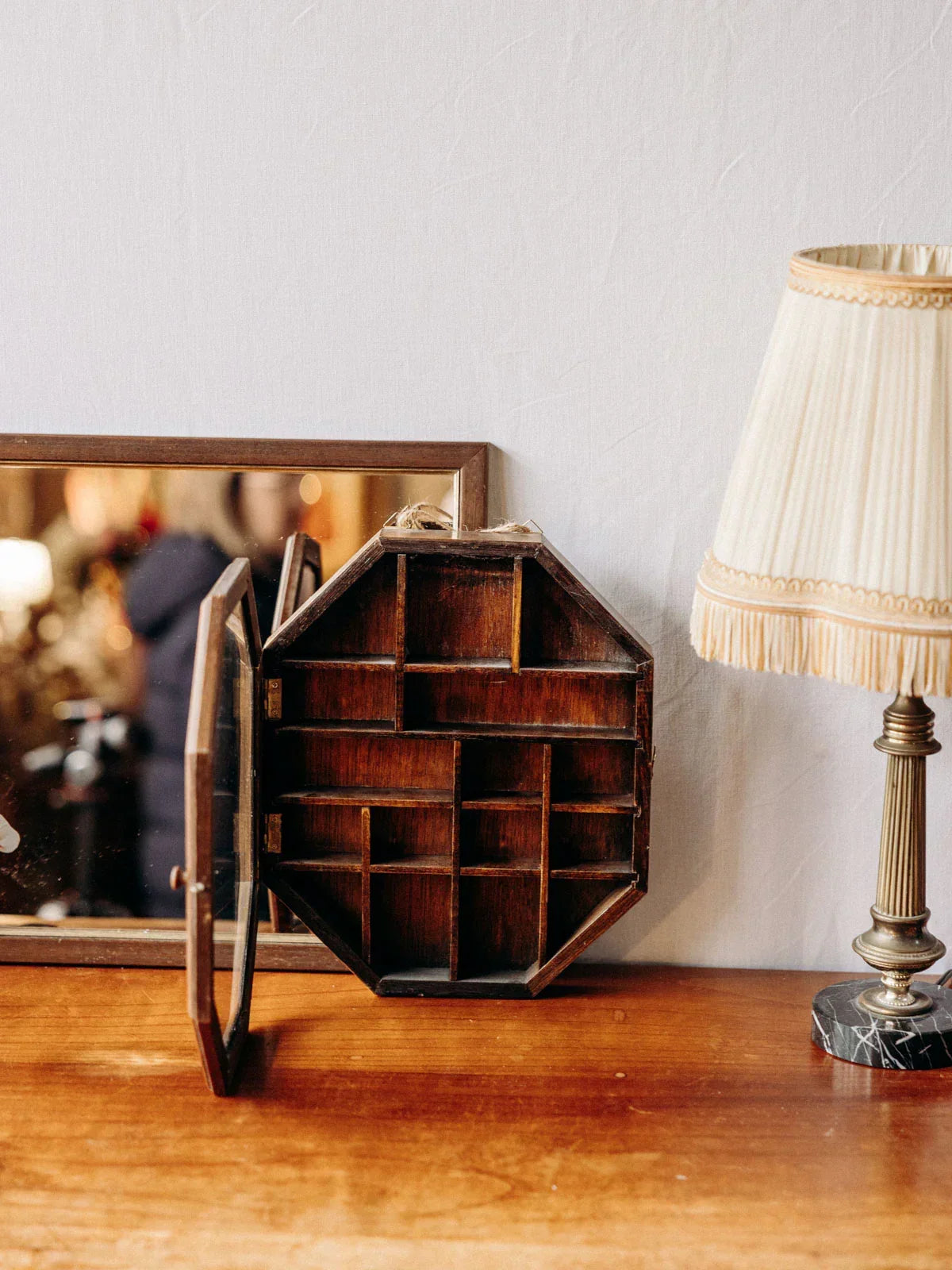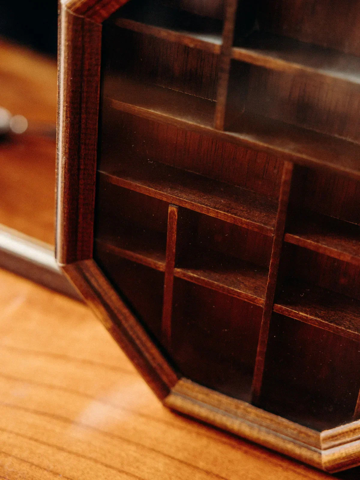 Add a touch of handcrafted elegance with this small, octagonal wooden display case. Its slim profile makes it ideal for showcasing your mementos or delicate collections. Suspended by its thin cord, it can also be placed on a console table using its wooden handle, creating a simple yet refined display. Its shallow depth makes it perfect for maps, miniatures, or dried herbs, adding warmth and character to a wall or cozy corner.