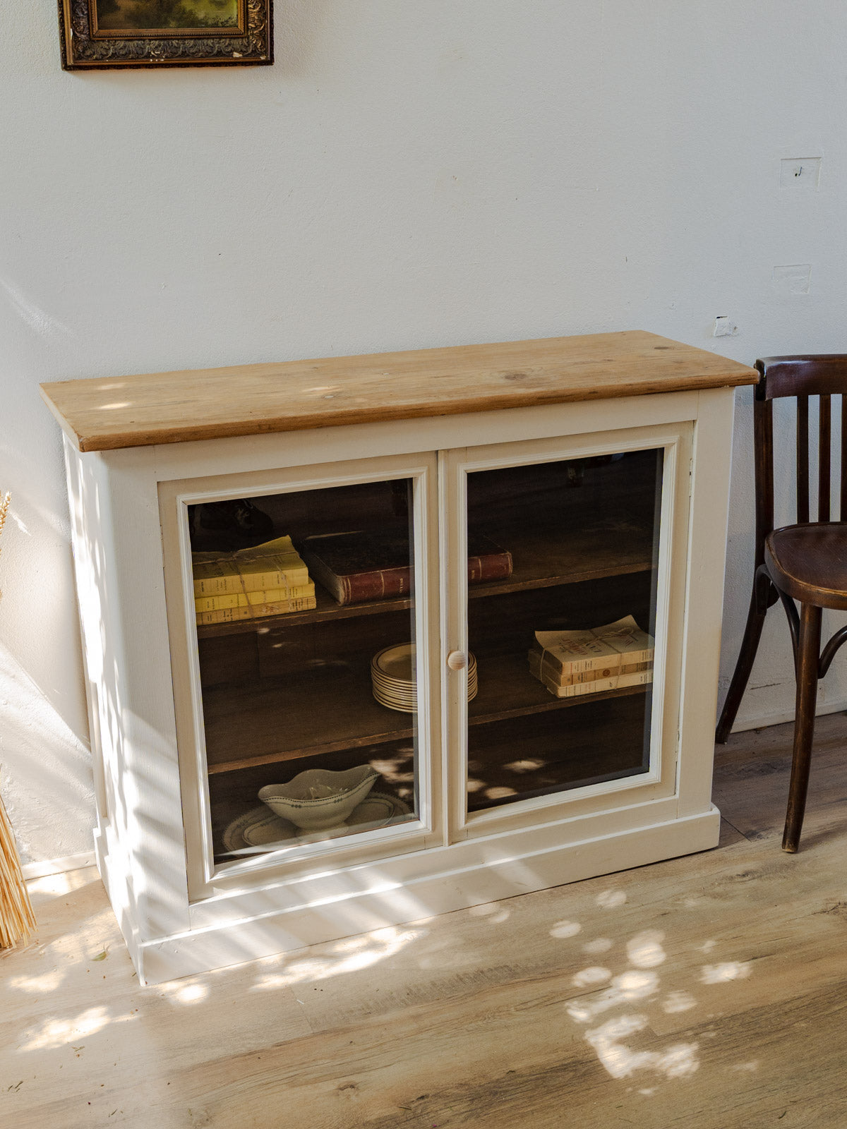 Enhance your interior with this display cabinet featuring a light wood top and an off-white painted structure, blending luminous elegance with contemporary simplicity. Its two shelves and dark wood interior create a warm contrast and offer a versatile space to display crockery, books, or decorative items, all while maintaining balanced proportions suitable for an entryway or living room. The glass protects your items without visually weighing down the silhouette. Some signs of age are present.