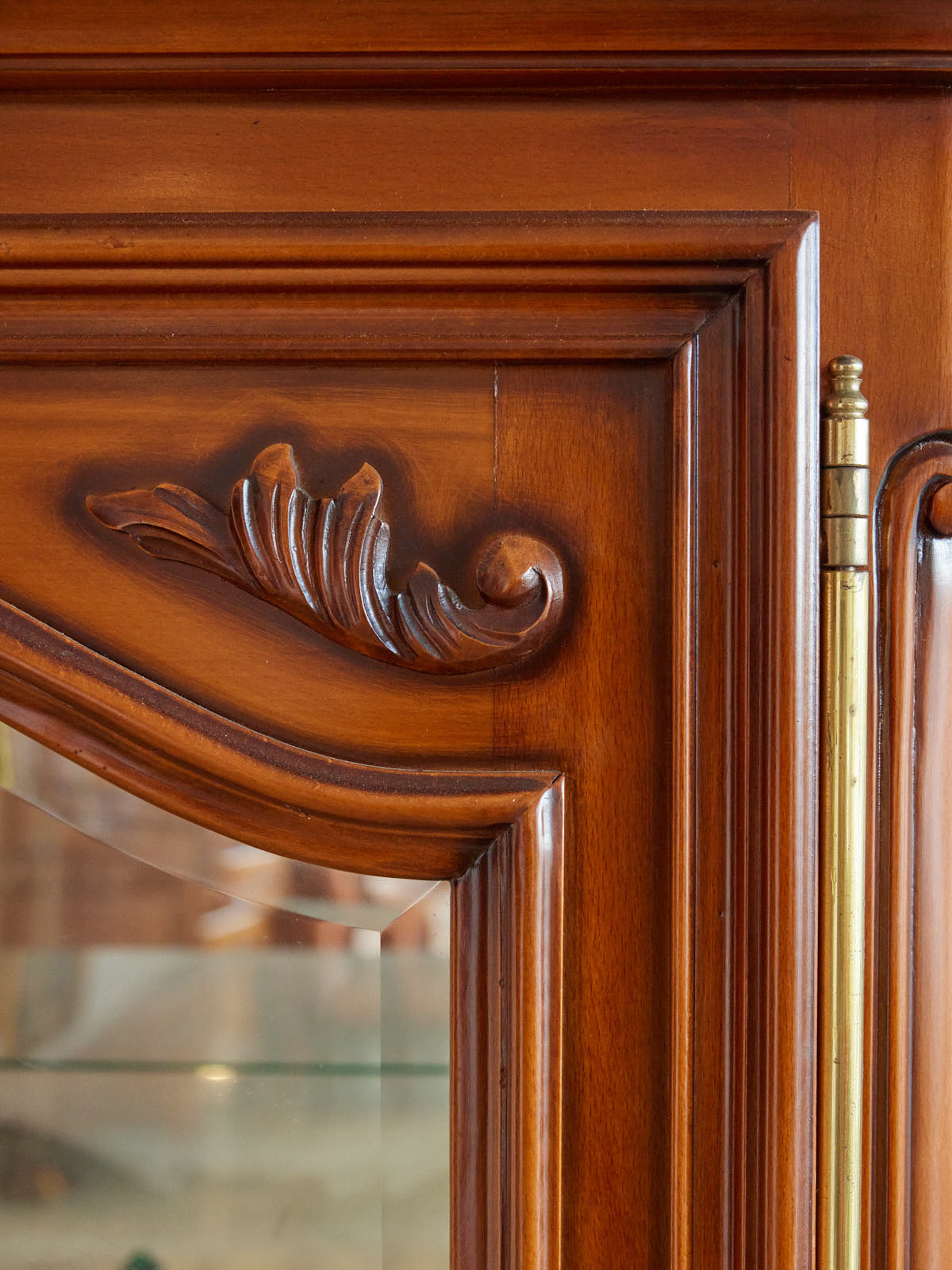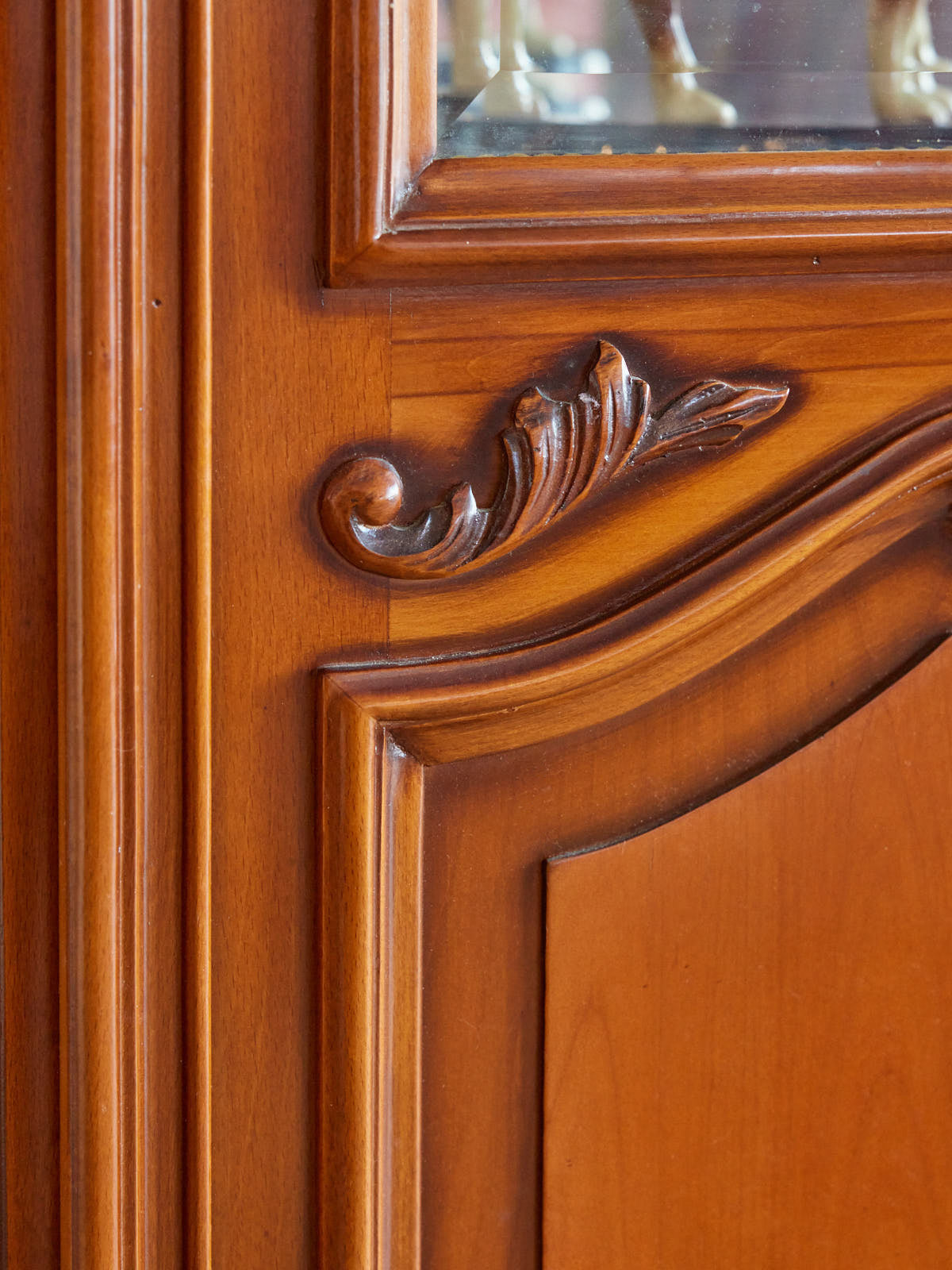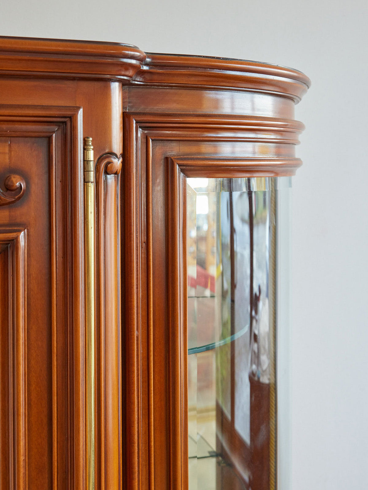 Elevate your interior with this unique curved glass display cabinet. Exceptional craftsmanship is evident in the beveled edges of the glass and the sculptural detail of the wood. The upper section, fitted with glass shelves, elegantly displays tableware and decorative objects, while the spacious lower section offers discreet storage for everyday items. Its combination of materials and refined lines creates a bright and inviting atmosphere, perfect for the dining room or entryway. Two units are available, sold individually.