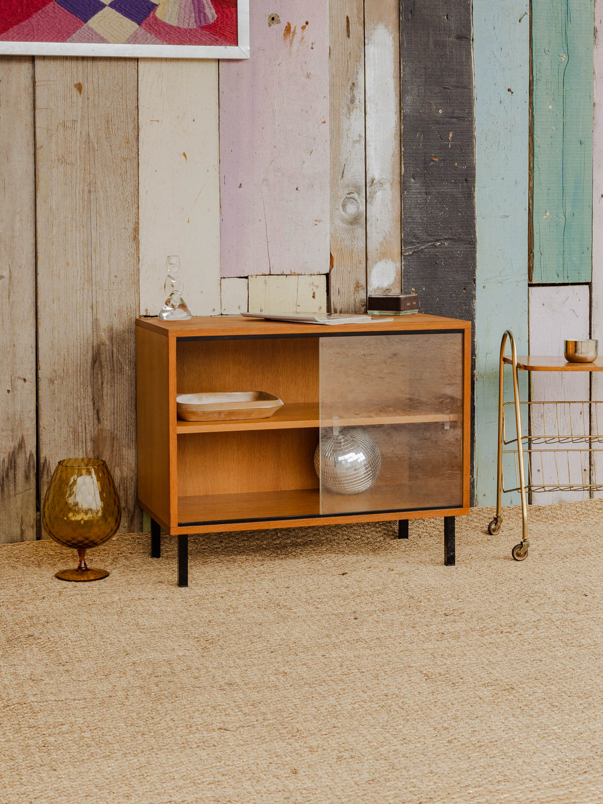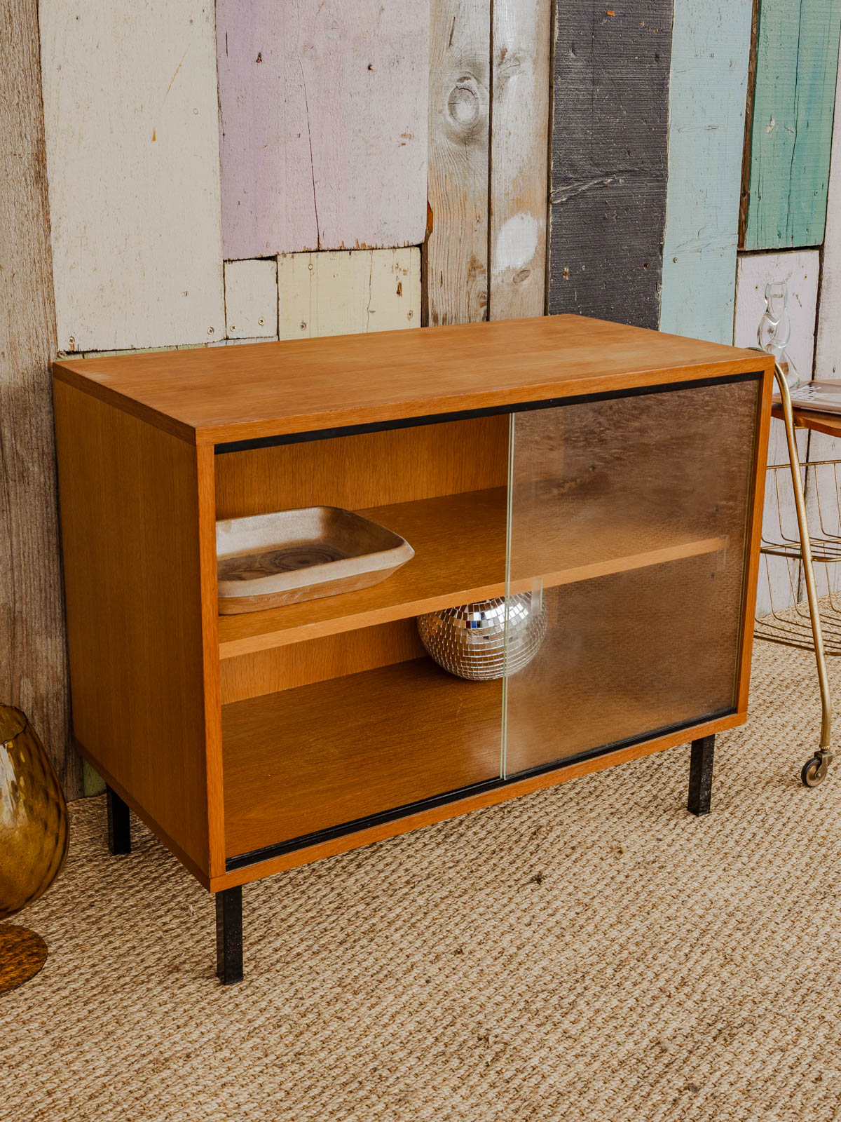 Adoptez cette vitrine en bois clair aux lignes délicates et à l'allure lumineuse, rehaussé de portes coulissantes vitrées qui laissent entrevoir son contenu. Sa configuration simple avec une étagère intérieure optimise le rangement pour vaisselle, livres ou accessoires, tandis que ses proportions compactes conviennent à une salle à manger ou une entrée modernes. Les pieds en métal noir apportent une touche graphique et contrastée, pour une ambiance contemporaine et épurée. Quelques traces d'usures présentes.