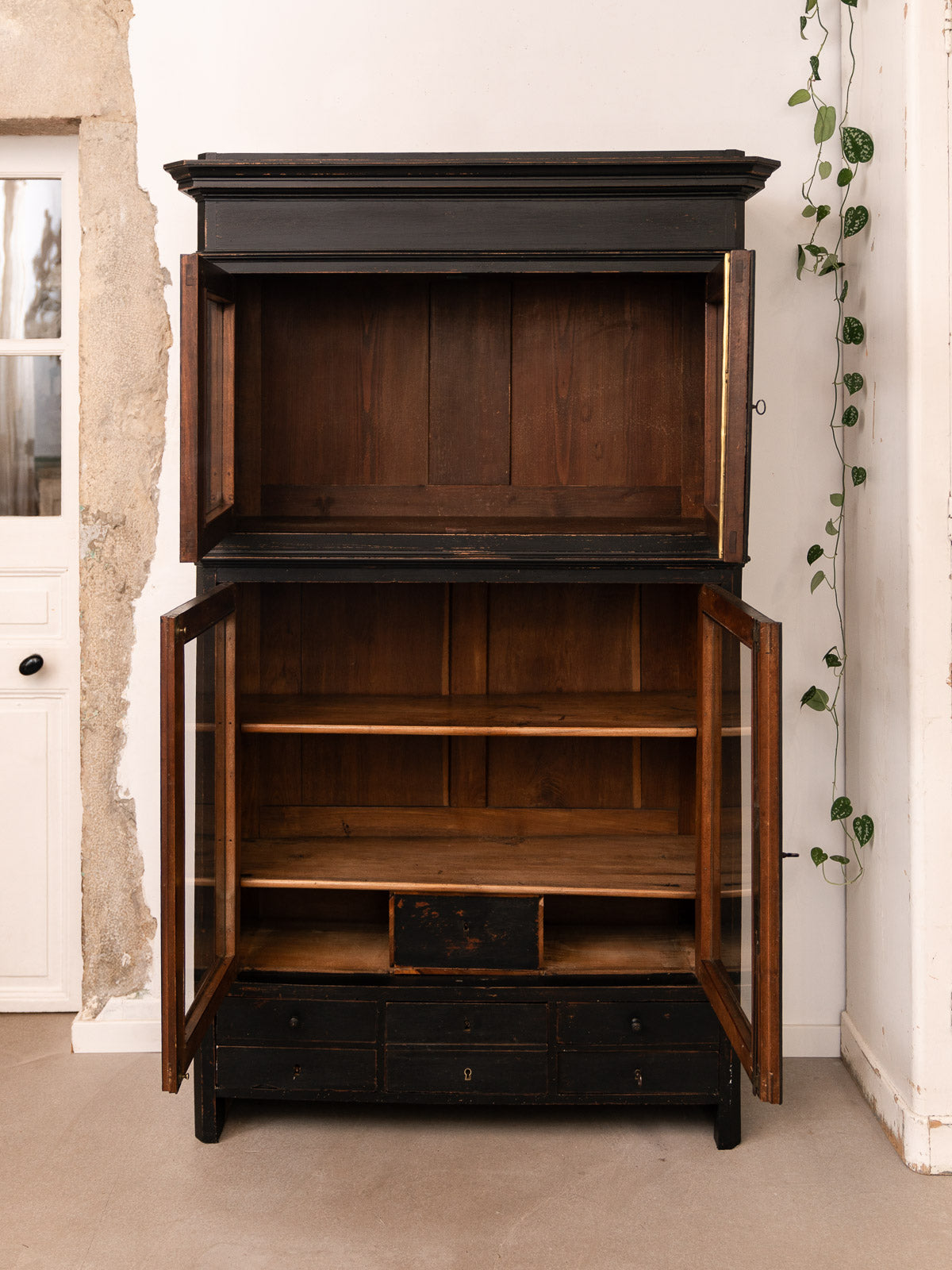 Discover this black sanded wood display cabinet with its elegant vertical profile and dark wood interior, creating a warm contrast. The open upper section is perfect for displaying decorative objects or tableware, while the lower section offers two shelves, two niches, and five drawers adorned with vintage labels for organized and characterful storage. Ideal for an entryway or living room with a simple yet sophisticated style. Some signs of age are present.