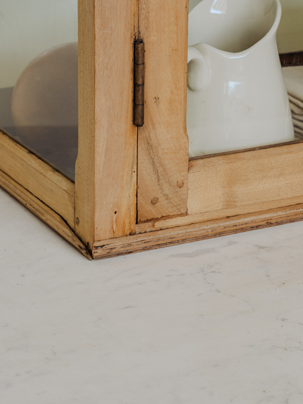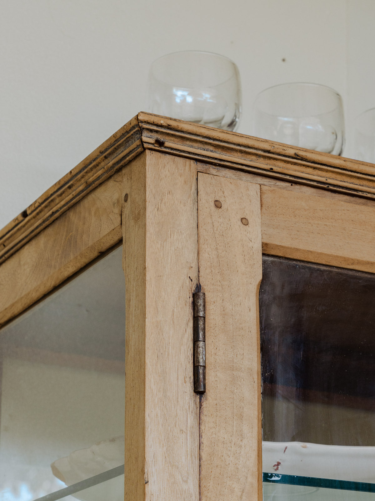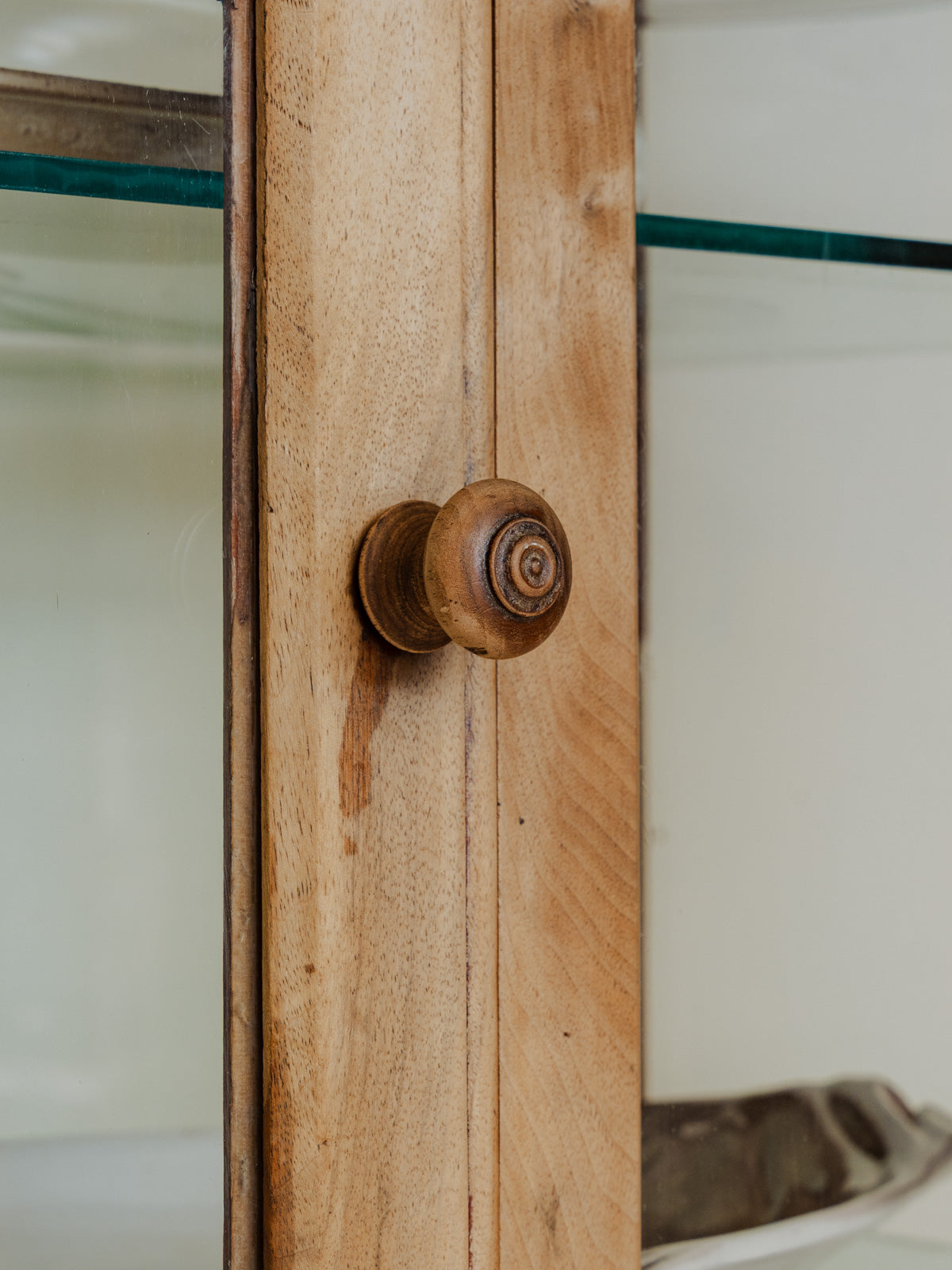 Enhance your interior with this display cabinet in light walnut, its warm grain and original wooden handle lending it authentic elegance. Its lockable closure and three adjustable glass shelves beautifully showcase dishes and decorative objects, while its proportions make it equally suitable for a living room or entryway. A few signs of wear only add to its charm.