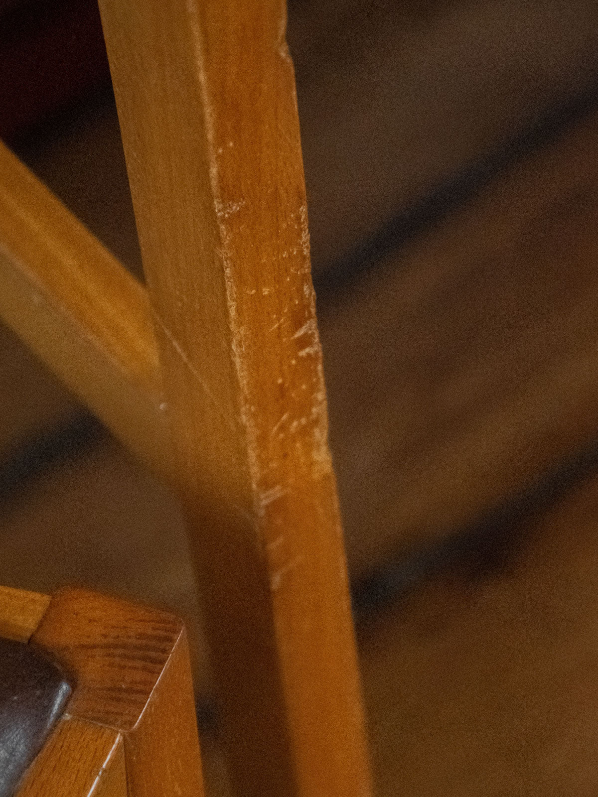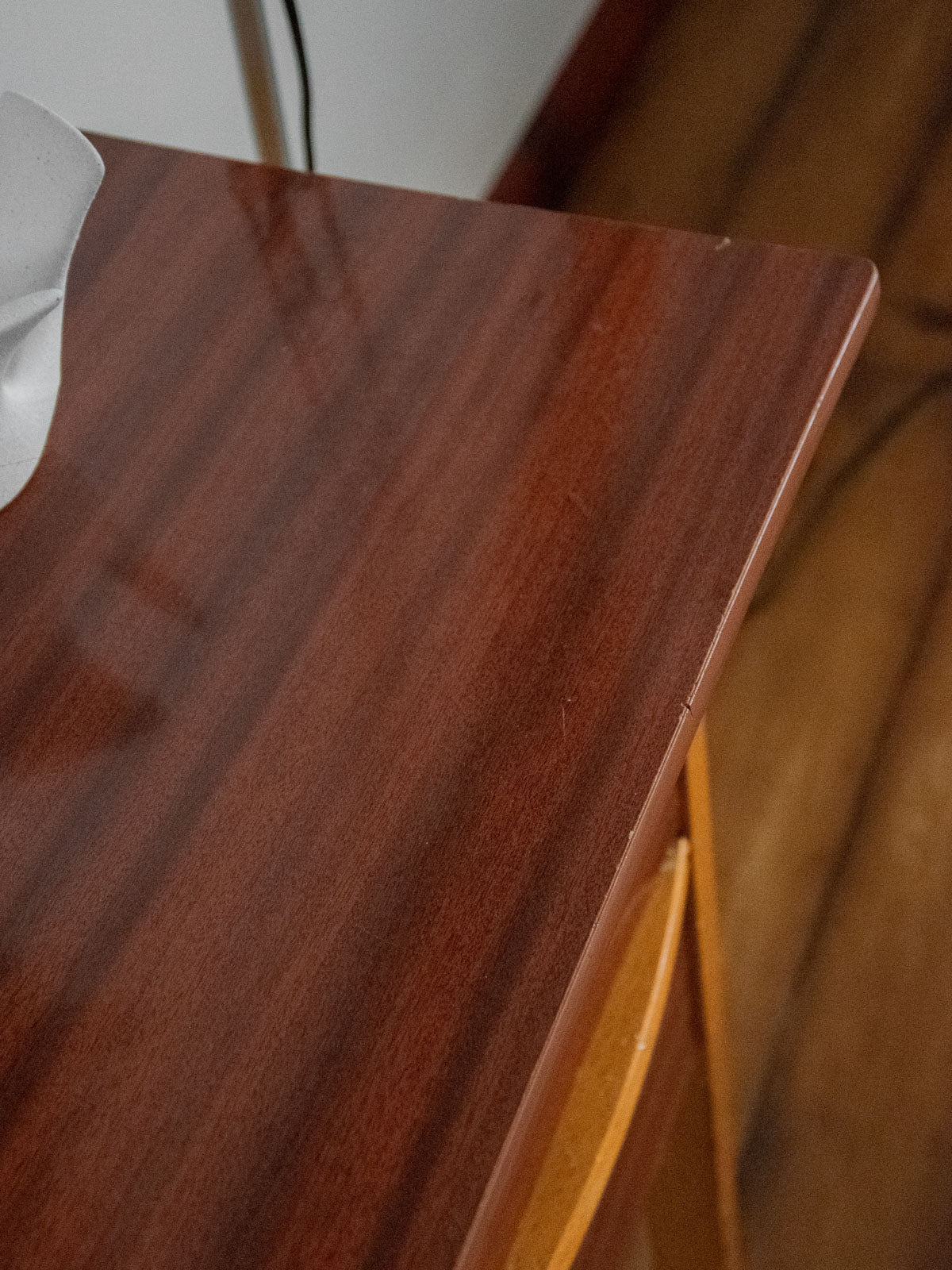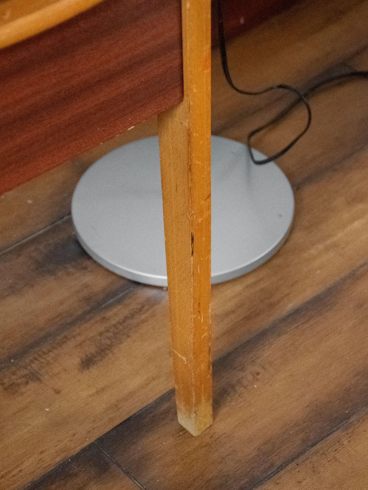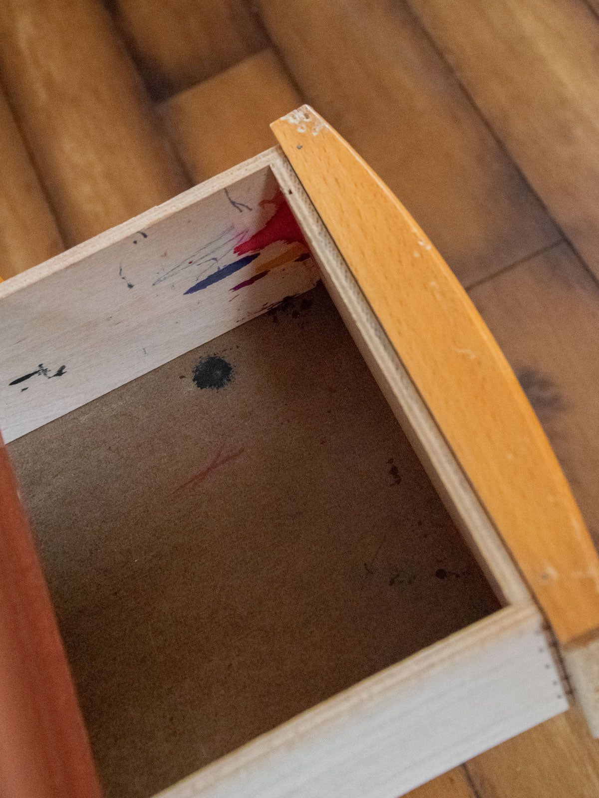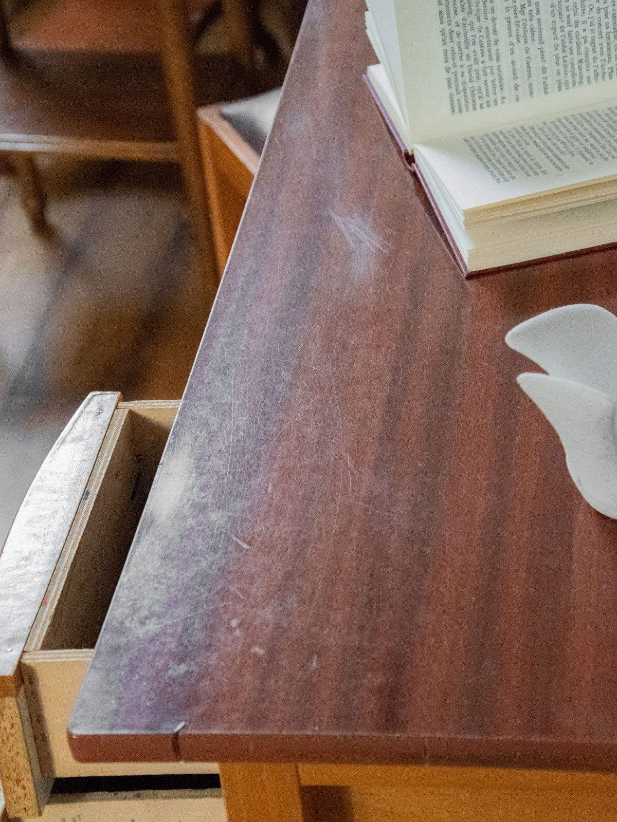 Choose this compact desk with its functional lines, featuring three Formica drawers and a durable Formica top enhanced with light wood handles that add warmth and contrast. Ideal for a home office or entryway, it offers discreet storage and proportions designed to optimize a small space without overwhelming the room. Its patina and materials give it a retro and practical look. Signs of wear are present, including a saw mark on the top and a few scratches, as well as ink stains in one drawer.