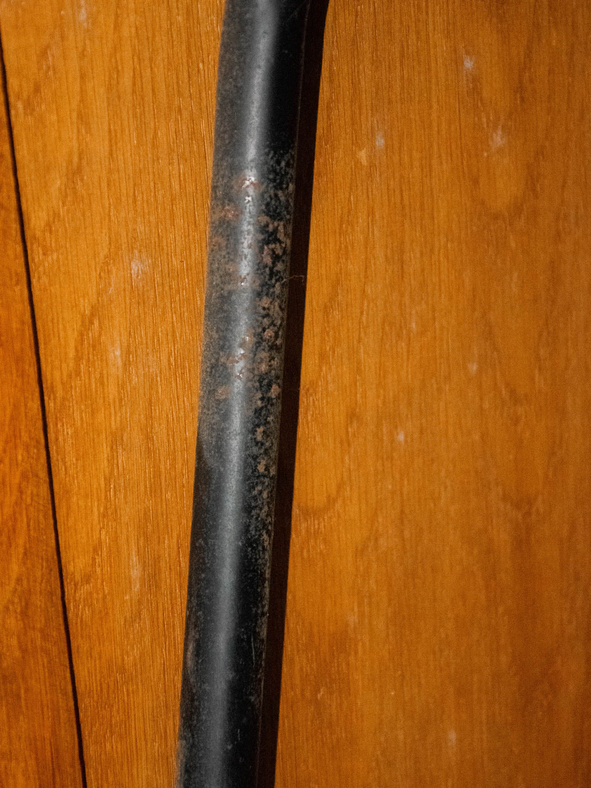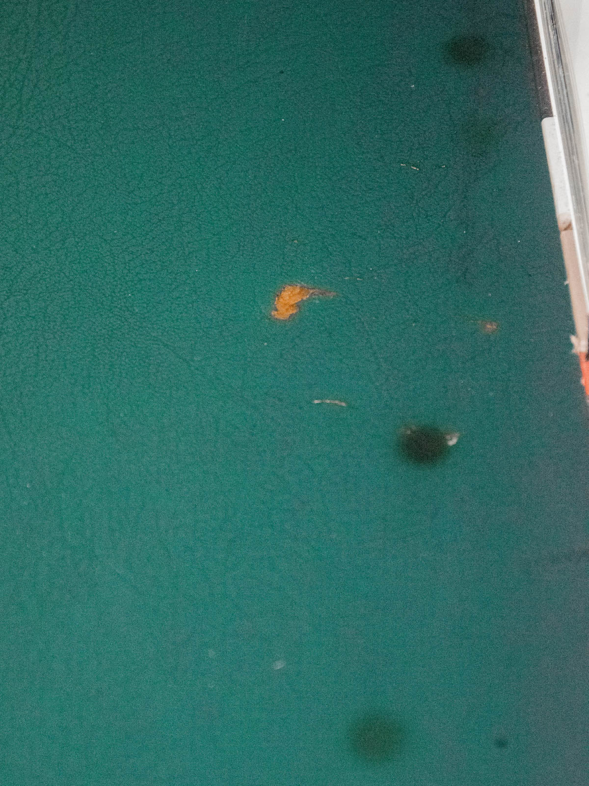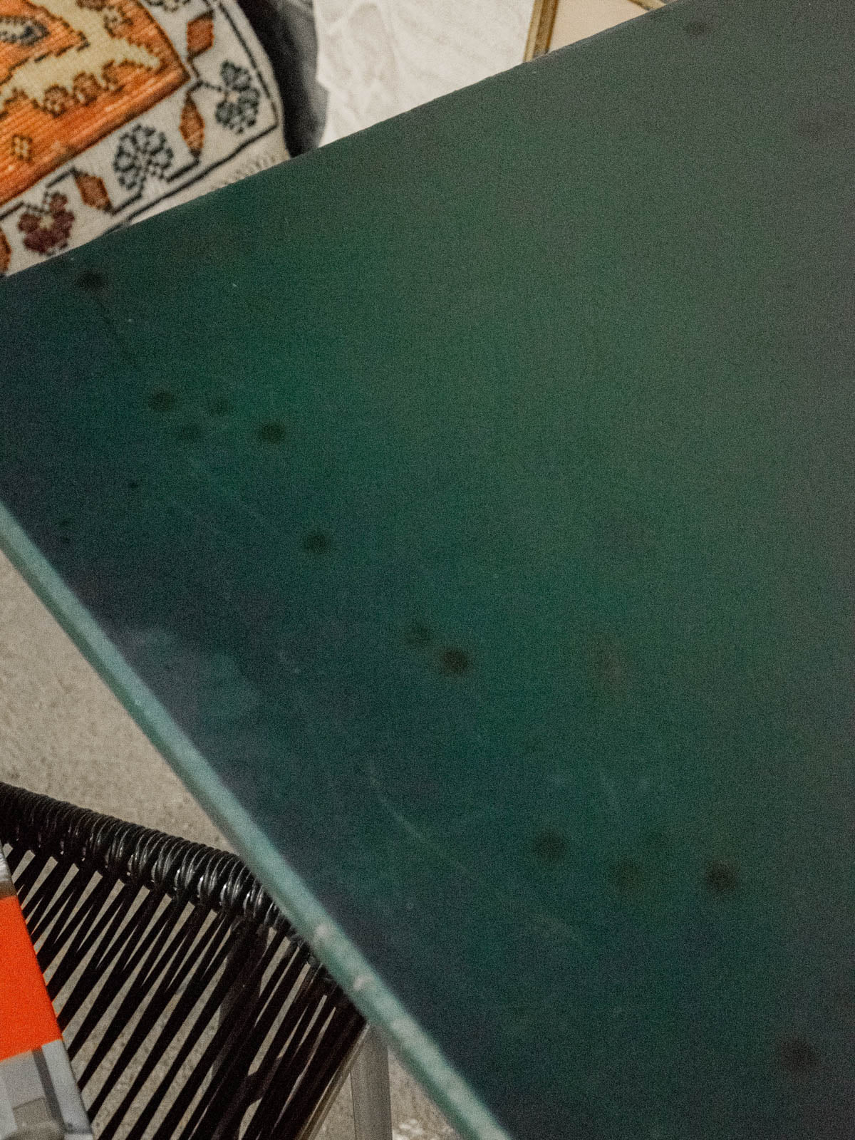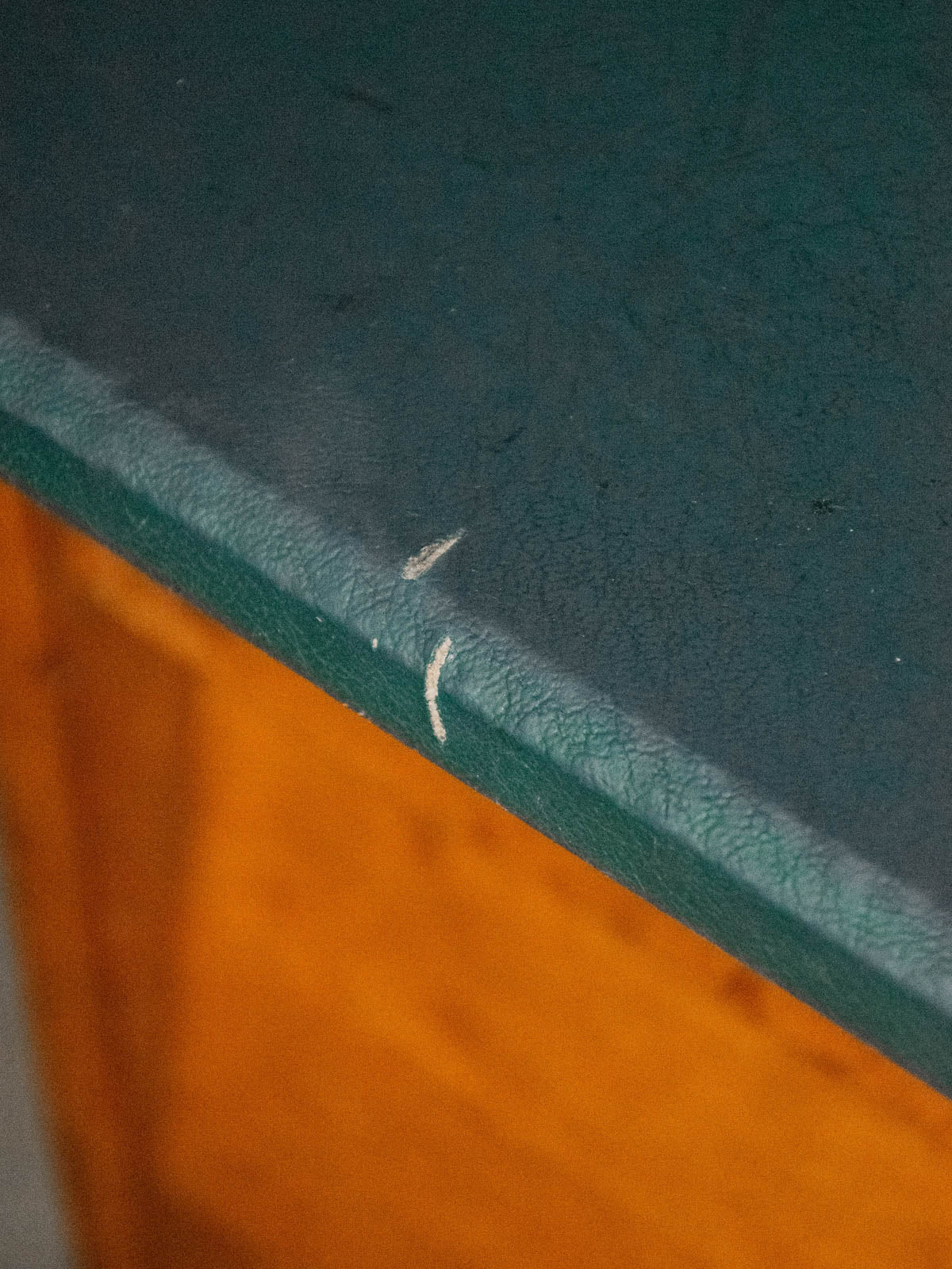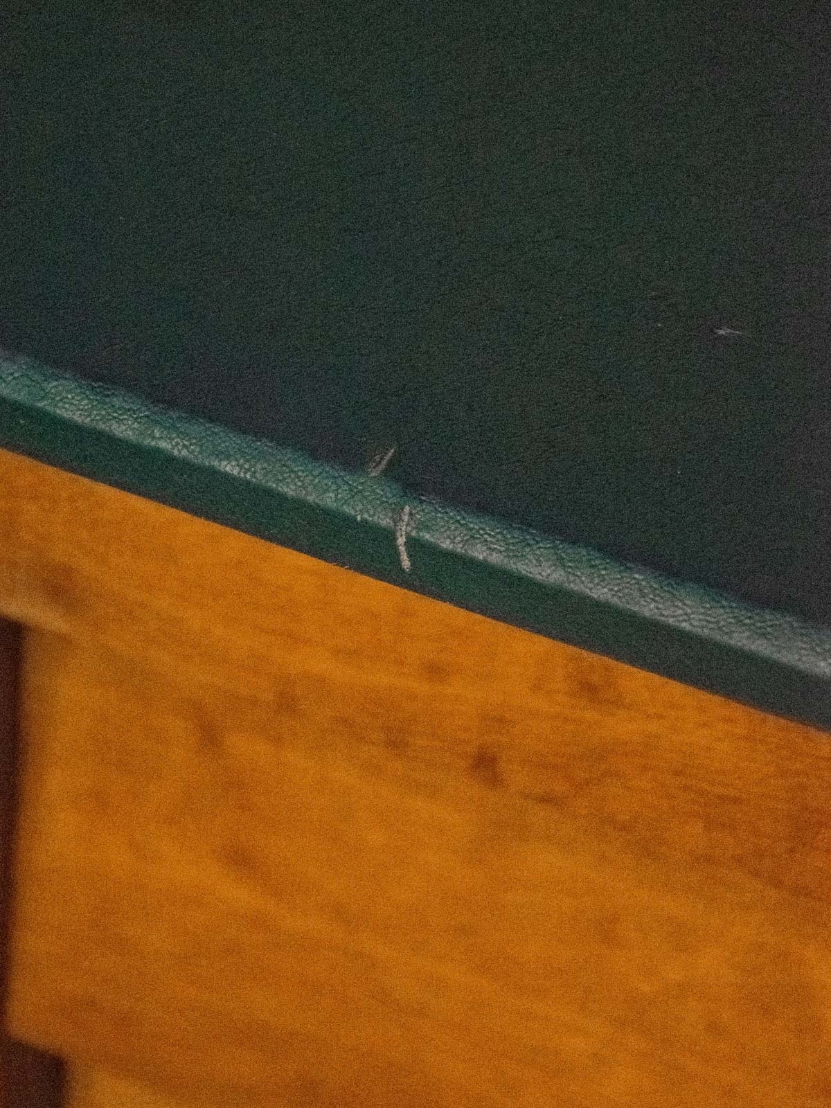 Choose this desk with its green vinyl-covered wooden top, which brings a graphic and warm touch to any workspace. Its two black iron legs accentuate a slightly industrial silhouette, while the three oak veneer drawers offer discreet and well-proportioned storage for everyday essentials. Ideal as a secondary desk or creative corner, it creates a welcoming retro-modern atmosphere. Signs of age are present.