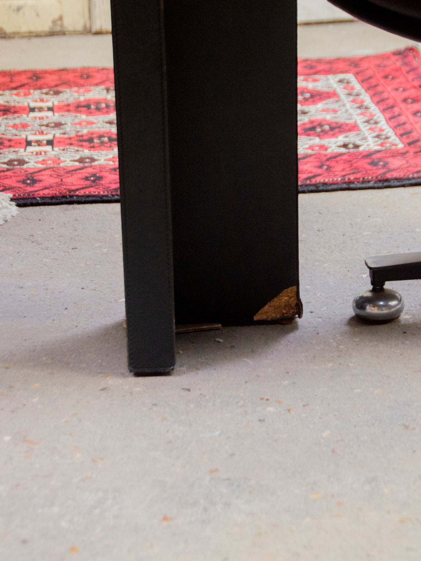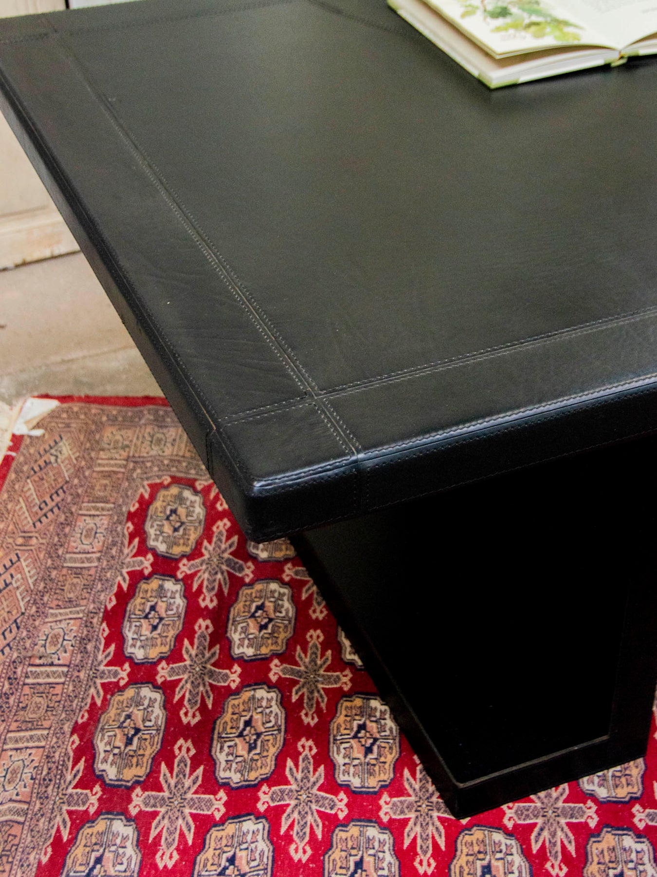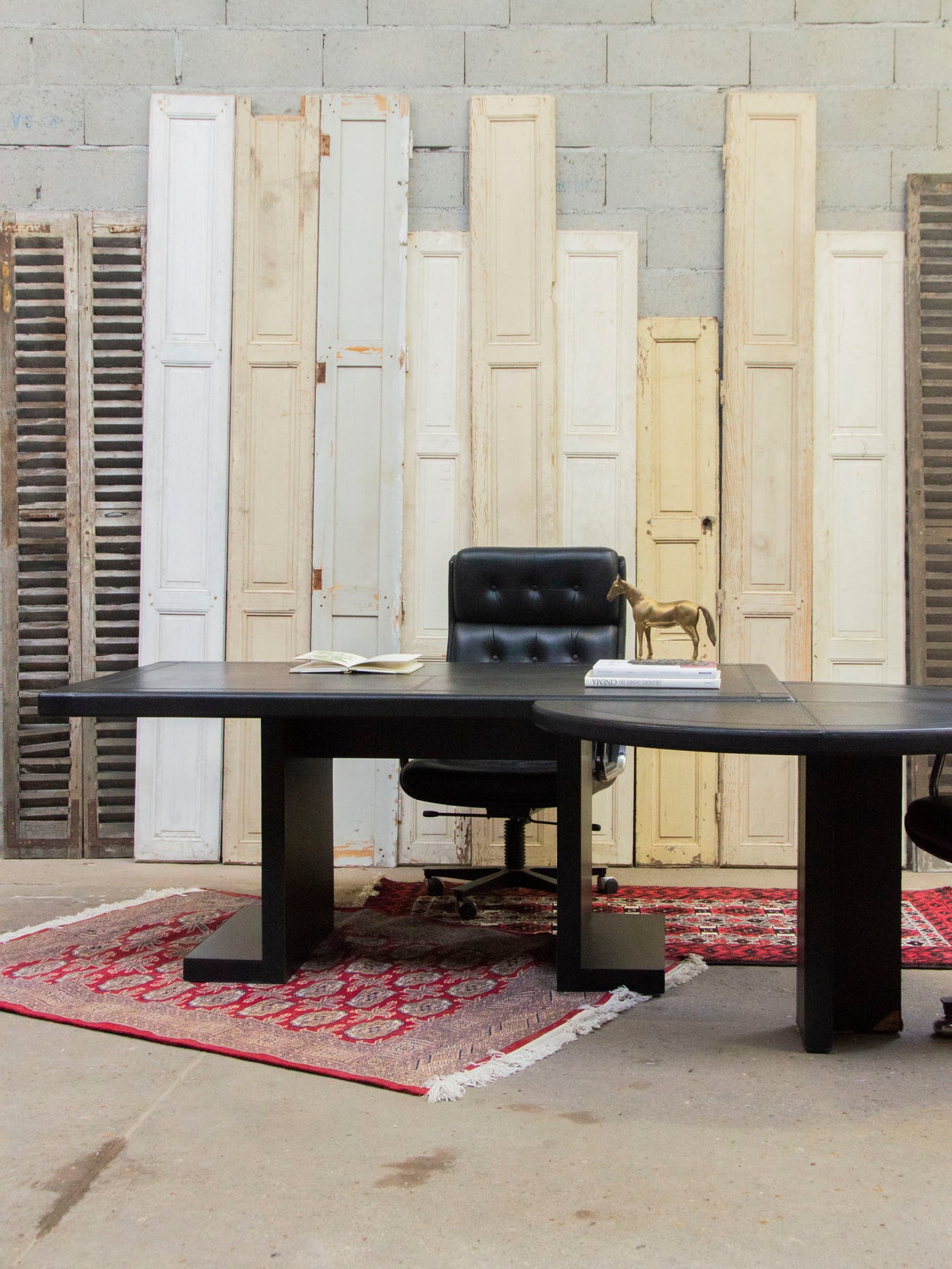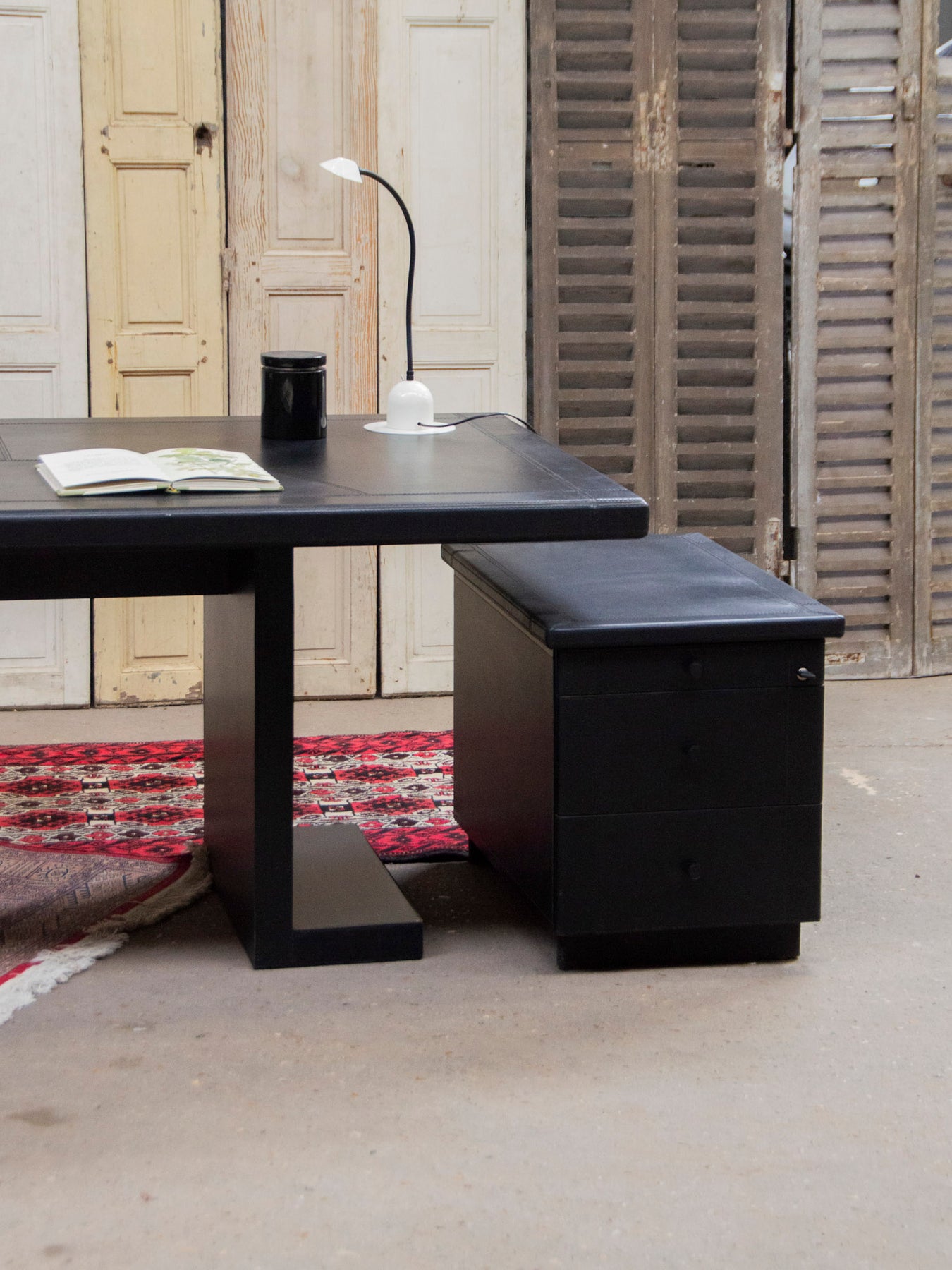 Adopt this very large Italian desk from the 1970s, designed by Guido, with its leather-covered top and rounded extension that creates a vast work surface while forming an elegant angle. Sold with a matching pedestal, it offers discreet storage and generous proportions suitable for executive offices or creative studios. Its vintage style blends sophistication and warmth, perfect for an inspiring and understated atmosphere. Wear to the legs.
