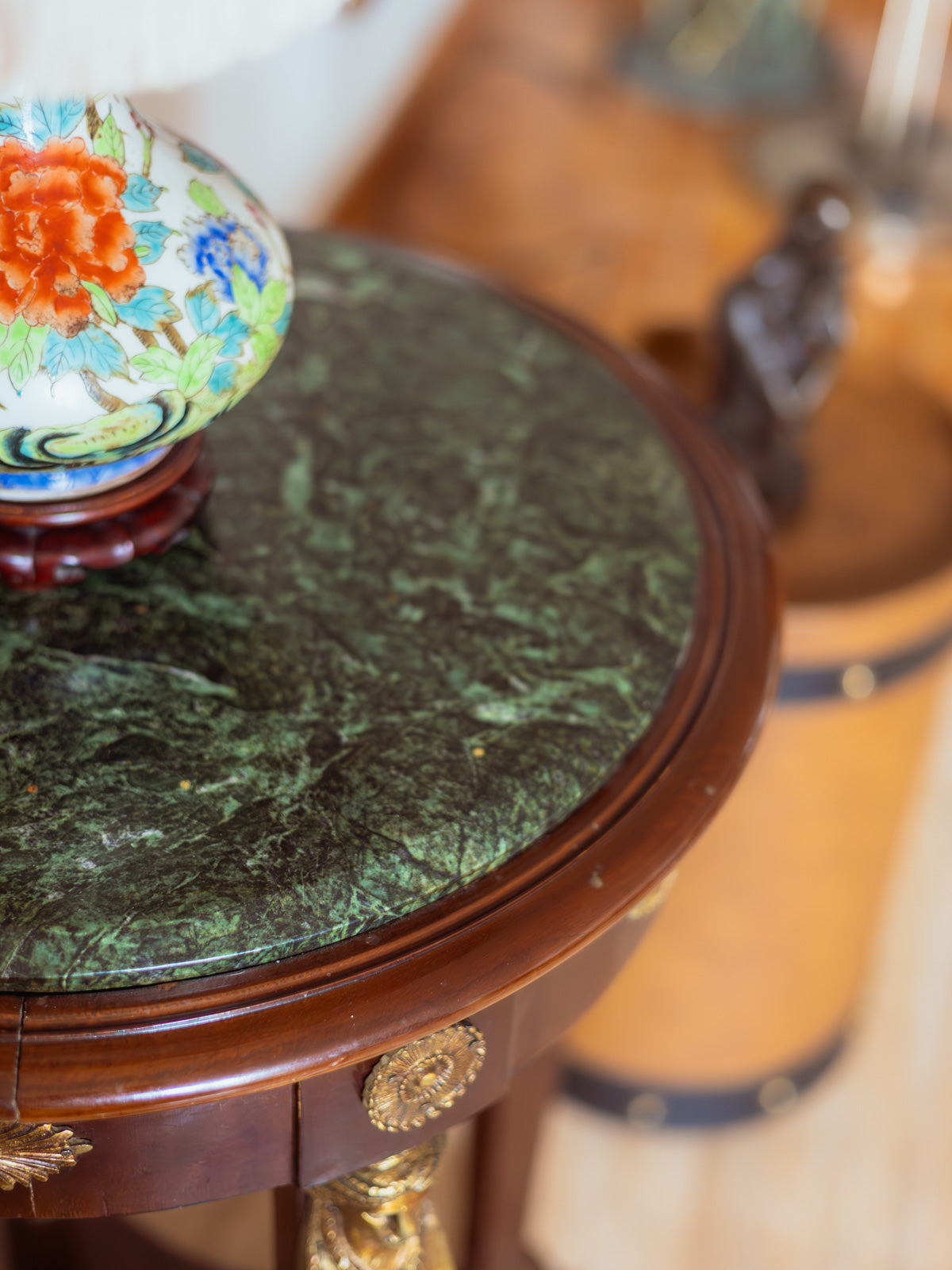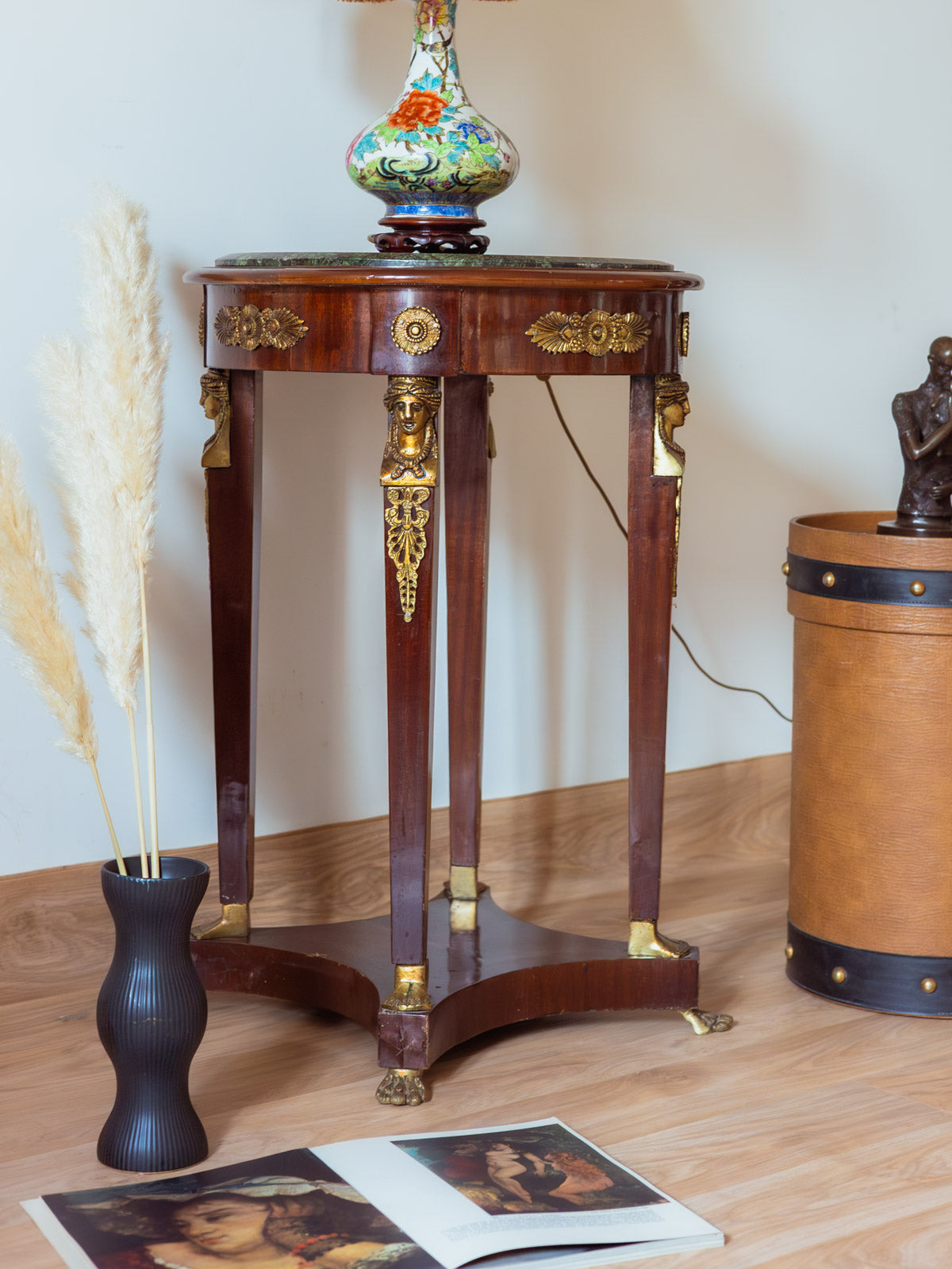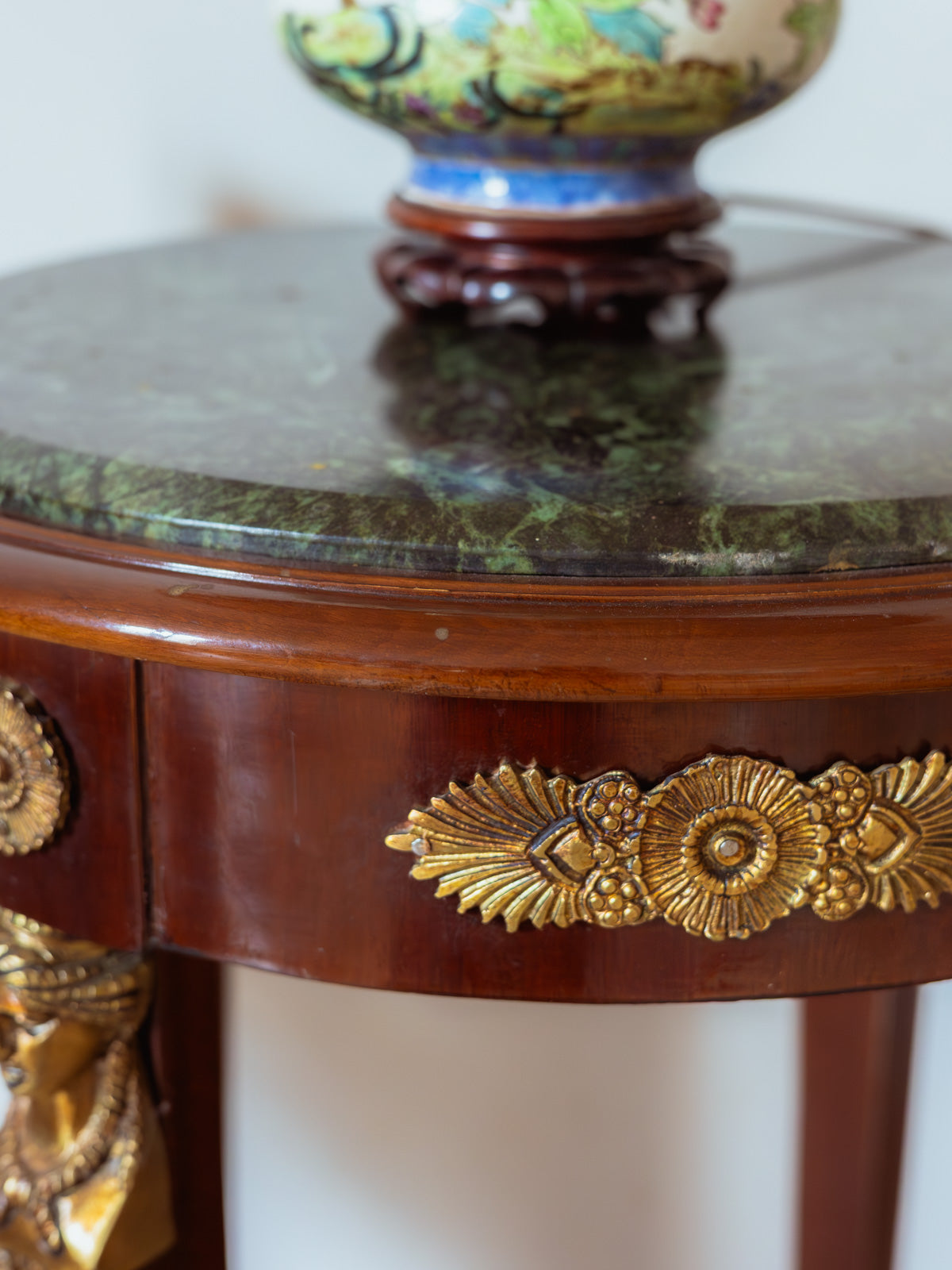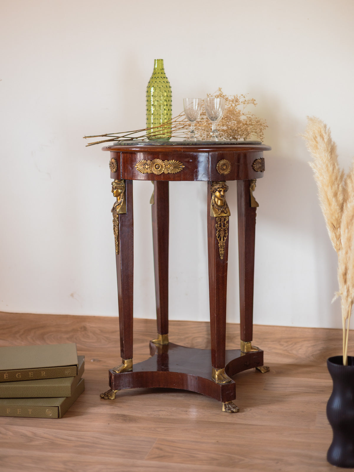 Sublimez votre intérieur avec ce guéridon en acajou au plateau de marbre vert, orné d'éléments en laiton et de personnages sculptés qui témoignent d'un savoir‑faire soigné. Ses proportions compactes en font une table d'appoint parfaite pour une lampe, un vase ou un petit objet de collection, tandis que les pieds sculptés en pattes de lion lui confèrent une présence architecturée. Entre raffinement classique et charme cabinet de curiosités, il installe une ambiance chaleureuse et élégante. Légères traces du temps présentes.