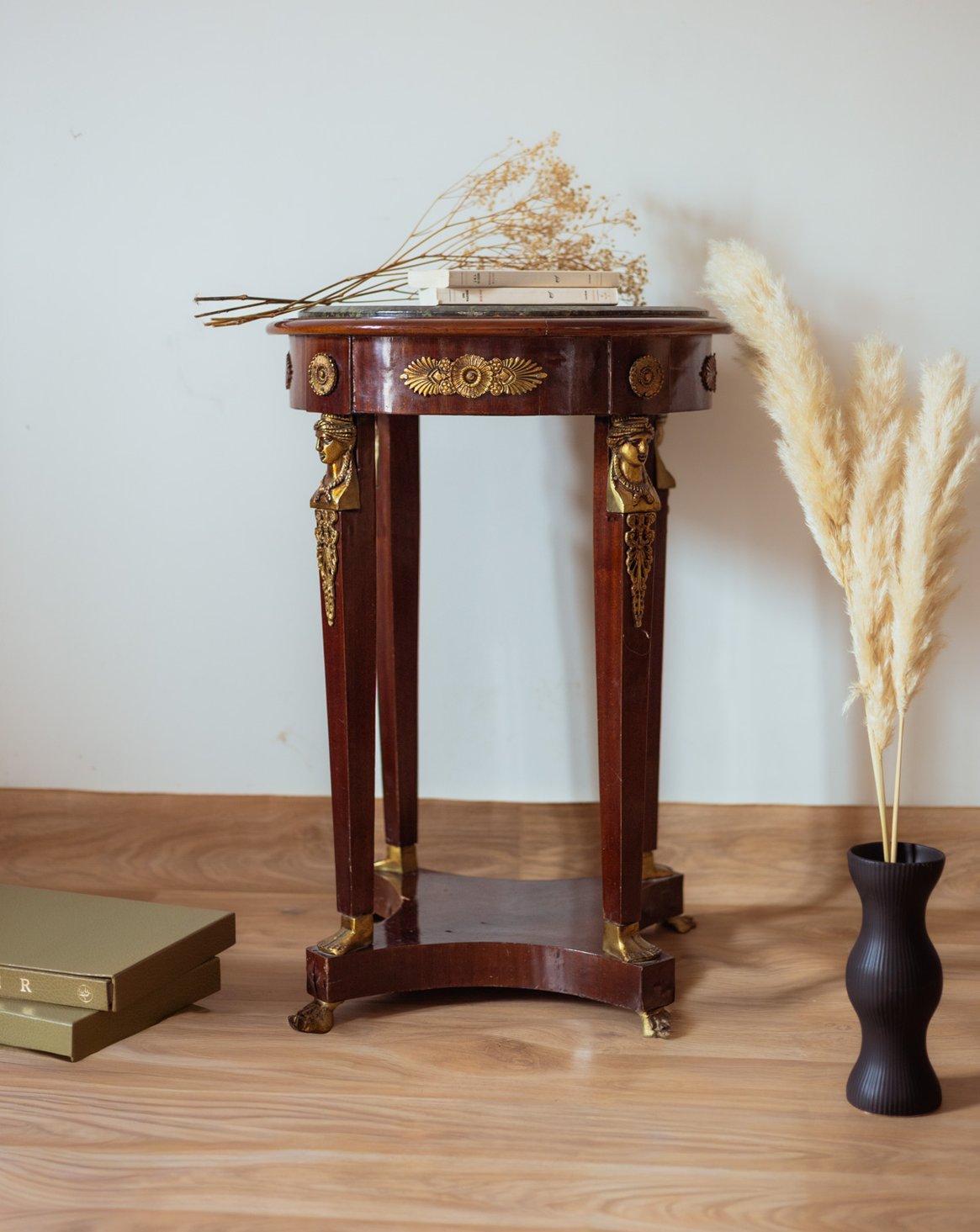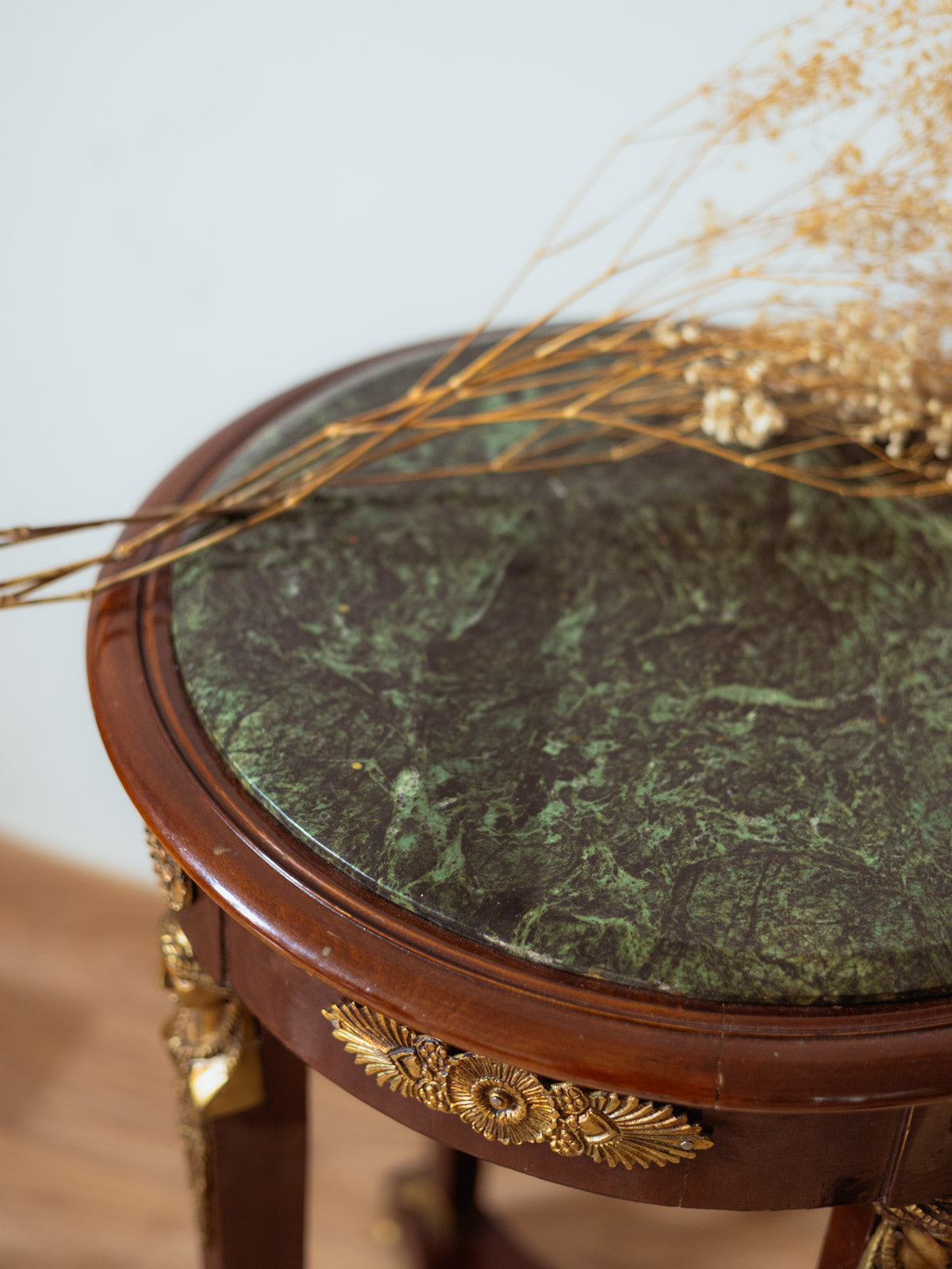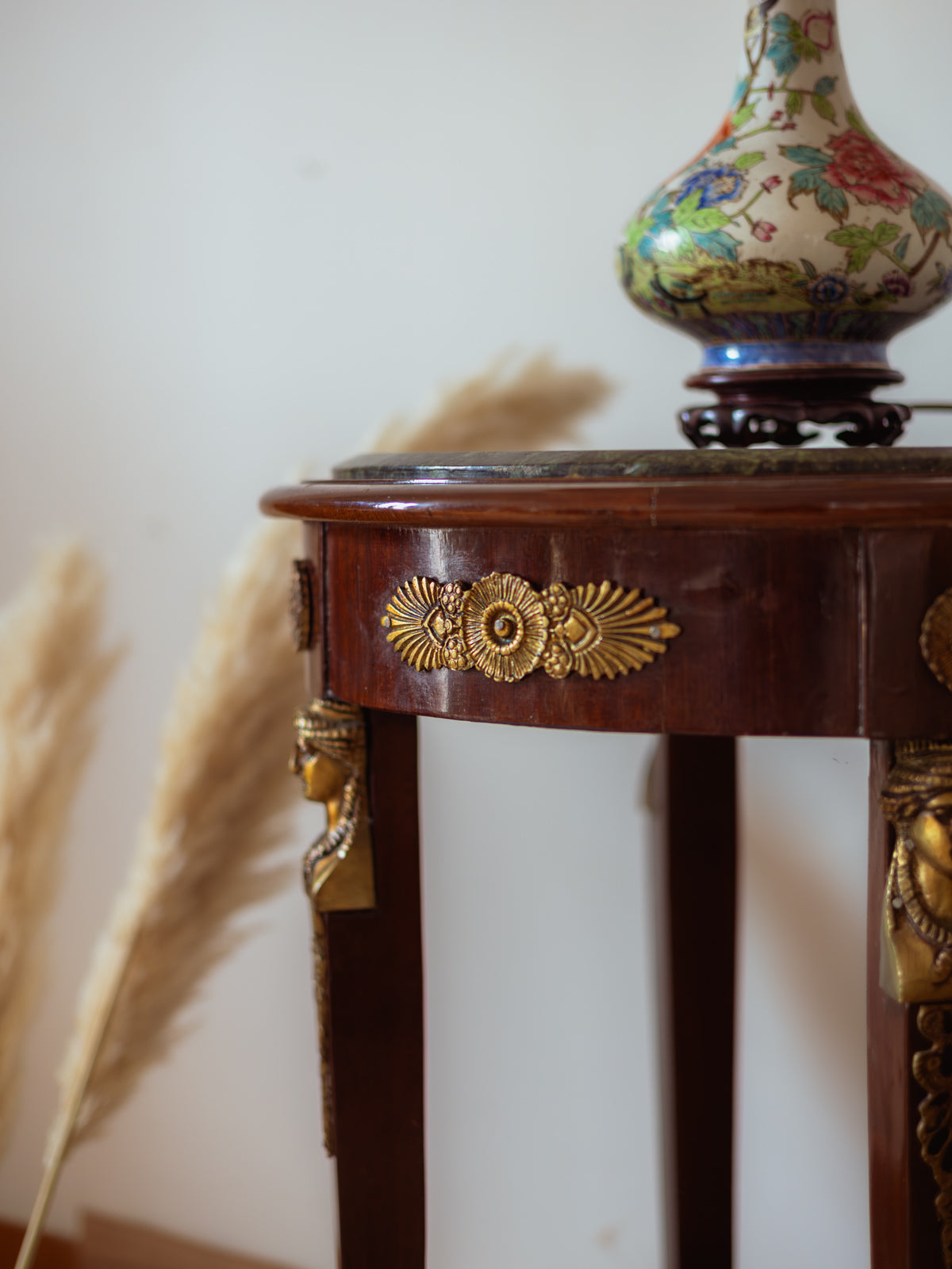 Sublimez votre intérieur avec ce guéridon en acajou au plateau de marbre vert, orné d'éléments en laiton et de personnages sculptés qui témoignent d'un savoir‑faire soigné. Ses proportions compactes en font une table d'appoint parfaite pour une lampe, un vase ou un petit objet de collection, tandis que les pieds sculptés en pattes de lion lui confèrent une présence architecturée. Entre raffinement classique et charme cabinet de curiosités, il installe une ambiance chaleureuse et élégante. Légères traces du temps présentes.