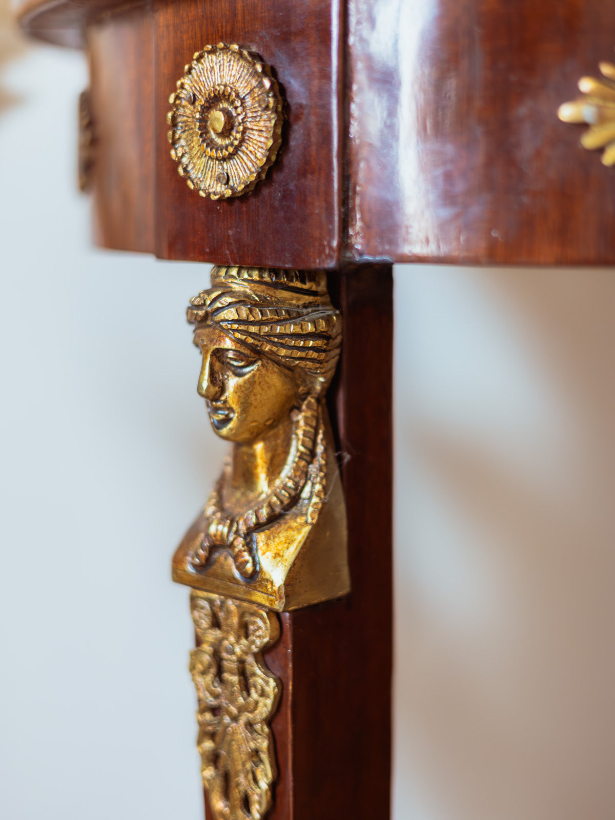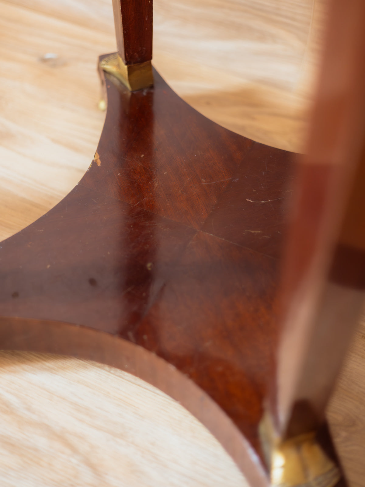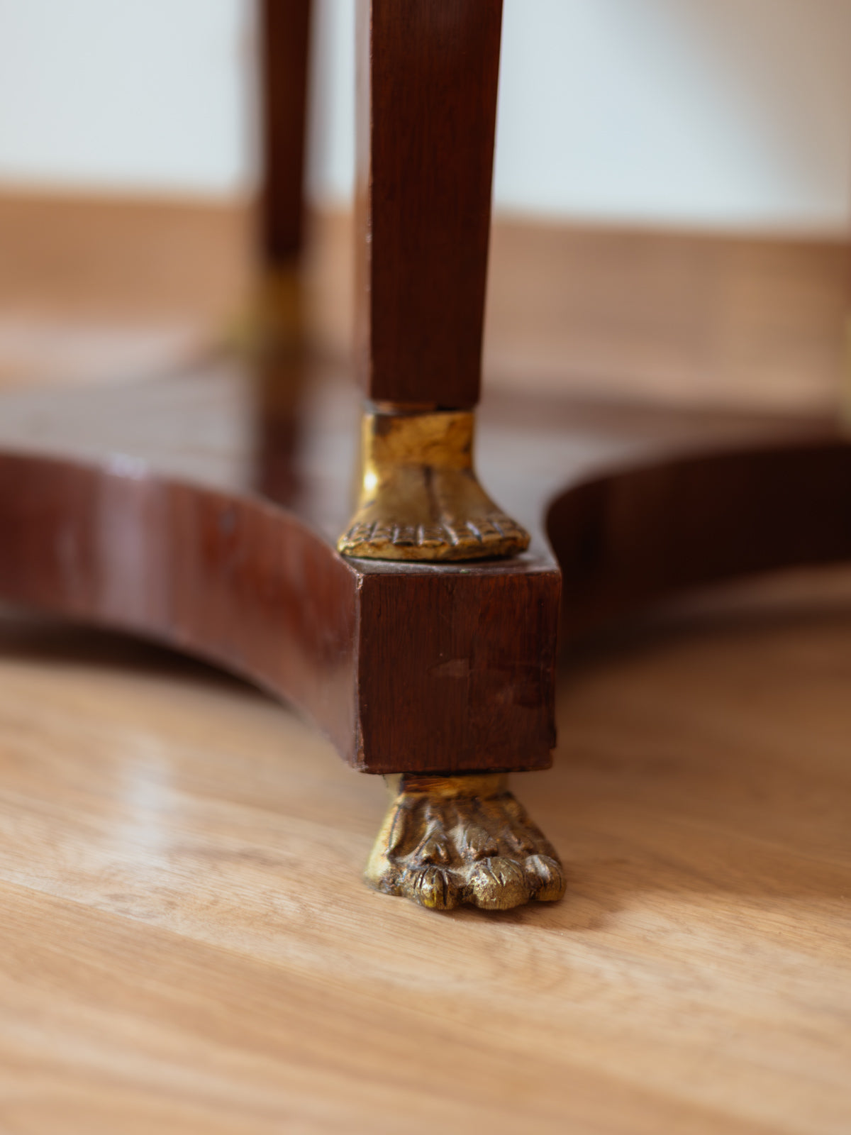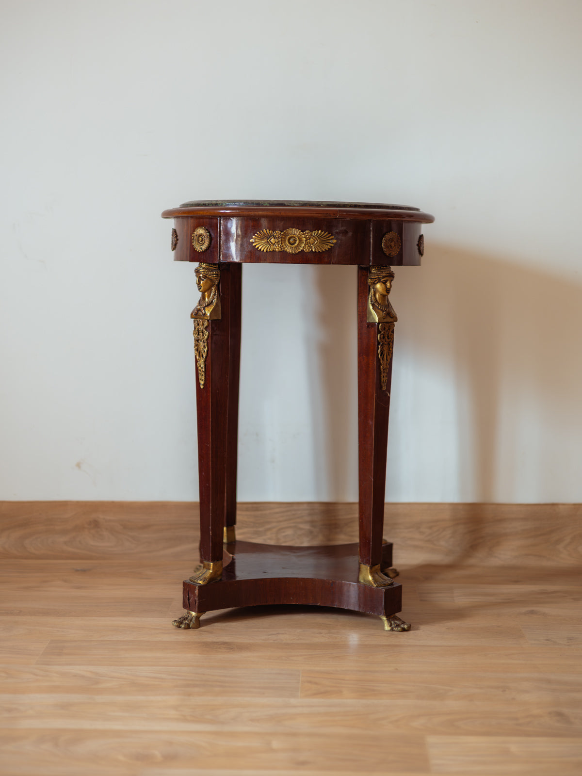 Sublimez votre intérieur avec ce guéridon en acajou au plateau de marbre vert, orné d'éléments en laiton et de personnages sculptés qui témoignent d'un savoir‑faire soigné. Ses proportions compactes en font une table d'appoint parfaite pour une lampe, un vase ou un petit objet de collection, tandis que les pieds sculptés en pattes de lion lui confèrent une présence architecturée. Entre raffinement classique et charme cabinet de curiosités, il installe une ambiance chaleureuse et élégante. Légères traces du temps présentes.