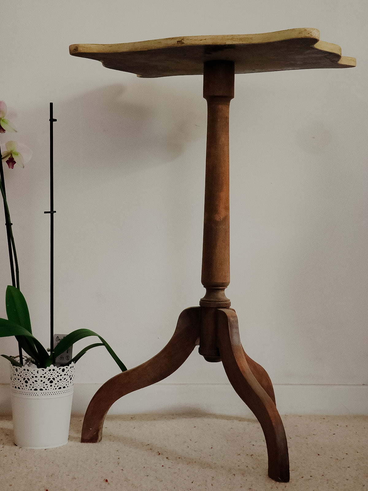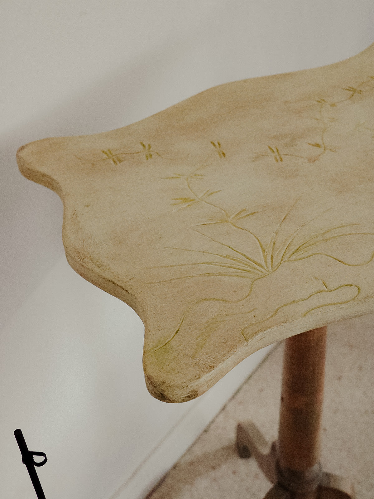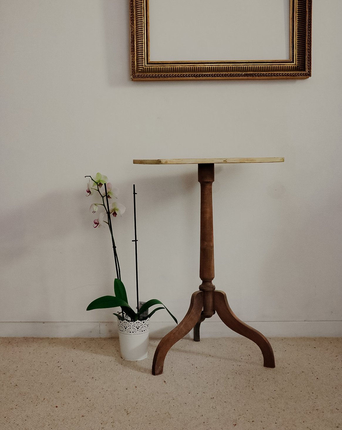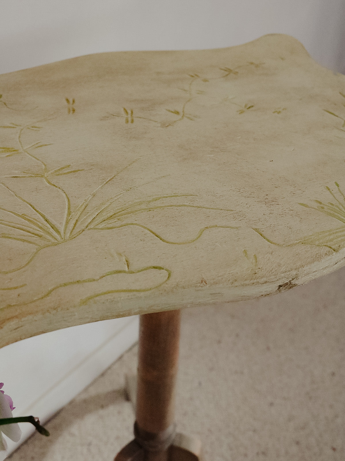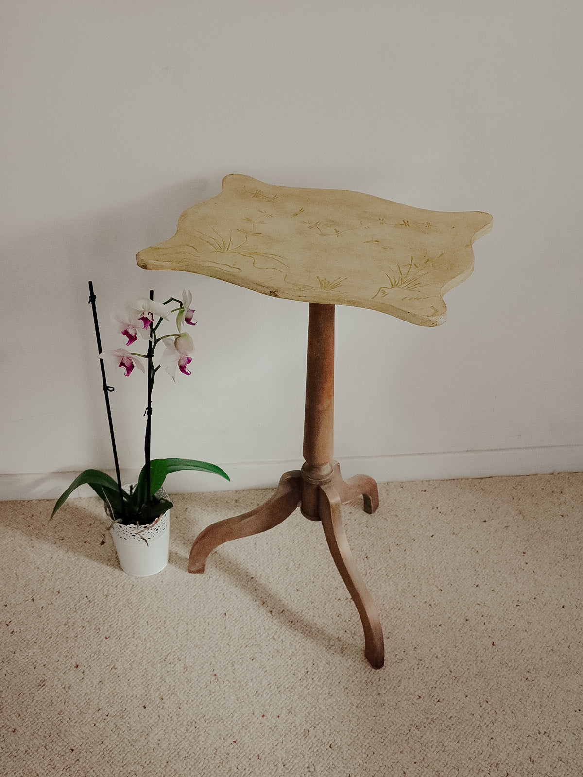 Découvrez ce guéridon en merisier massif au caractère délicat, où le pied en bois naturel dialogue avec un plateau repeint orné d'un motif gravé doré. Sa silhouette compacte et ses proportions élancées en font une table d'appoint idéale pour accueillir une lampe, un vase ou un plateau à thé, discrètement rehaussant l'entrée, le salon ou une chambre. L'alliance du bois massif et de la restauration décorative crée une atmosphère chaleureuse et raffinée, à la fois sobre et pleine de charme.