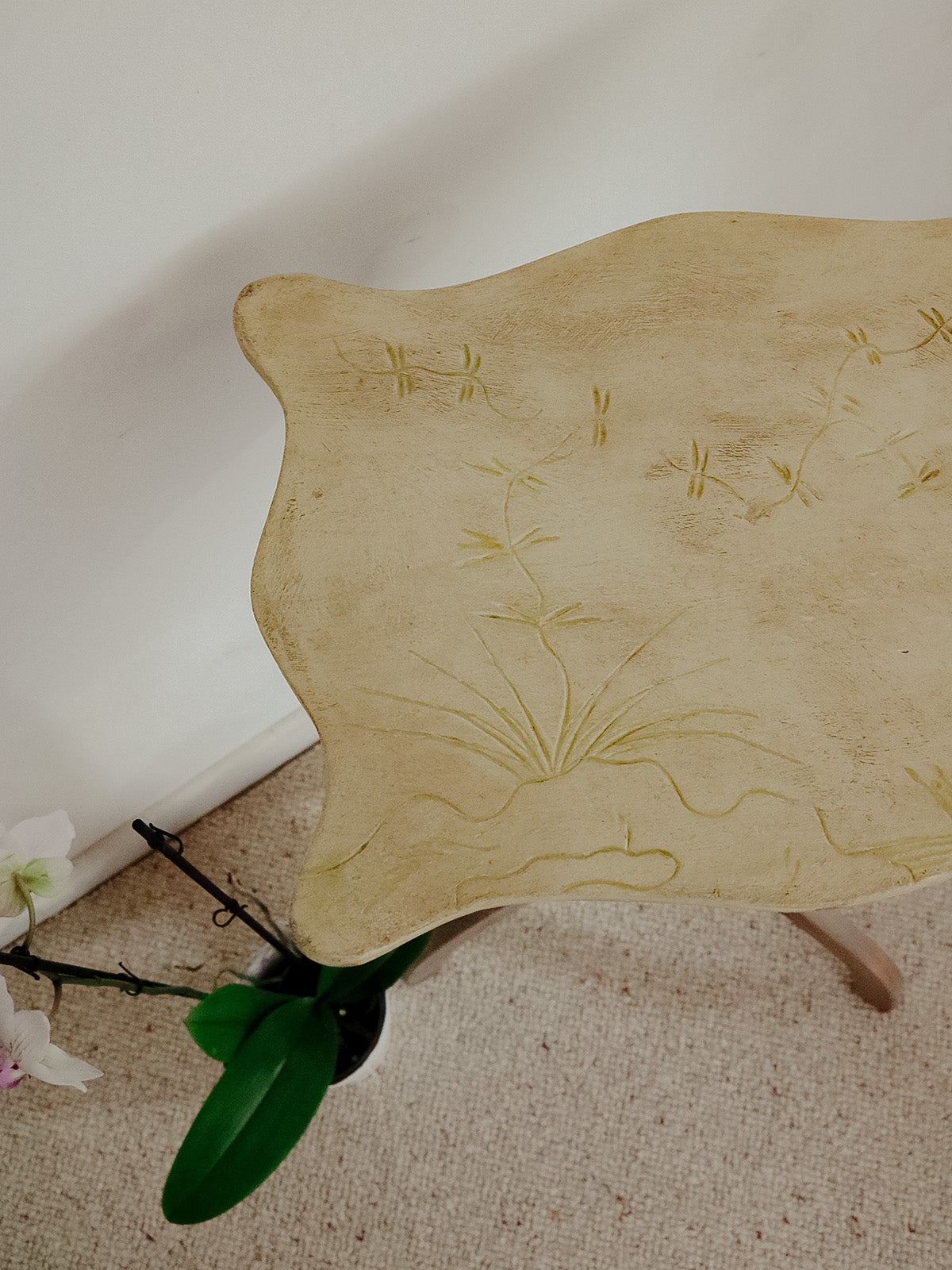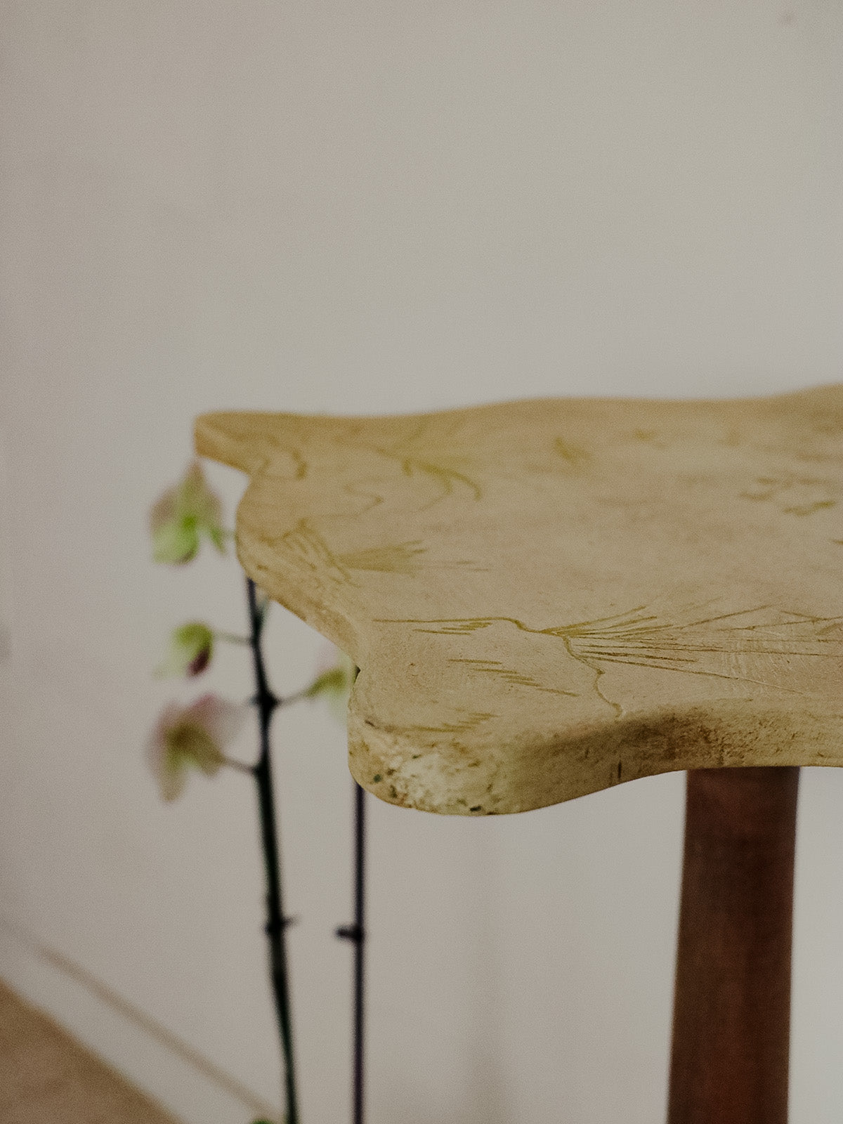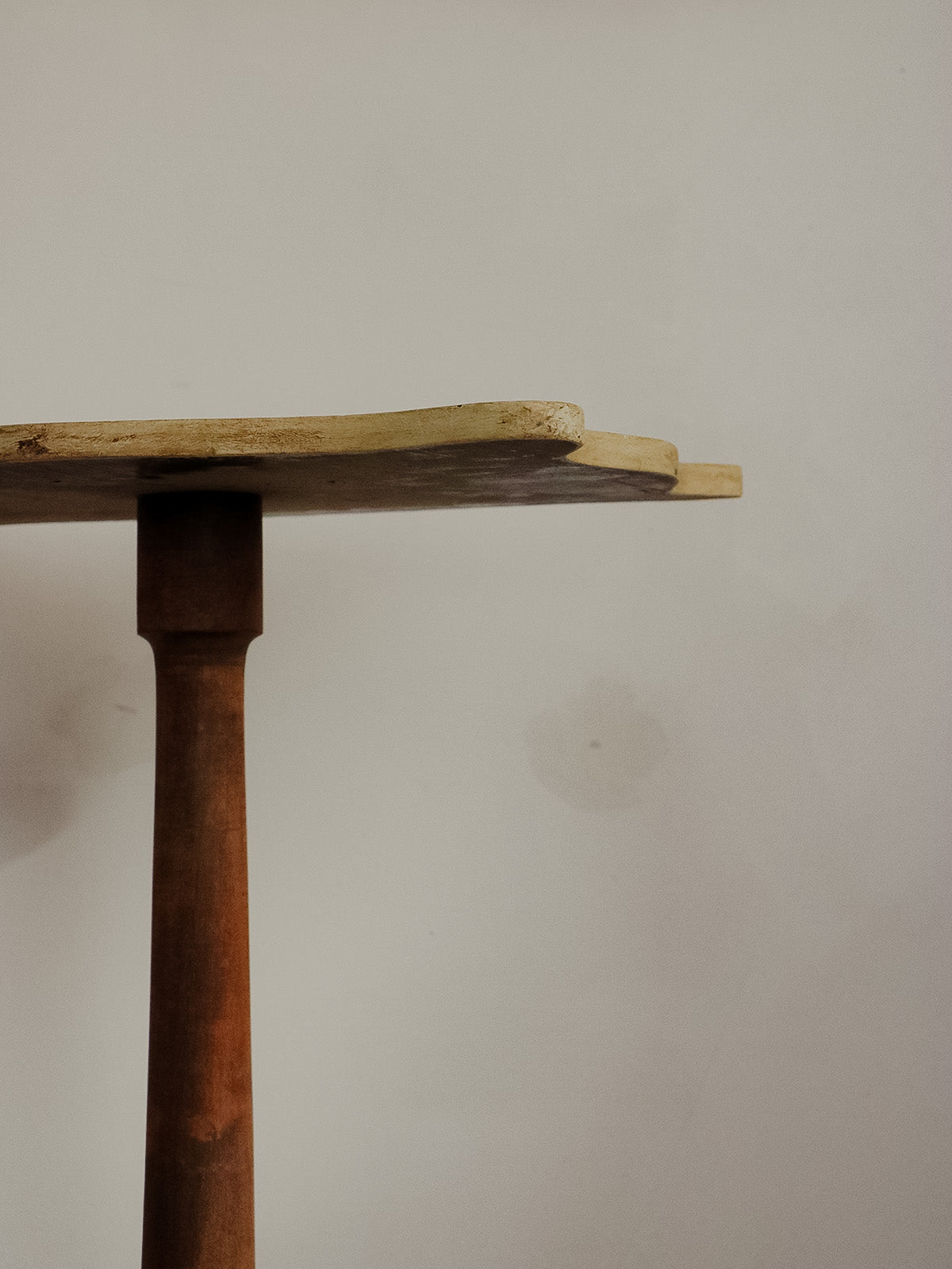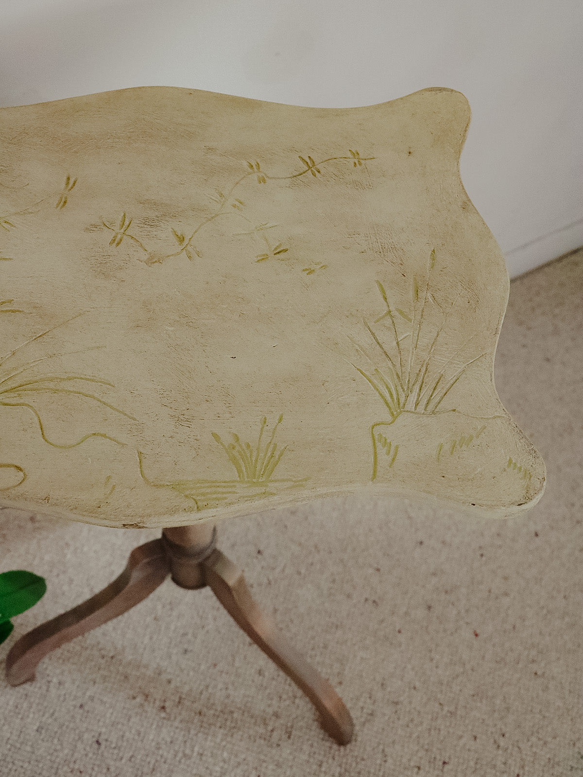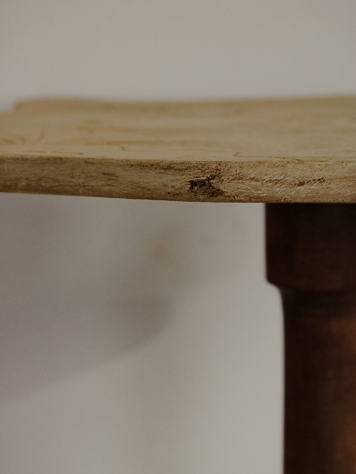 Découvrez ce guéridon en merisier massif au caractère délicat, où le pied en bois naturel dialogue avec un plateau repeint orné d'un motif gravé doré. Sa silhouette compacte et ses proportions élancées en font une table d'appoint idéale pour accueillir une lampe, un vase ou un plateau à thé, discrètement rehaussant l'entrée, le salon ou une chambre. L'alliance du bois massif et de la restauration décorative crée une atmosphère chaleureuse et raffinée, à la fois sobre et pleine de charme.