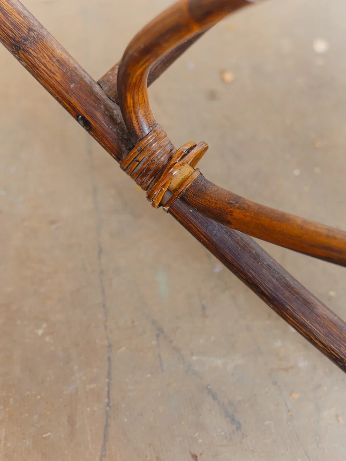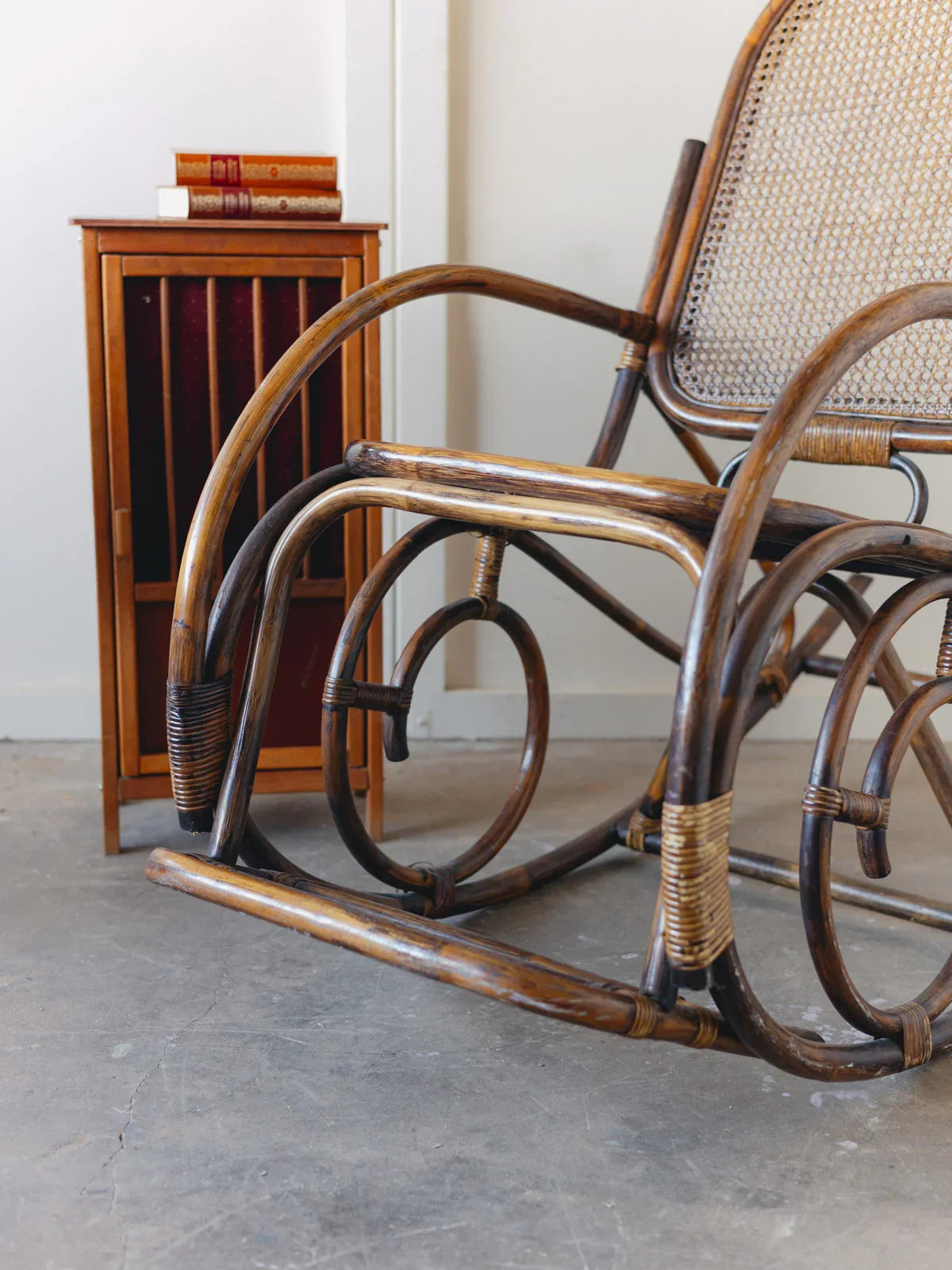 Adoptez ce rocking chair en bambou et cannage, dont la silhouette légère apporte une note naturelle et raffinée à votre intérieur. Sa structure élancée et l'assise à hauteur accueillante offrent un basculement doux, idéal pour un coin lecture, une véranda ou un salon bohème. Le bambou apporte chaleur et légèreté, le cannage laisse respirer le confort tout en soulignant un style artisanal. Quelques brins d'osier décollés. Traces d'usage qui marquent son caractère authentique.