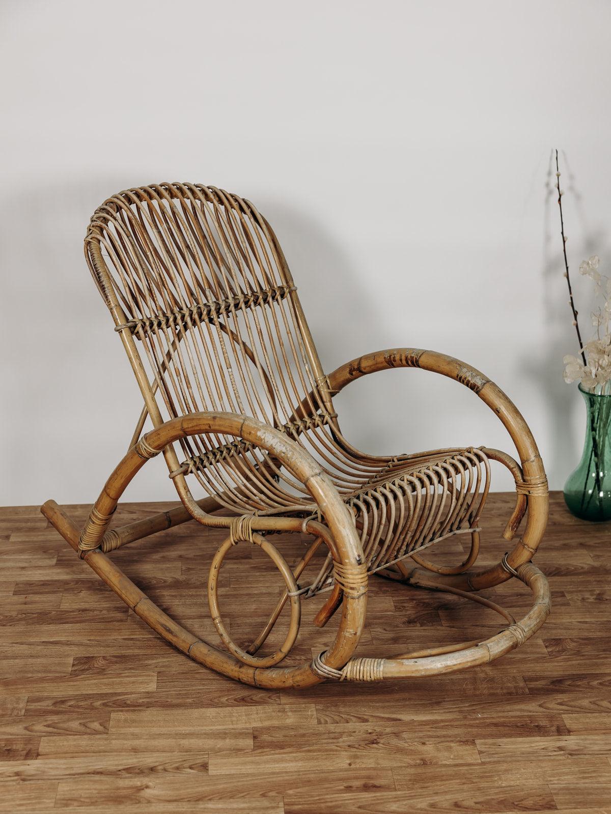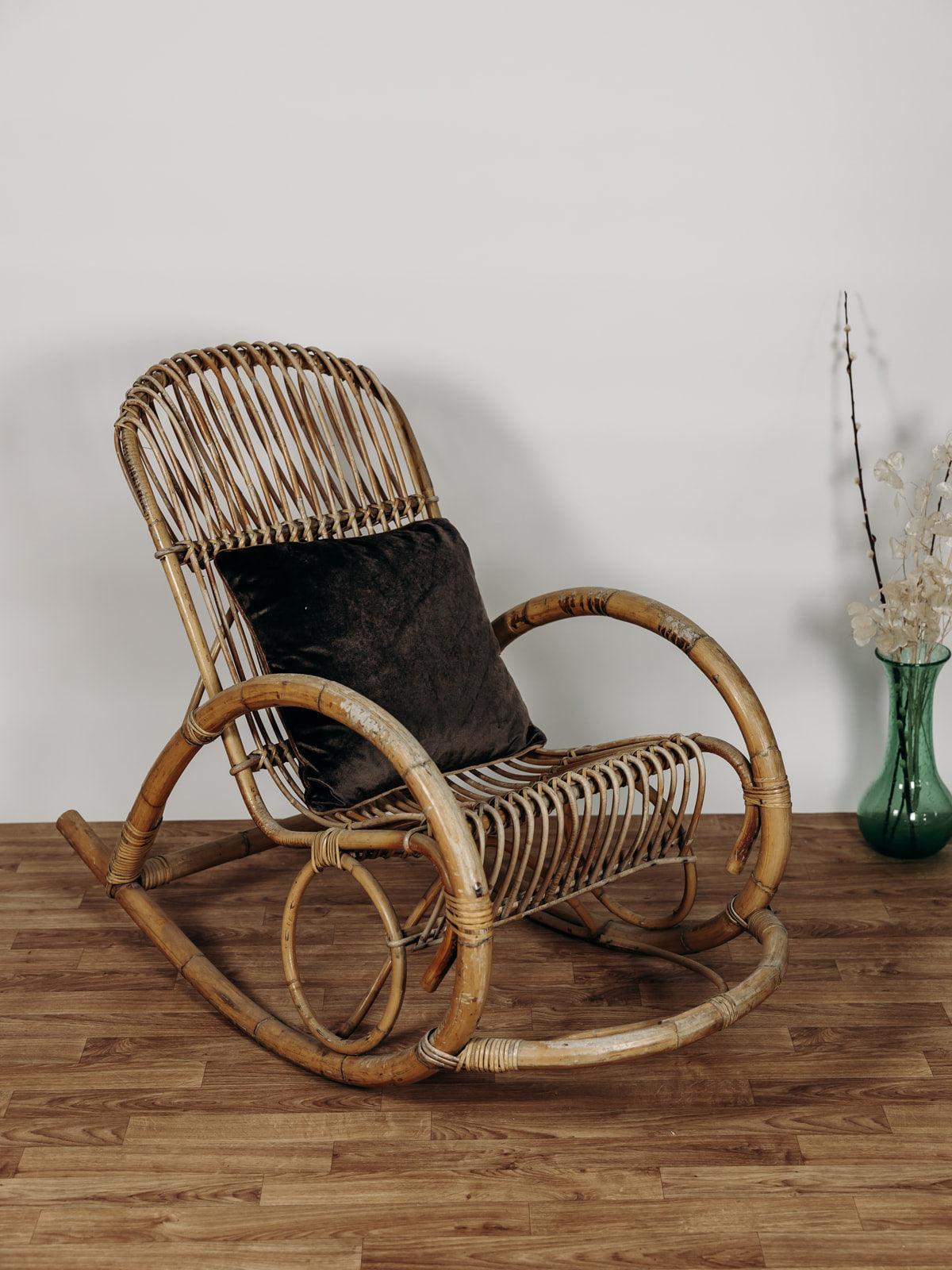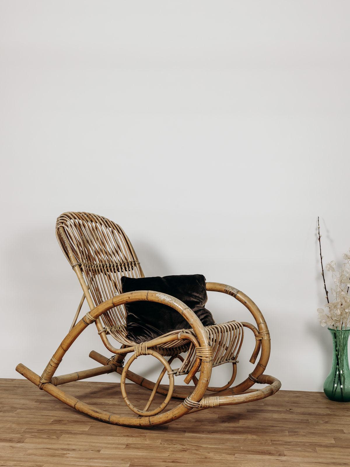 Ce superbe fauteuil à bascule des années 60, signé Rohe Noordwolde, incarne le charme intemporel du design vintage. Nous avons craqué pour la patine de son rotin et son double cerclage élégant au niveau du haut du dossier, très joli et tout confort pour y reposer sa tête. Le repose-pied intégré, une caractéristique originale de ce modèle, ajoute un confort supplémentaire tout en restant fidèle à son allure rétro.
