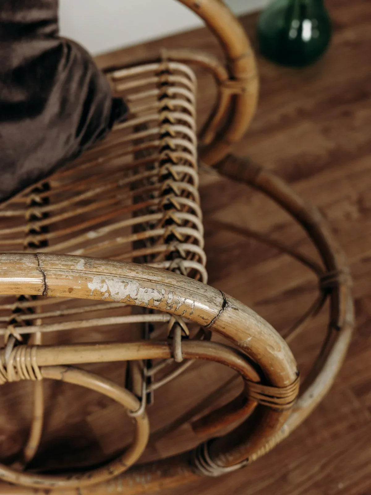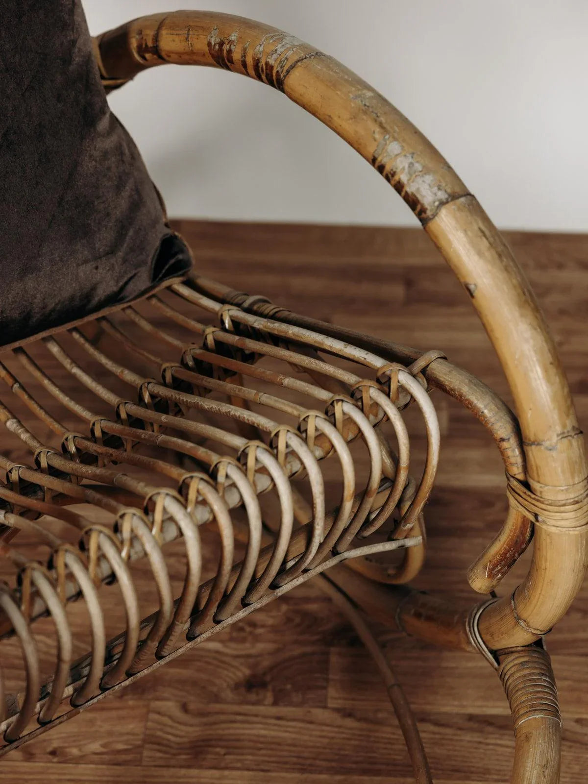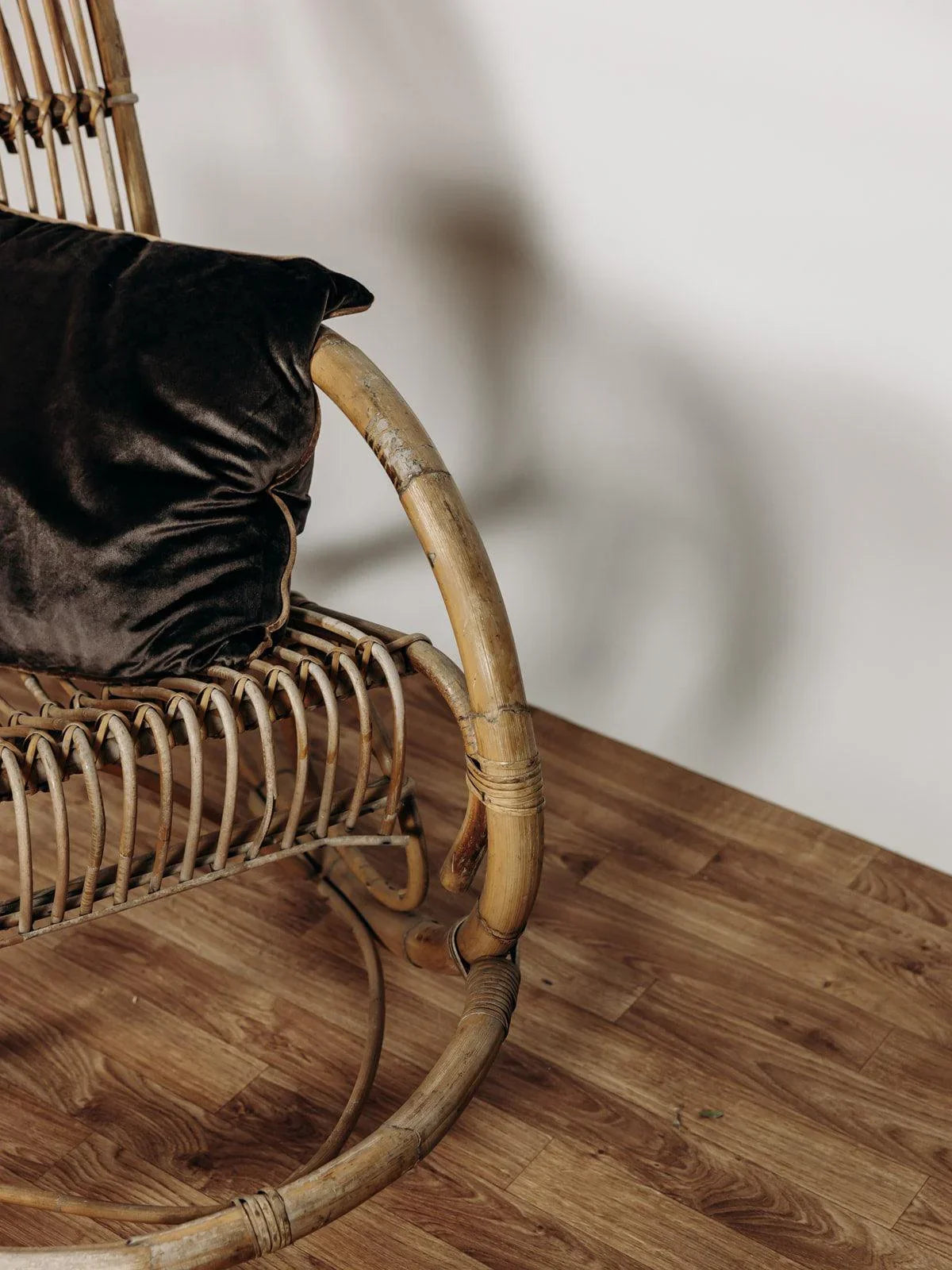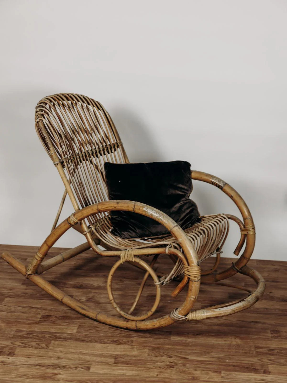 Ce superbe fauteuil à bascule des années 60, signé Rohe Noordwolde, incarne le charme intemporel du design vintage. Nous avons craqué pour la patine de son rotin et son double cerclage élégant au niveau du haut du dossier, très joli et tout confort pour y reposer sa tête. Le repose-pied intégré, une caractéristique originale de ce modèle, ajoute un confort supplémentaire tout en restant fidèle à son allure rétro.