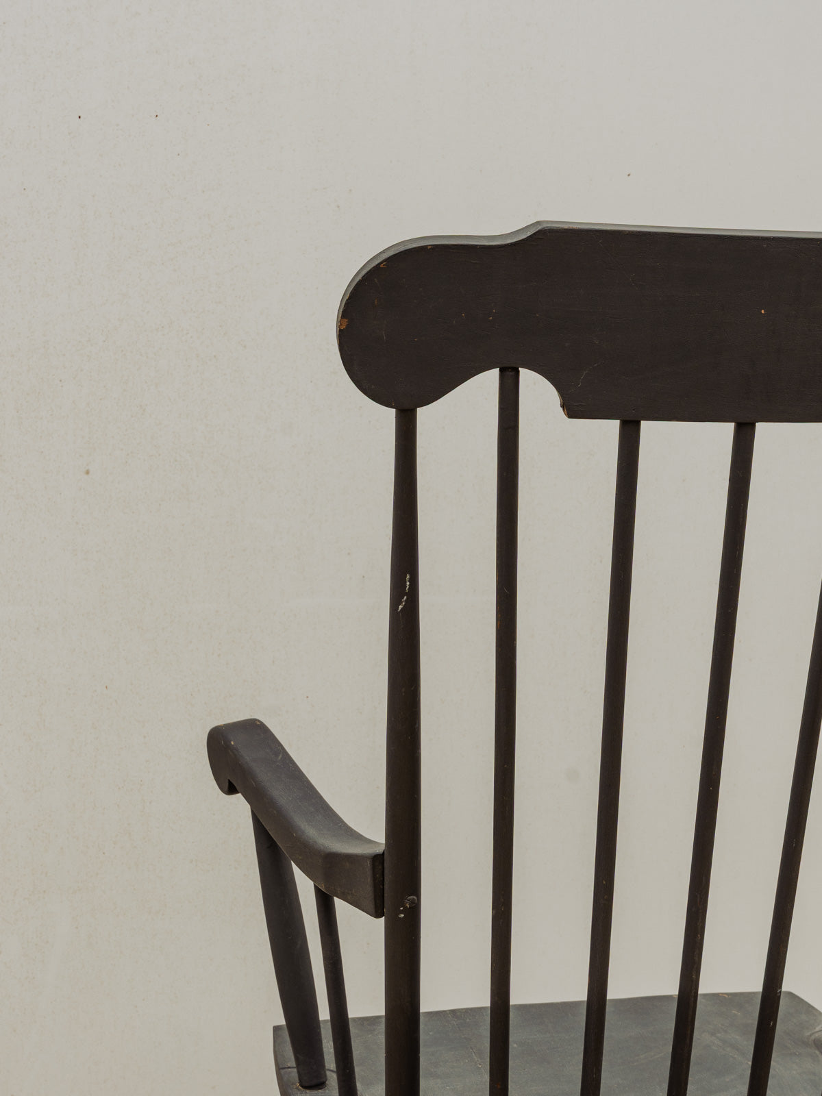 Adoptez ce rocking-chair vintage en bois poncé en noir, dont les lignes sobres et le galbe élégant racontent une histoire et invitent immédiatement à la détente. Sa structure robuste et la finition qui laisse apparaître le grain du bois apportent une patine chaleureuse, parfaite pour instaurer une ambiance rétro-chic dans un salon, une chambre ou un coin lecture. Le balancement doux promet des moments de repos, tandis que ses proportions accueillantes s'intègrent facilement dans différents espaces. Légères traces du temps présentes.