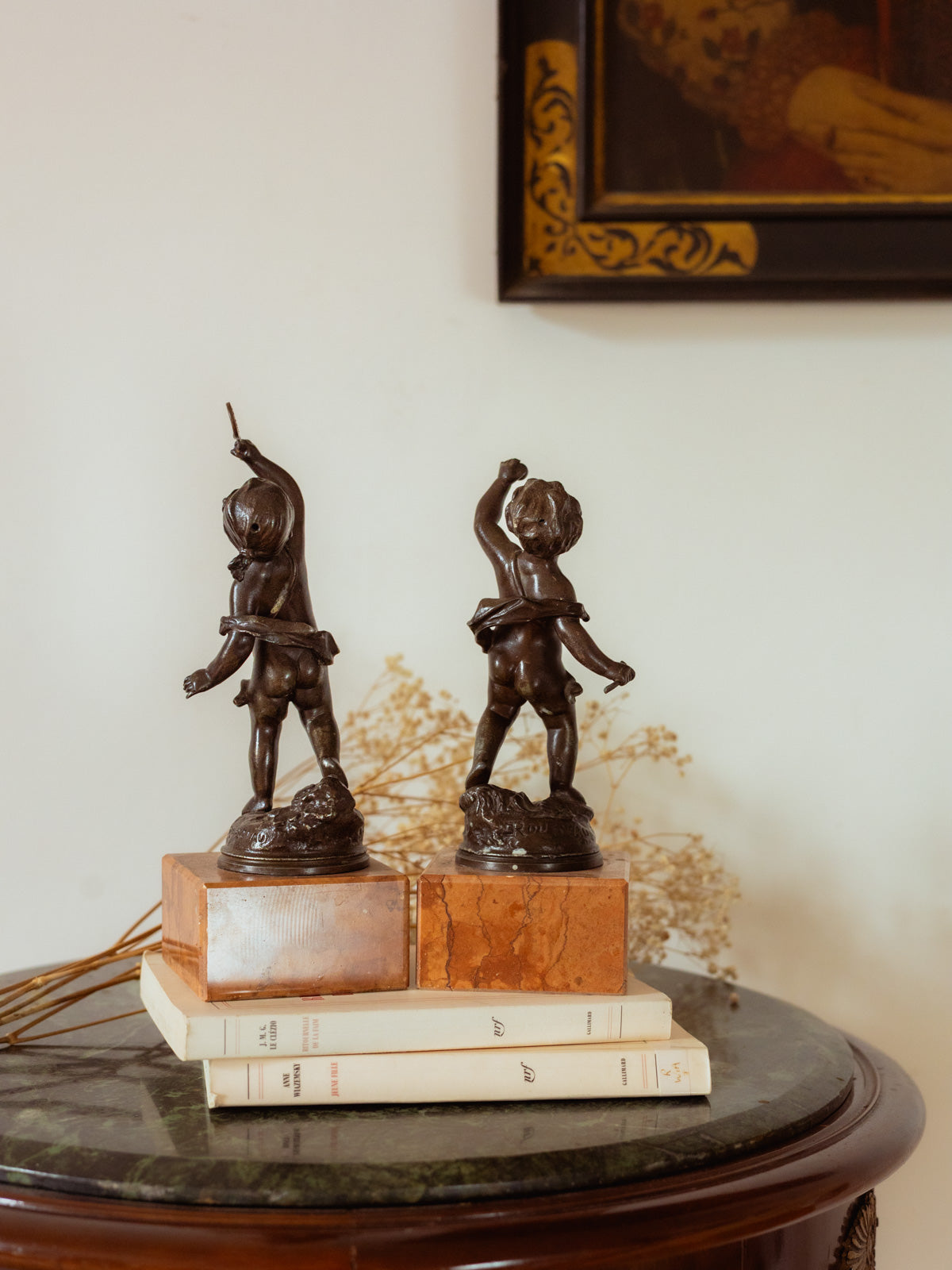 Découvrez cet objet décoratif, une paire de chérubins en bronze reposant sur piétements en marbre, où chaque figurine exprime un récit en mouvement : l'un joue à la raquette, l'autre semble déjà en pleine envolée. Le travail du bronze et la noblesse du marbre créent un contraste sobre et raffiné, soulignant une facture classique. Idéales pour ponctuer une cheminée, une console ou une bibliothèque, ces pièces apportent une touche poétique et une présence délicate à l'atmosphère de la pièce. Légères traces du temps.