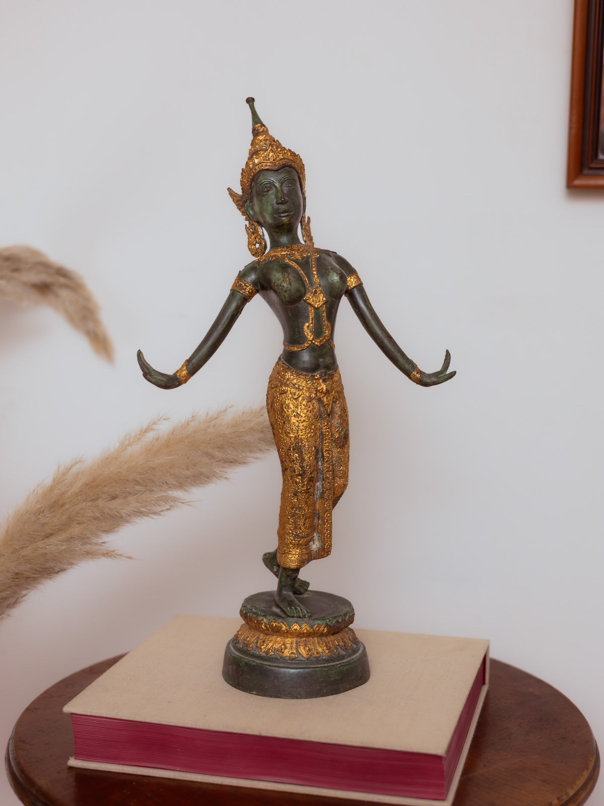 Sublimez votre intérieur avec cet objet décoratif sous le format d'une déesse en bronze patiné vert, rehaussée d'un délicat doré qui souligne ses reliefs. Son format compact et sa silhouette élancée en font une pièce décorative facile à installer sur une console, une étagère ou une cheminée, apportant une présence sculpturale sans envahir l'espace. Le contraste entre la patine verte et les touches dorées crée un jeu de lumière tout en douceur, évoquant une atmosphère féminine, intemporelle et raffinée.