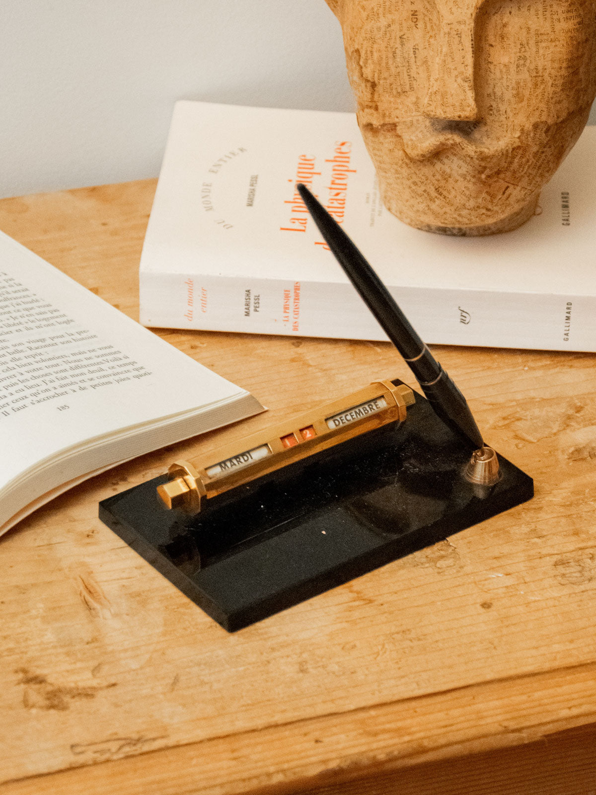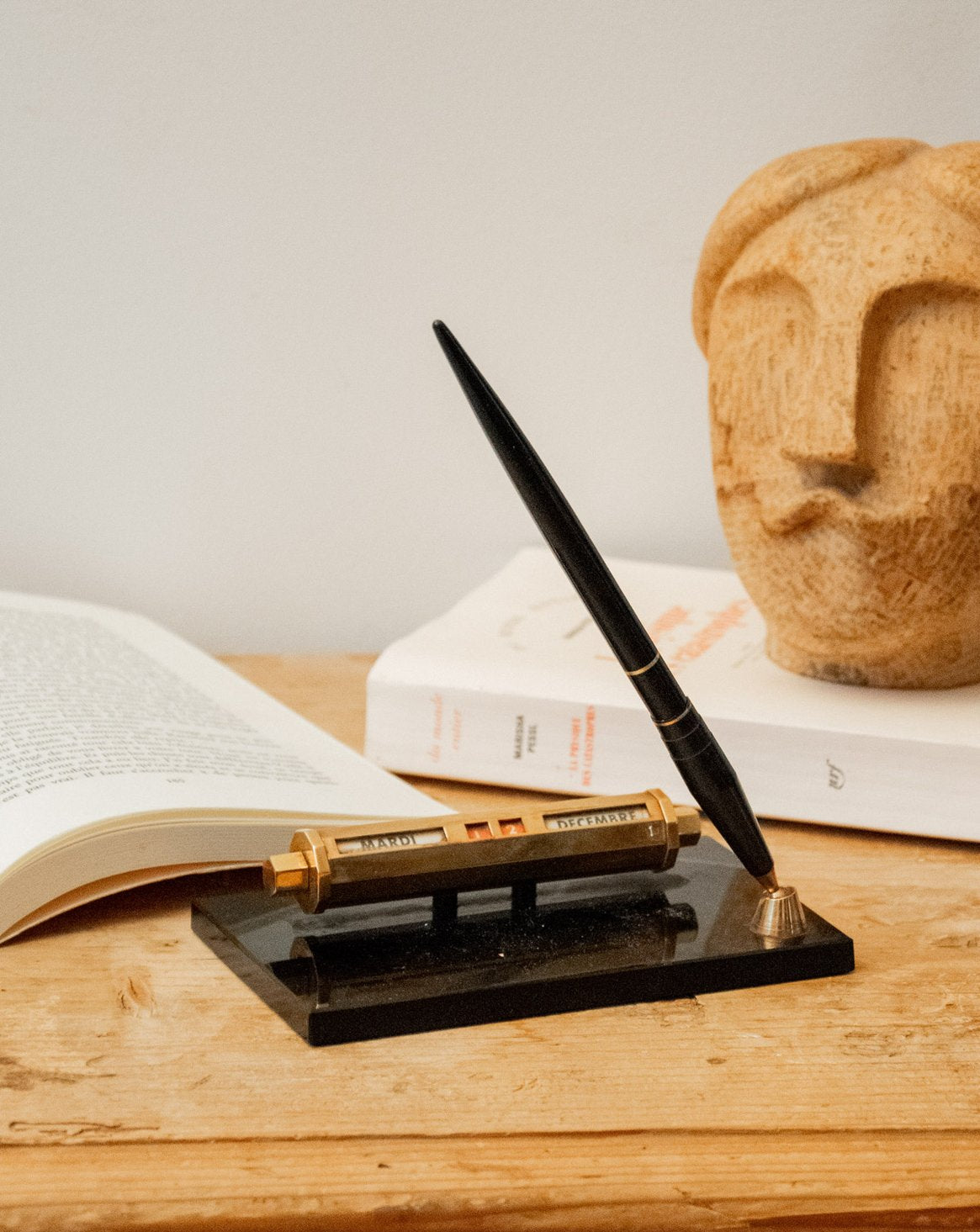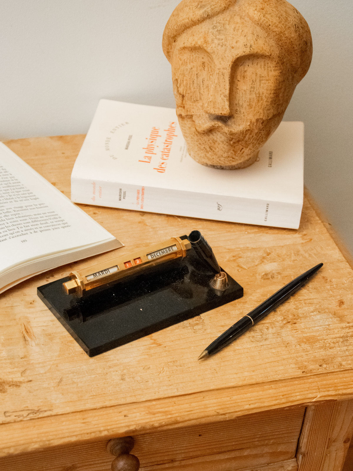 Adoptez ce calendrier perpétuel ancien au charme vintage, au format compact qui se glisse aisément dans votre décoration ou se pose délicatement sur un bureau. Son mécanisme, en état de marche, permet d'afficher la date de façon ludique et durable, mêlant utilité quotidienne et esthétisme rétro. Sa patine et sa conception d'époque apportent une jolie touche nostalgique à votre intérieur, parfaite pour un coin bureau, une bibliothèque ou comme petit cadeau d'amateur d'objets anciens.