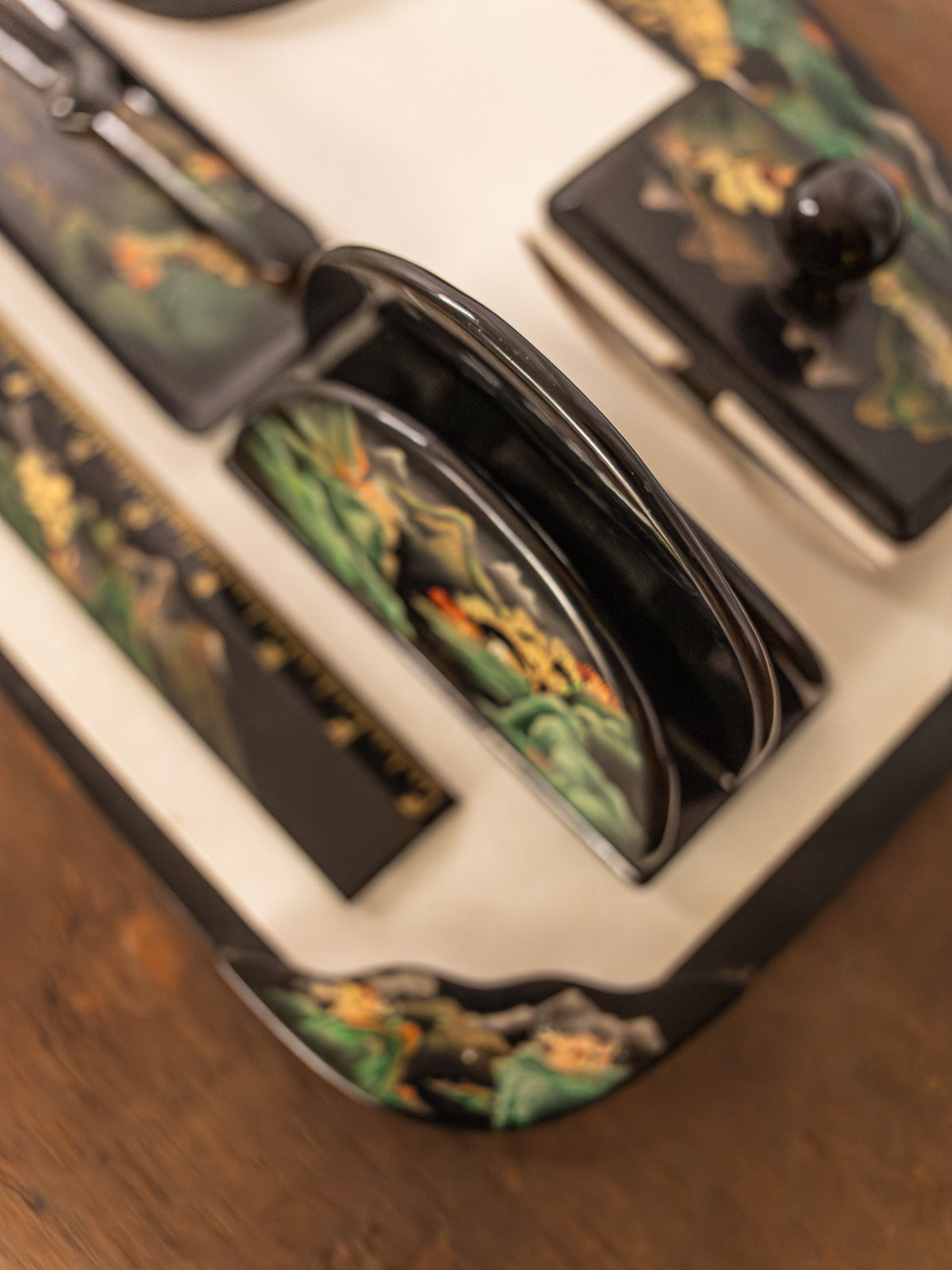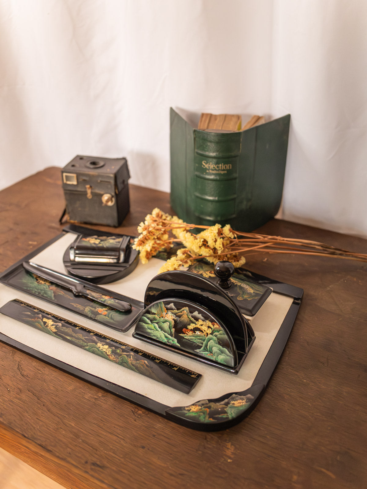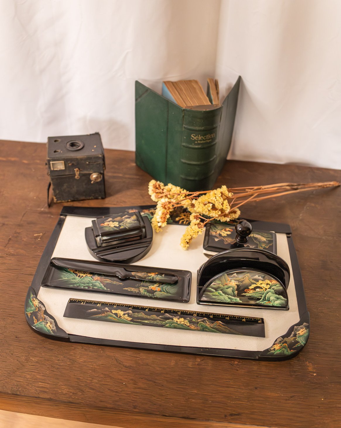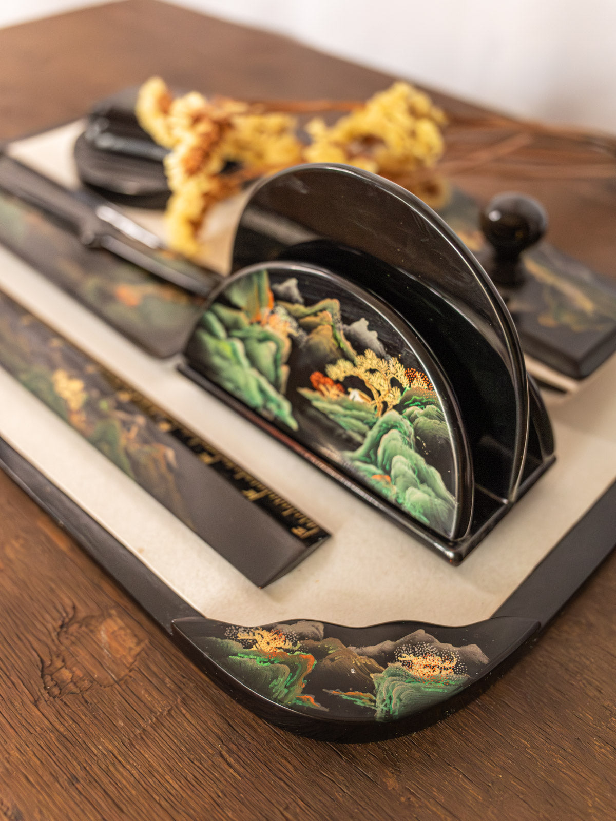 Ajoutez à votre bureau cet ensemble sous-main et accessoires de bureau six pièces en plastique laqué noir, orné de motifs montagne et arbres aux touches vert, doré, rouge et blanc pour une signature graphique subtile. Conçu pour organiser le quotidien, il réunit un buvard, une règle graduée en inches, un coupe-papier, un encrier et un tri-courrier, aux proportions pensées pour un poste de travail compact. Sa surface lisse réfléchit la lumière et installe une ambiance élégante et inspirante, propice à la création.