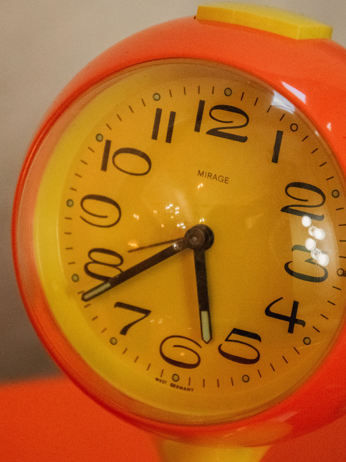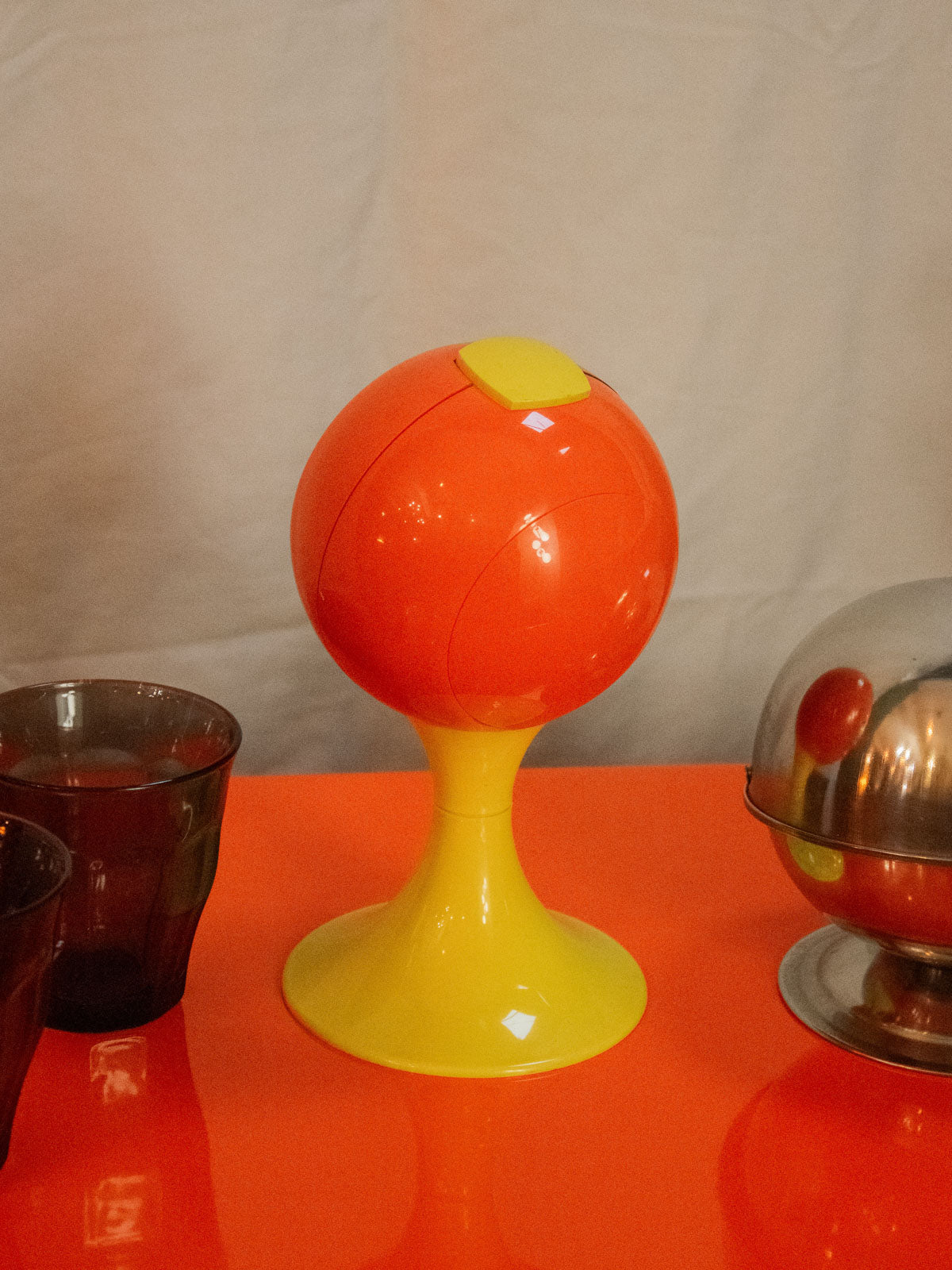 Invitez une touche rétro chaleureuse avec cette horloge des années 70, au cadran rond posé sur un piétement tulipe en plastique laqué. Sa palette orange et jaune, emblématique de l'époque, dynamise subtilement la pièce et crée une ambiance vintage joyeuse, parfaite pour un salon, une cuisine ou un espace créatif. La silhouette élancée du pied confère une présence graphique sans encombrer, alliant style et fonction pour indiquer l'heure avec caractère.