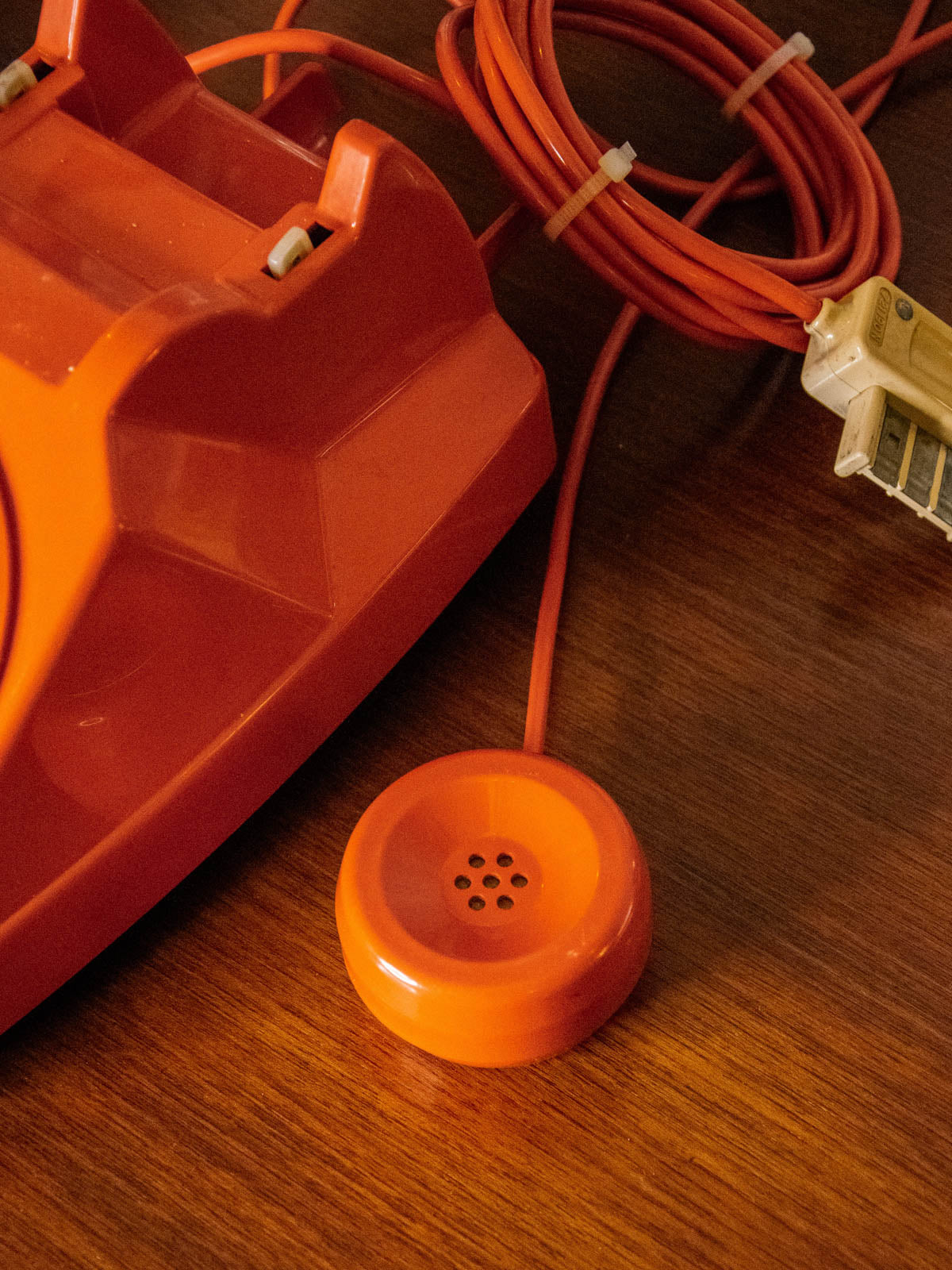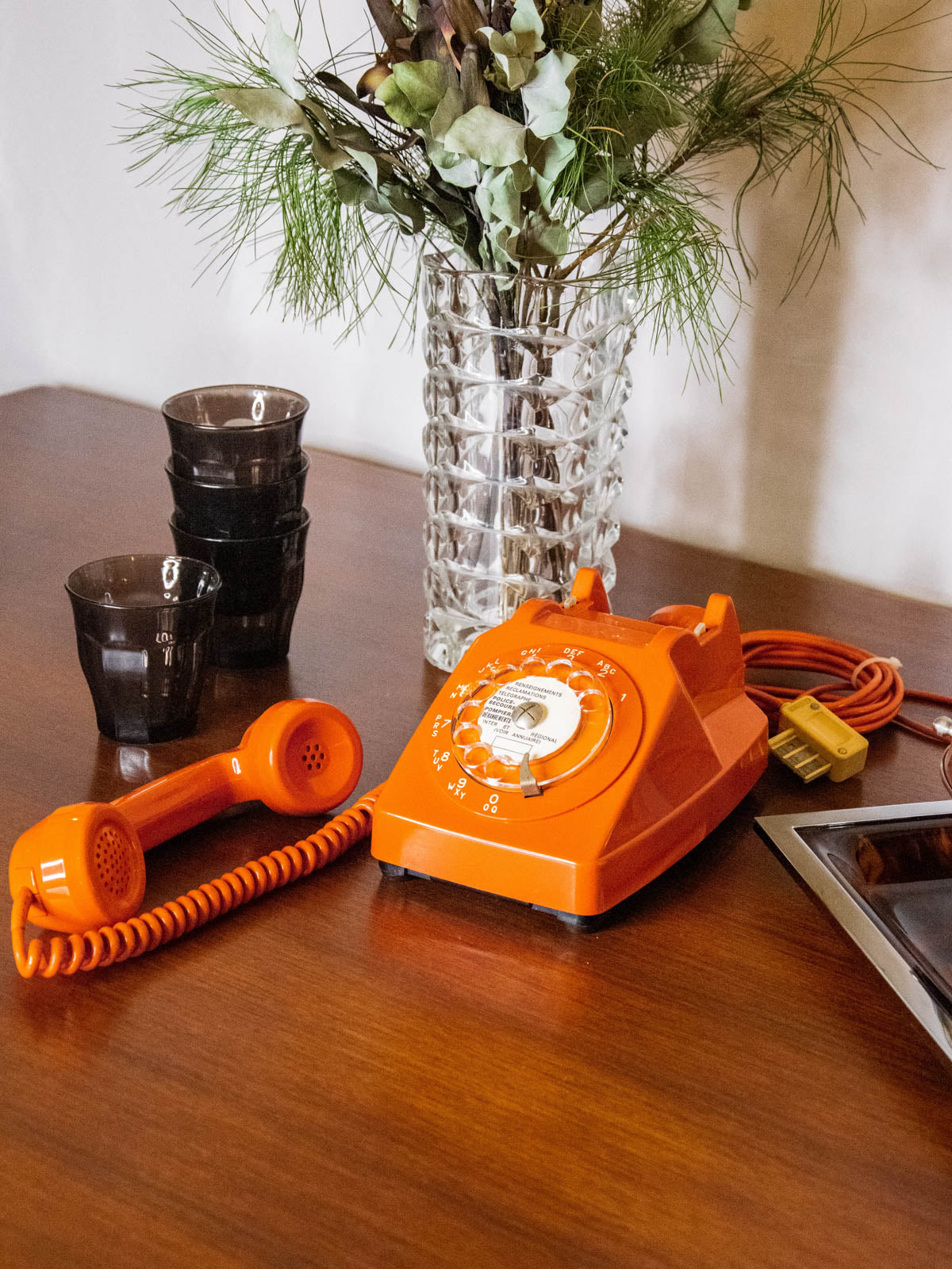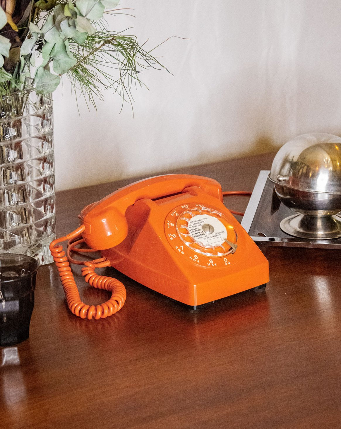 Adoptez ce téléphone orange vintage au charme rétro, doté d'un boîtier laqué qui apporte une touche pop et chaleureuse à votre intérieur. Son design graphique et ses proportions compactes en font un objet à la fois décoratif et fonctionnel, idéal pour ponctuer un bureau, une entrée ou un coin lecture d'une note colorée et nostalgique. Il invite à la conversation et à la mise en scène de votre décoration. Excellent état.