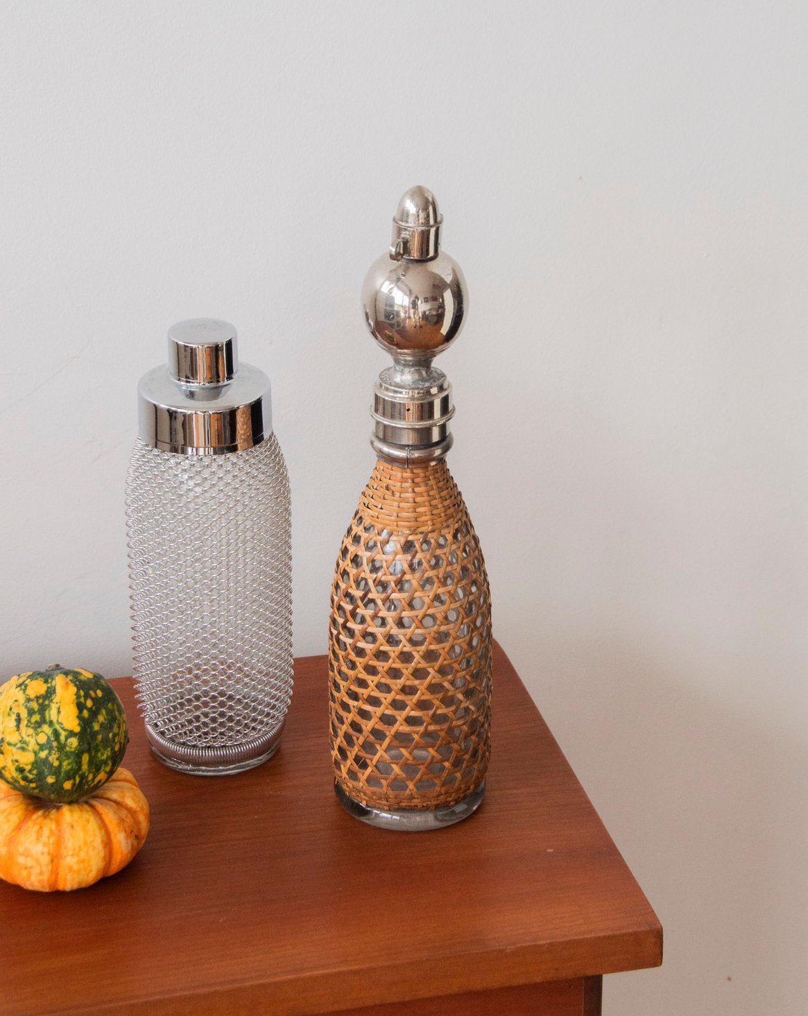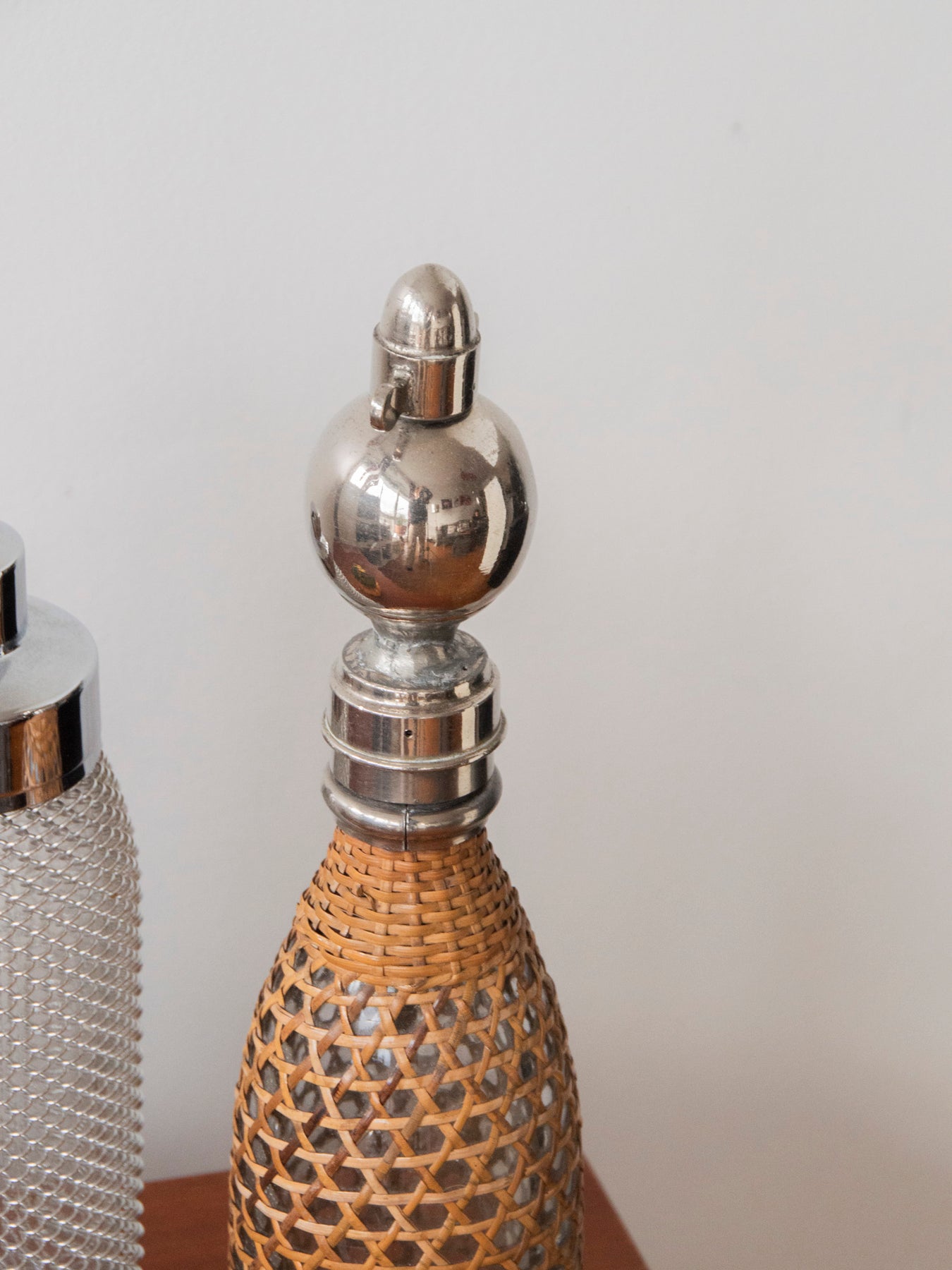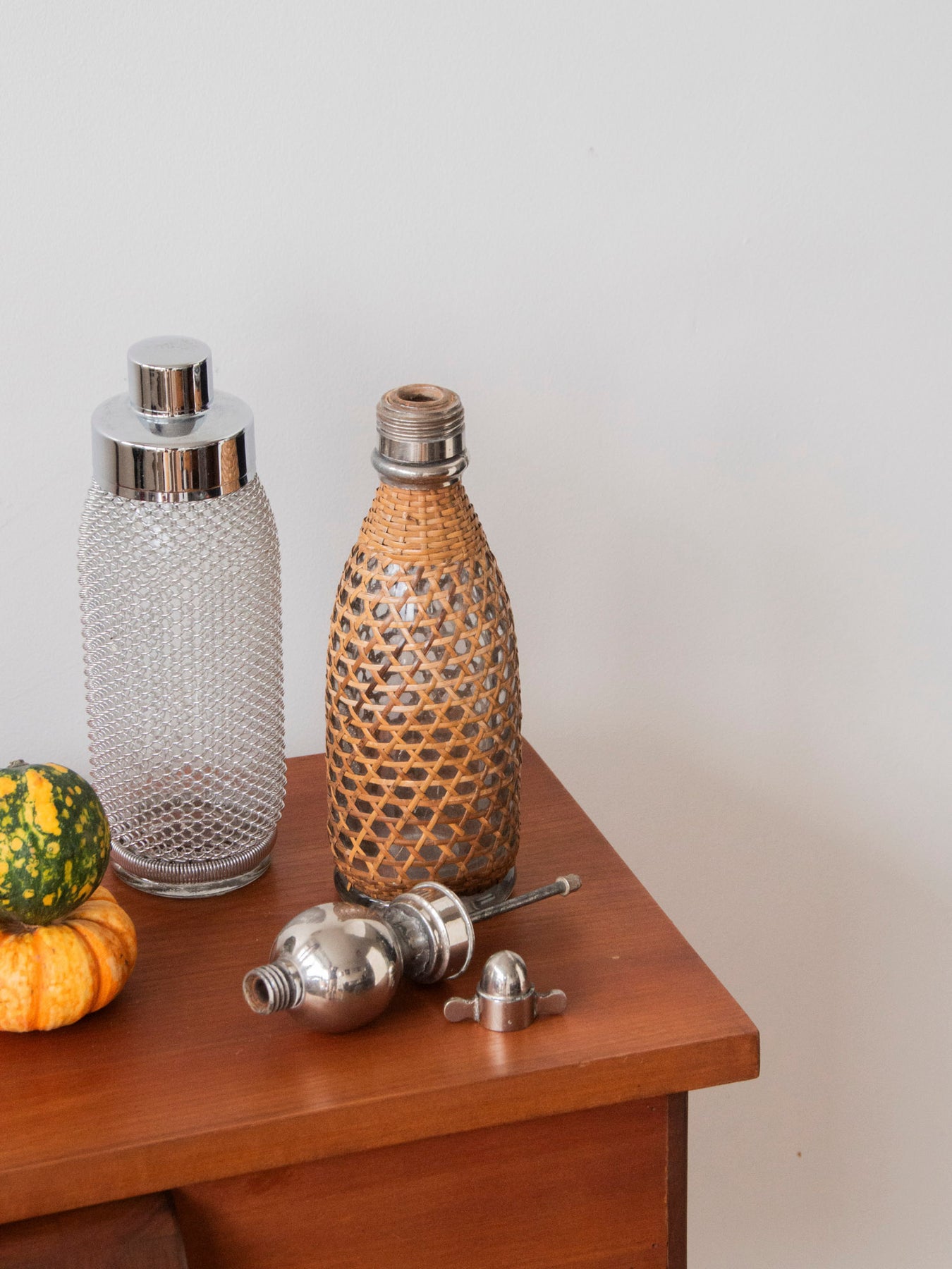 Découvrez ce siphon de voyage des années 60 en verre épais habillé d'un joli cannage en rotin, surmonté d'un bouchon sphérique argenté qui se dévisse en plusieurs parties pour accueillir la cartouche, offrant un mélange subtil de fonctionnalité et d'élégance. Posé sur un bar ou une étagère, il apporte une touche rétro et artisanale, idéale pour une mise en scène décorative ou une collection. Le verre et le cannage sont en très bon état. Un enfoncement à signaler au dos du bouchon.