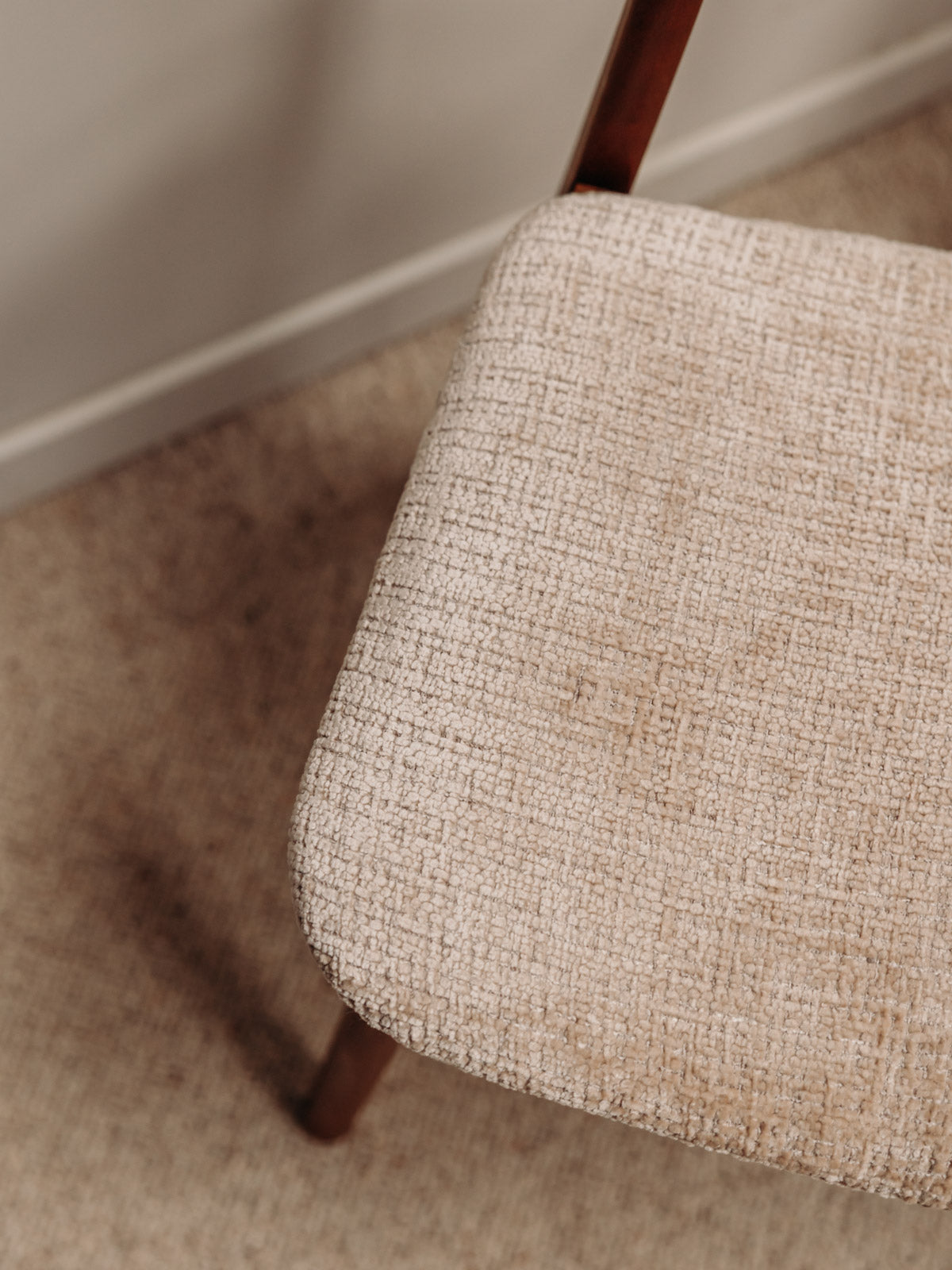 Optez pour ce lot de 2 chaises au charme discret des années 60, associant une structure en bois à un tissu velours rosé tout en douceur. Le dossier haut, rehaussé d’un empiècement bois, compose une silhouette élancée et chaleureuse, fidèle au style scandinave. Proportions contenues et assise confortable en font des pièces adaptées autour d’une table à manger ou comme sièges d’appoint dans un salon ou une chambre. Matériaux nobles et palette subtile apportent une touche rétro délicate à l’intérieur. Vendues en paire, deux sont disponibles.