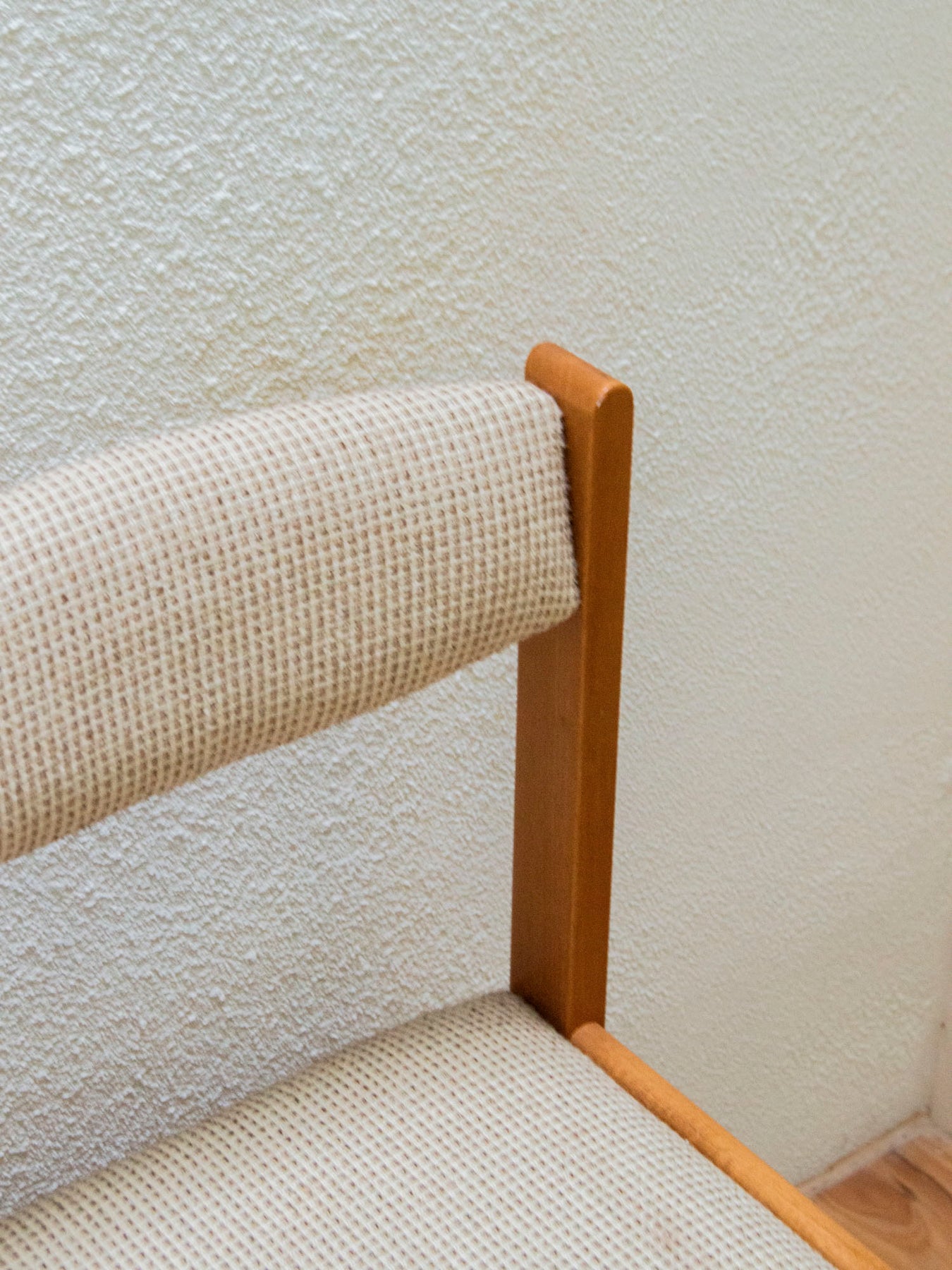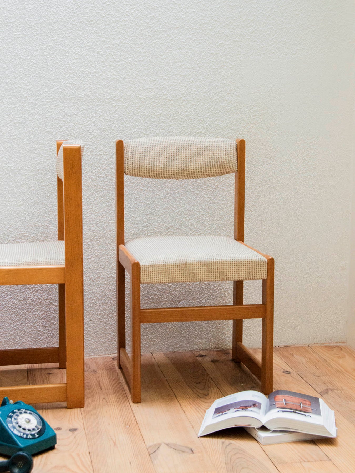 Adoptez cette paire de chaises habillées d'un tissu vintage d'origine gris-marron et sculptées dans un bois clair qui illumine l'espace. Leur structure aux lignes épurées, renforcée par une barre avant, affirme une silhouette élégante et stable, idéale pour une table à manger ou un coin bureau aux proportions compactes. L'assise accueille confortablement sans encombrer la pièce, tandis que la patine du tissu raconte une histoire discrète et chaleureuse. Un ensemble qui installe une ambiance sobre et accueillante.
