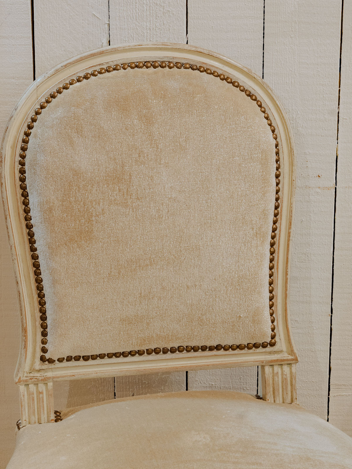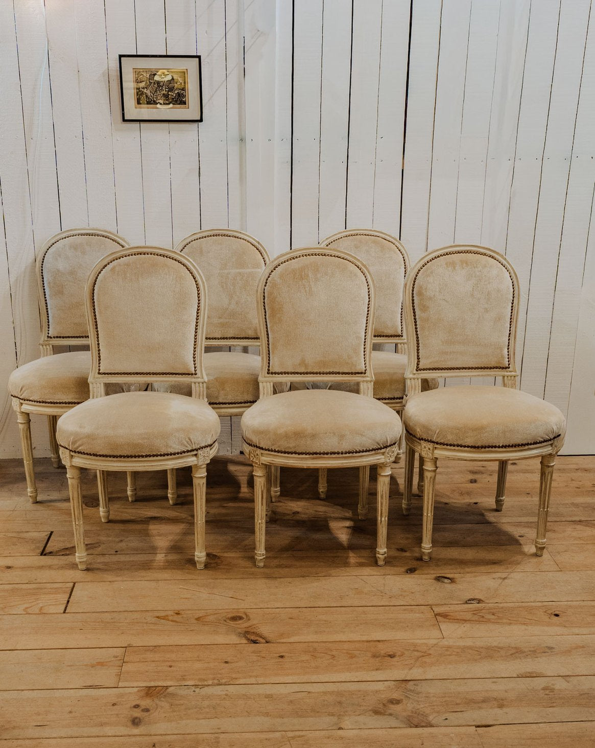 Invitez ces six chaises au velours beige légèrement pailleté, cloutées sur l'assise et le dossier, pour instaurer une atmosphère chaleureuse et raffinée autour de votre table. Leur structure en bois peint en blanc, à l'assise confortable, assure une stabilité adaptée aux usages quotidiens tout en restant légère visuellement. Le mélange de texture et de finition apporte une touche rétro-chic subtile, idéale pour une salle à manger ou un coin repas accueillant. Quelques traces du temps présentes.
