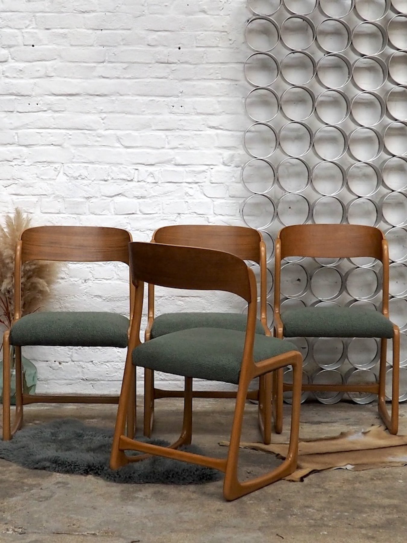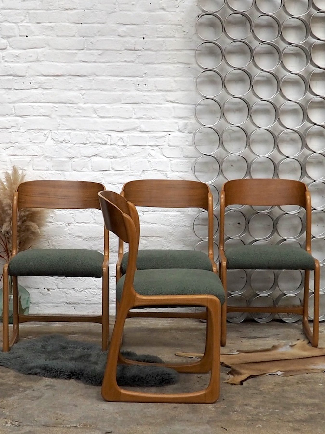 Adoptez ce lot de 4 chaises traîneau Baumann en velours vert, associant une assise moelleuse à une structure en hêtre et en teck. Leur silhouette élancée et le piétement traîneau offrent un confort stable et une hauteur d'assise adaptée à une table à manger ou un coin repas convivial. Datant des années 70, leur mélange de textures crée une allure rétro-chic discrète, parfaite pour apporter une touche d'élégance et une atmosphère chaleureuse à votre intérieur.