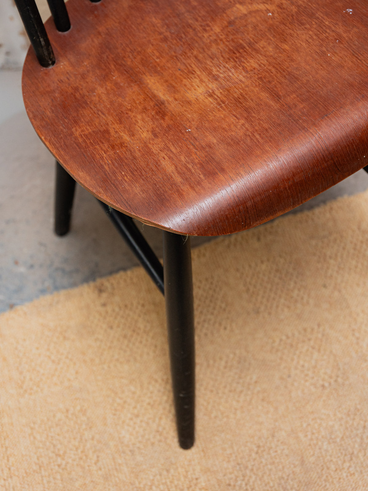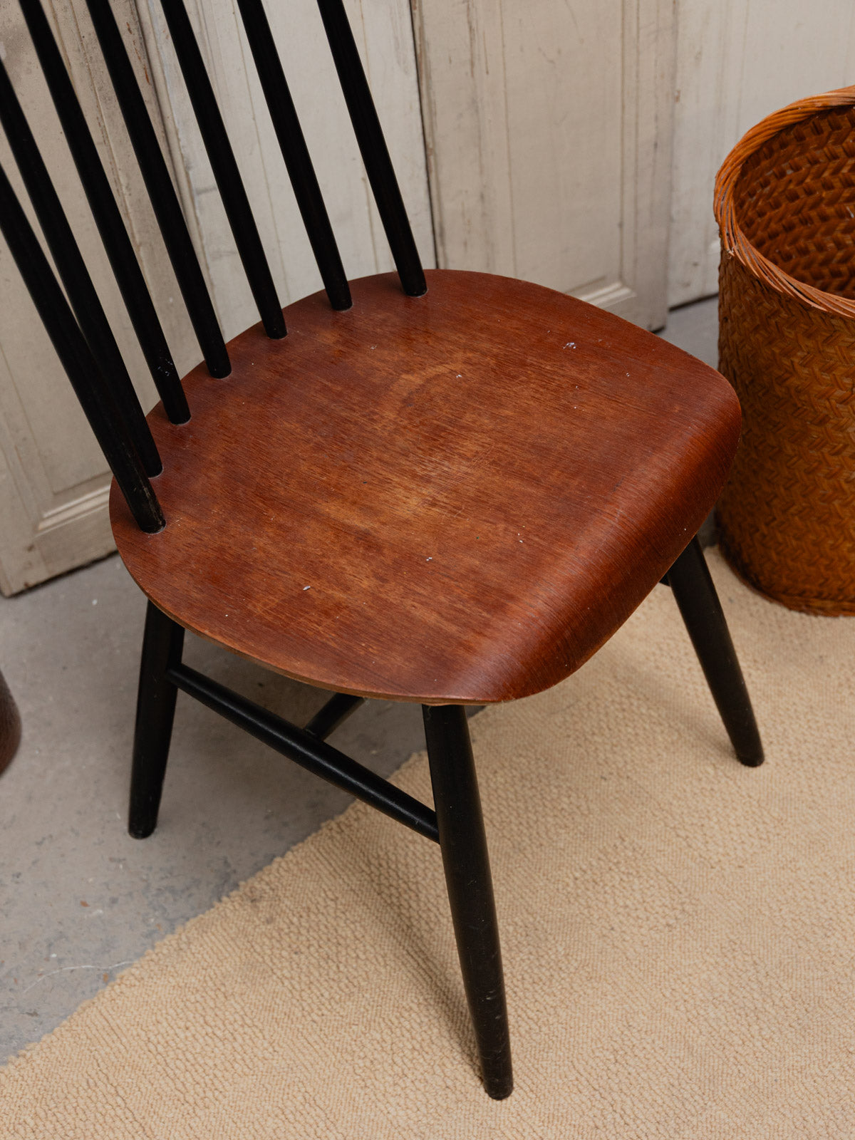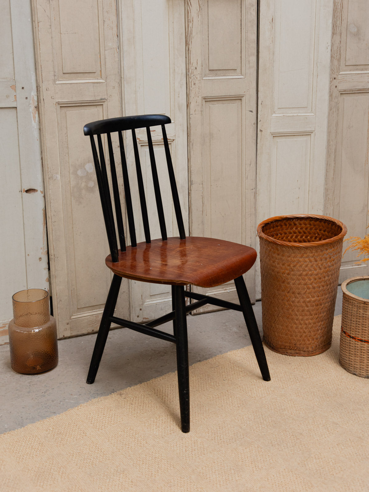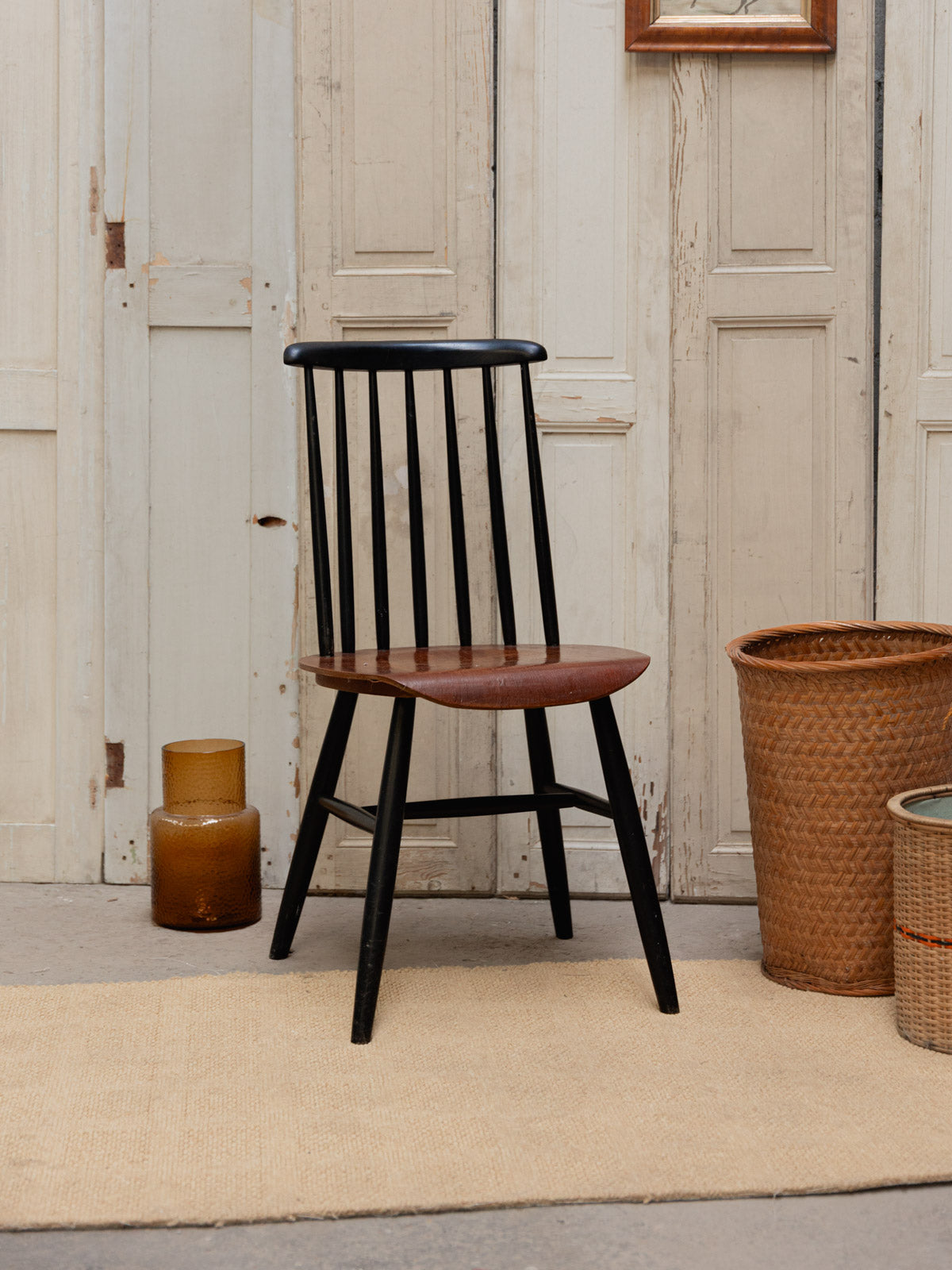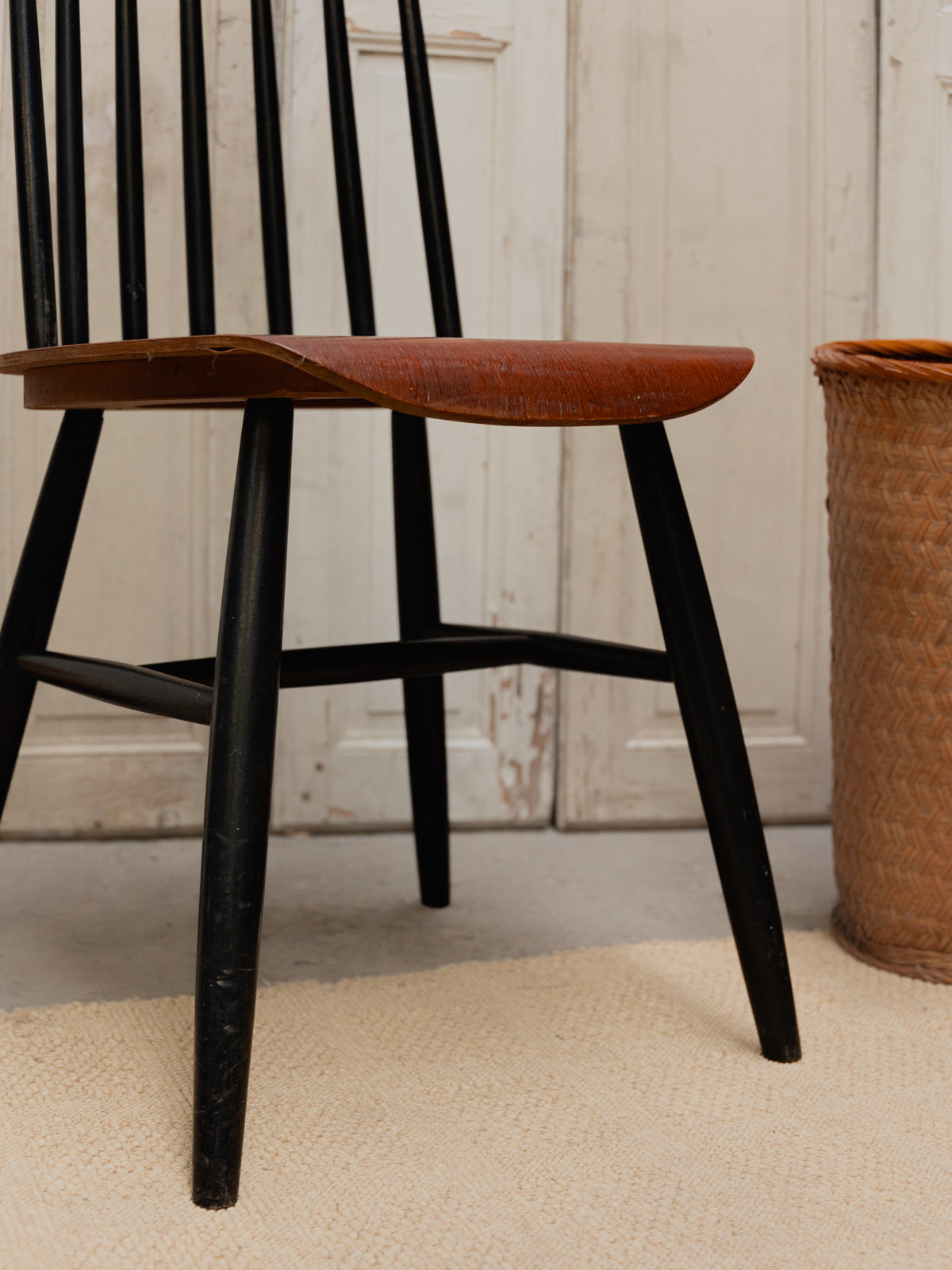 Adoptez cette chaise des années 60, inspirée du modèle Fanett, avec une assise en bois foncé reposant sur une structure noire mate, qui conjugue élégance et sobriété. Le dossier à barreaux, typique du style suédois, offre une silhouette aérienne et un maintien naturel, idéale autour d'une table ou dans un coin bureau. Ses proportions équilibrées permettent de l'associer à des matières chaleureuses comme le lin ou la laine. Elle diffuse une ambiance conviviale et apaisée. Présence de traces d'usage.