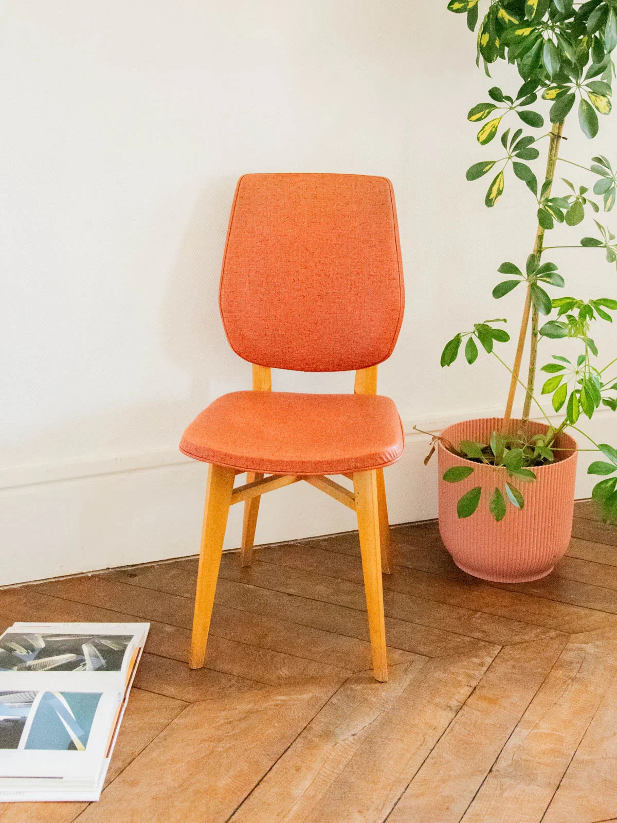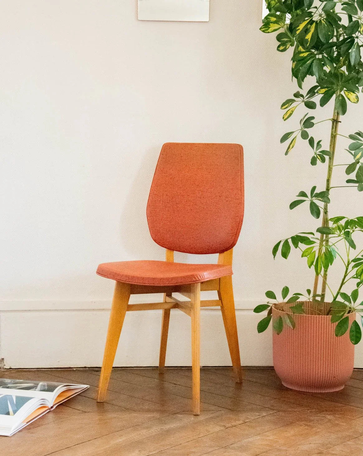 Adoptez cette chaise en bois clair au design épuré, rehaussée d'une assise en skaï couleur terre cuite mouchetée de noir qui apporte chaleur et caractère. Sa silhouette élancée et ses proportions contenues la rendent idéale autour d'une table de repas ou pour ponctuer un coin bureau, tandis que le bois révèle une noblesse naturelle et une sensation accueillante. Le skaï, facile d'entretien, conjugue praticité et élégance quotidienne, créant une atmosphère conviviale et contemporaine. Vendue à l'unité, 5 quantités sont disponibles.