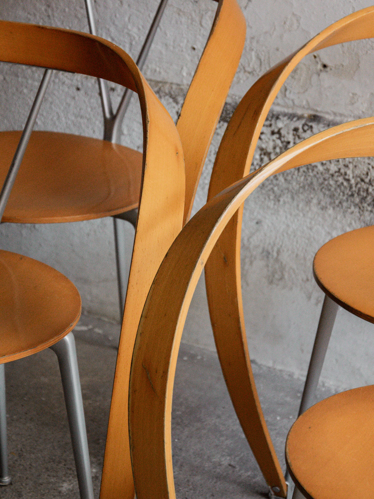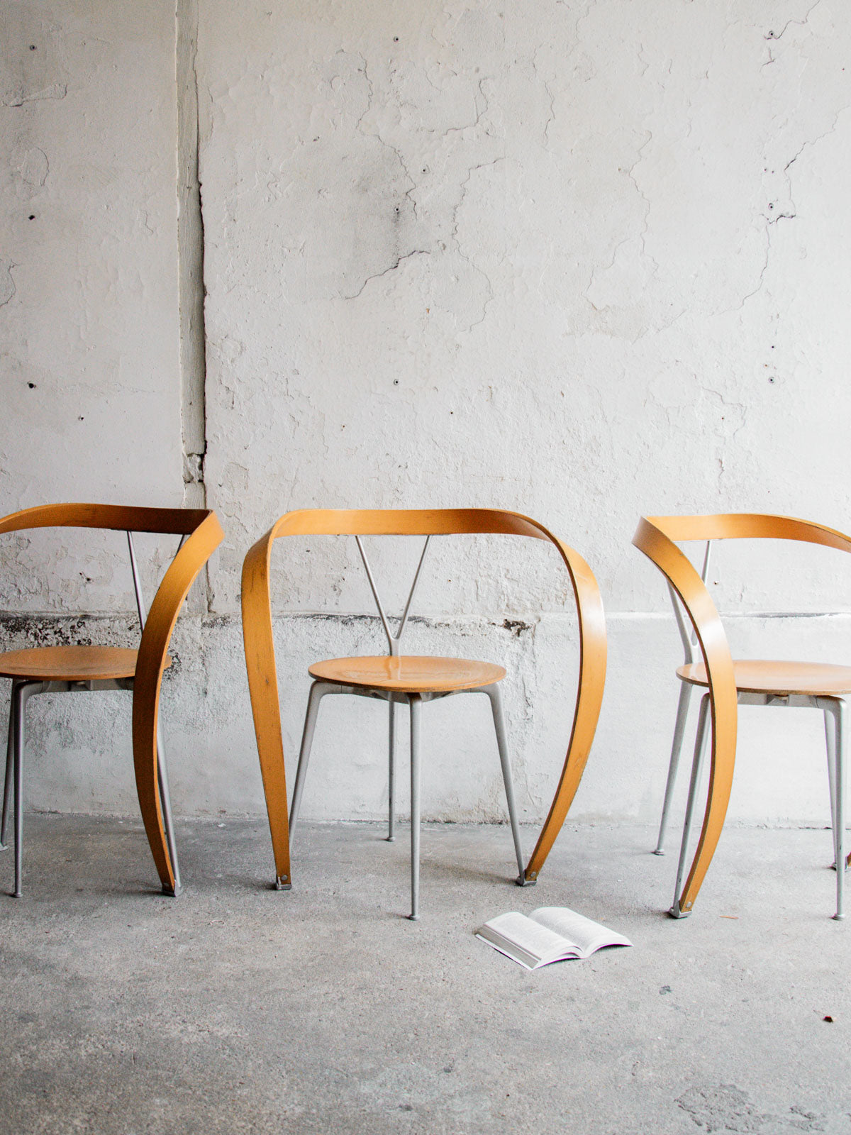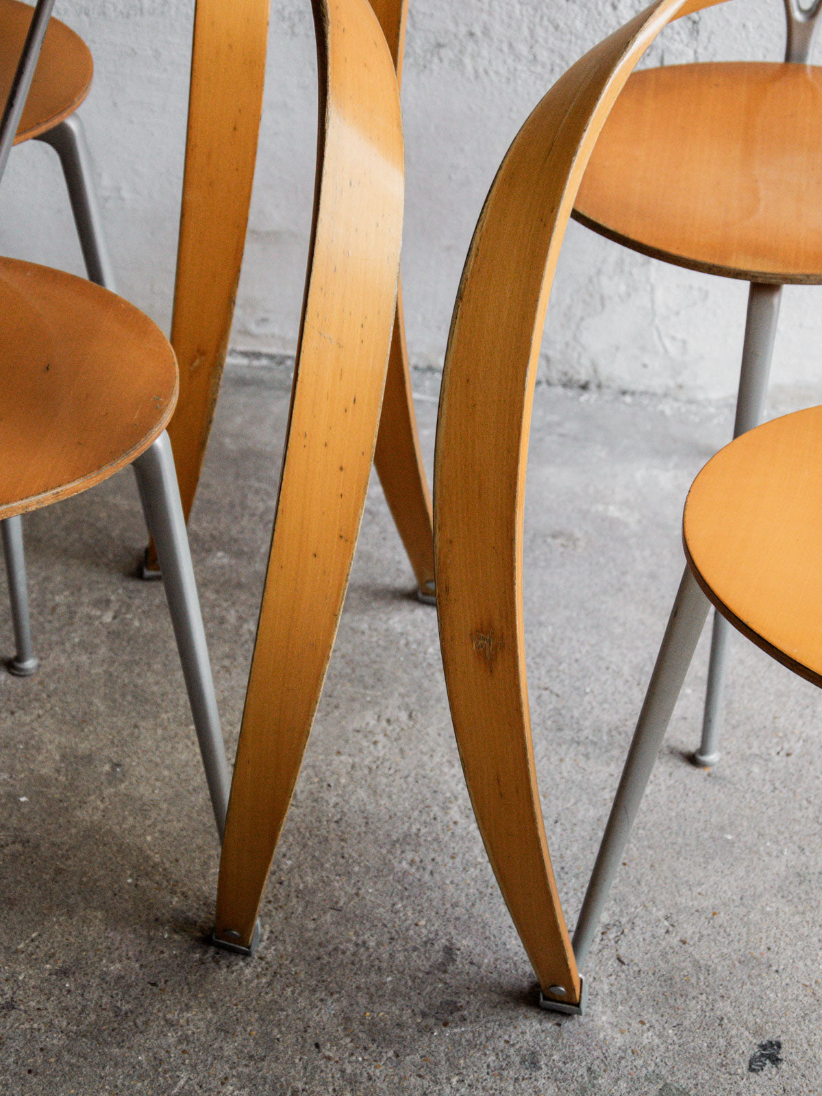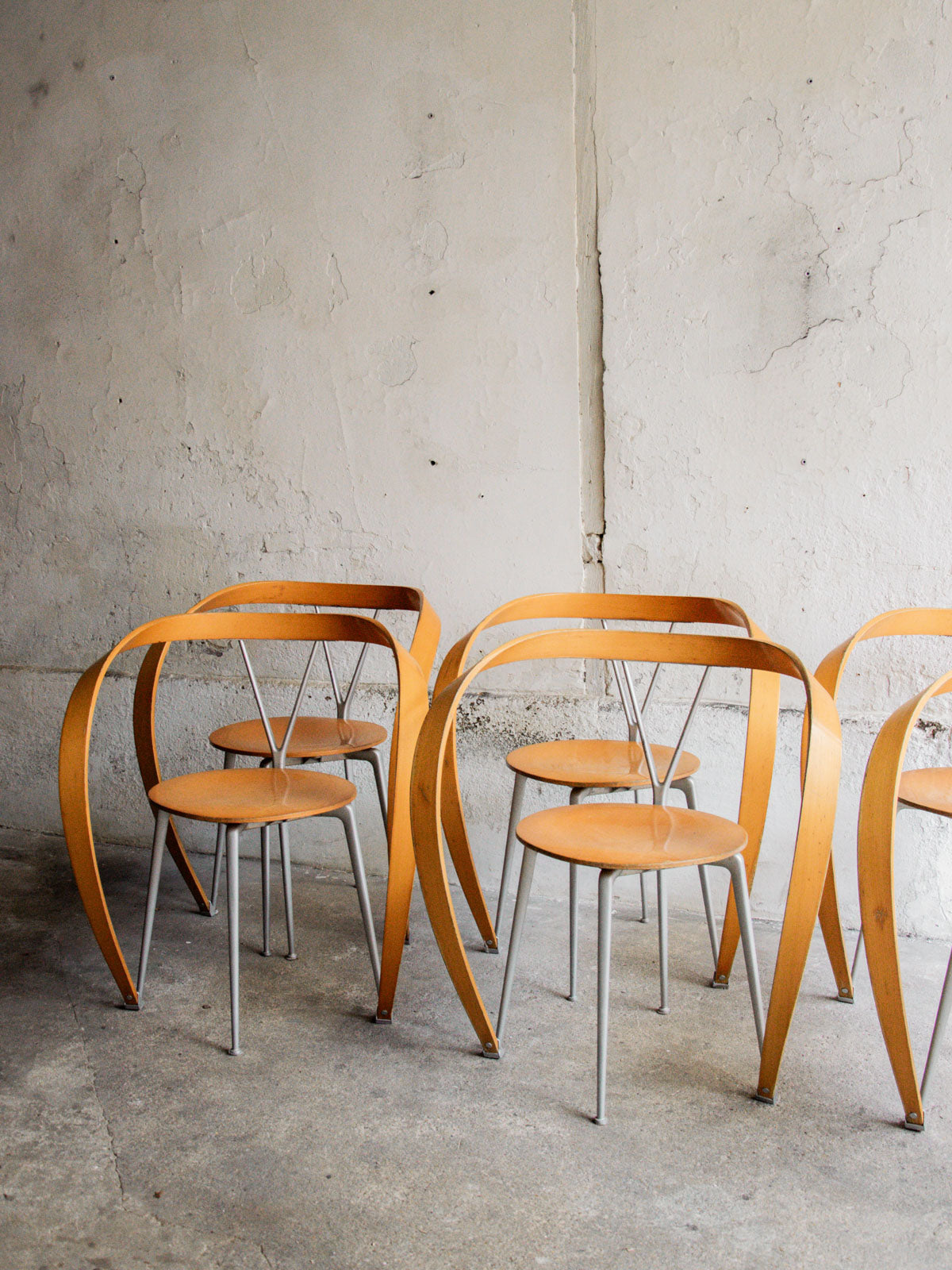 Lot de 6 chaises « Revers » conçues par Andrea Branzi pour Cassina dans les années 90. Chaque chaise combine une structure en aluminium avec des assises et dossiers en hêtre, offrant un design à la fois léger et sculptural. Modèle iconique, dessiné en 1993 et non réédité depuis 1999. Ensemble en très bel état général, avec quelques marques d’usage sur le vernis, notamment au niveau des accoudoirs. L’étiquette de l’éditeur est présente sous chaque assise.
