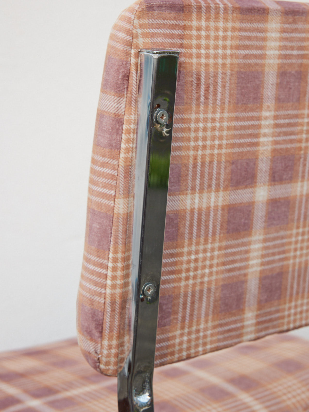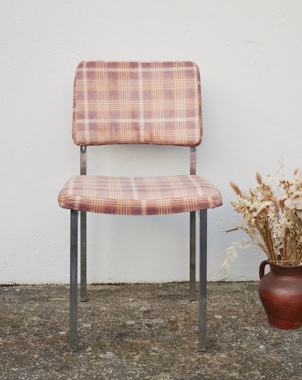 Découvrez cette chaise des années 70 recouverte d’un velours écossais neuf, rénové à la main pour obtenir un délicat effet ancien. Son piètement chromé apporte une touche graphique et légère, révélant l’alliance du métal et du tissu. L'assise au toucher doux et les proportions équilibrées invitent à s'installer pour un coin lecture, une salle à manger intime ou comme pièce d'appoint. Elle insuffle une atmosphère chaleureuse et raffinée, parfaite pour un intérieur vintage contemporain.