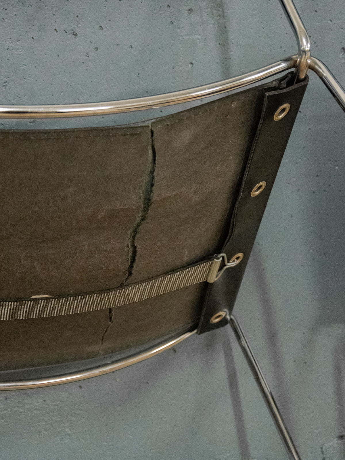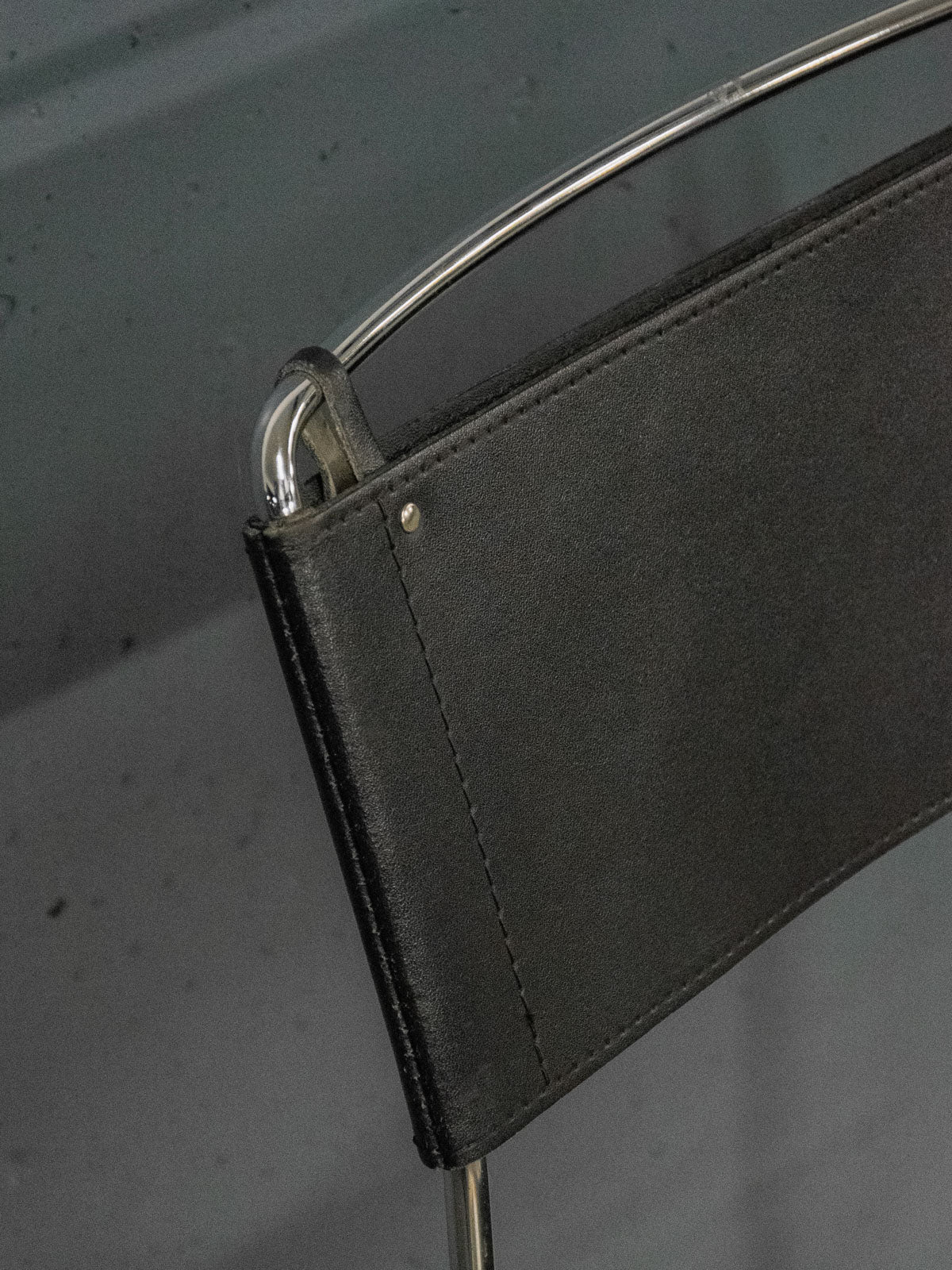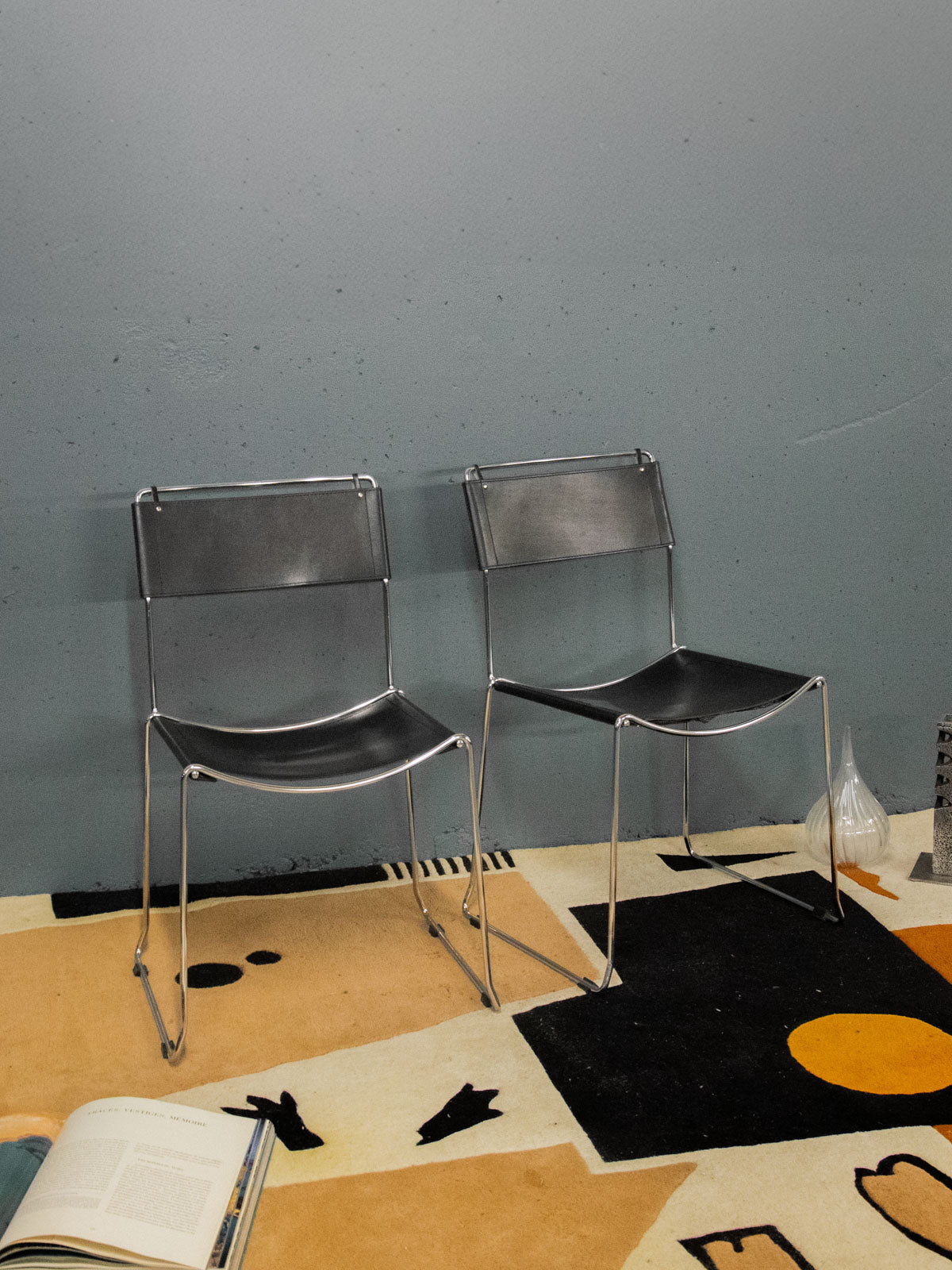 Adoptez cette paire de chaises italiennes des années 1980, alliant une base en chrome et une assise et un dossier en cuir noir pour un style graphique et raffiné. Leur silhouette élancée et l'assise accueillante s'adaptent aussi bien à une salle à manger qu'à un bureau, apportant une atmosphère rétro contemporaine à votre intérieur. Les matériaux soulignent une esthétique authentique et facile à vivre, malgré des signes d'âge visibles sur le cuir et la structure. Le cuir est notamment abîmé sur le dessous de l'assise. Vendues à paire, 3 quantités sont disponibles.