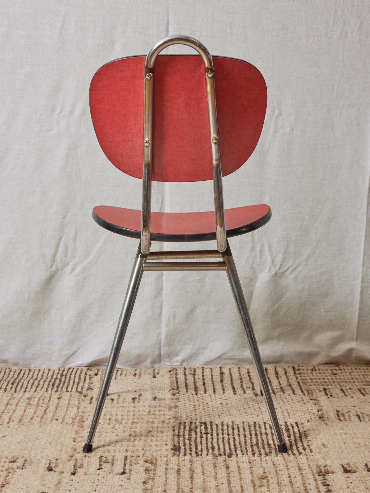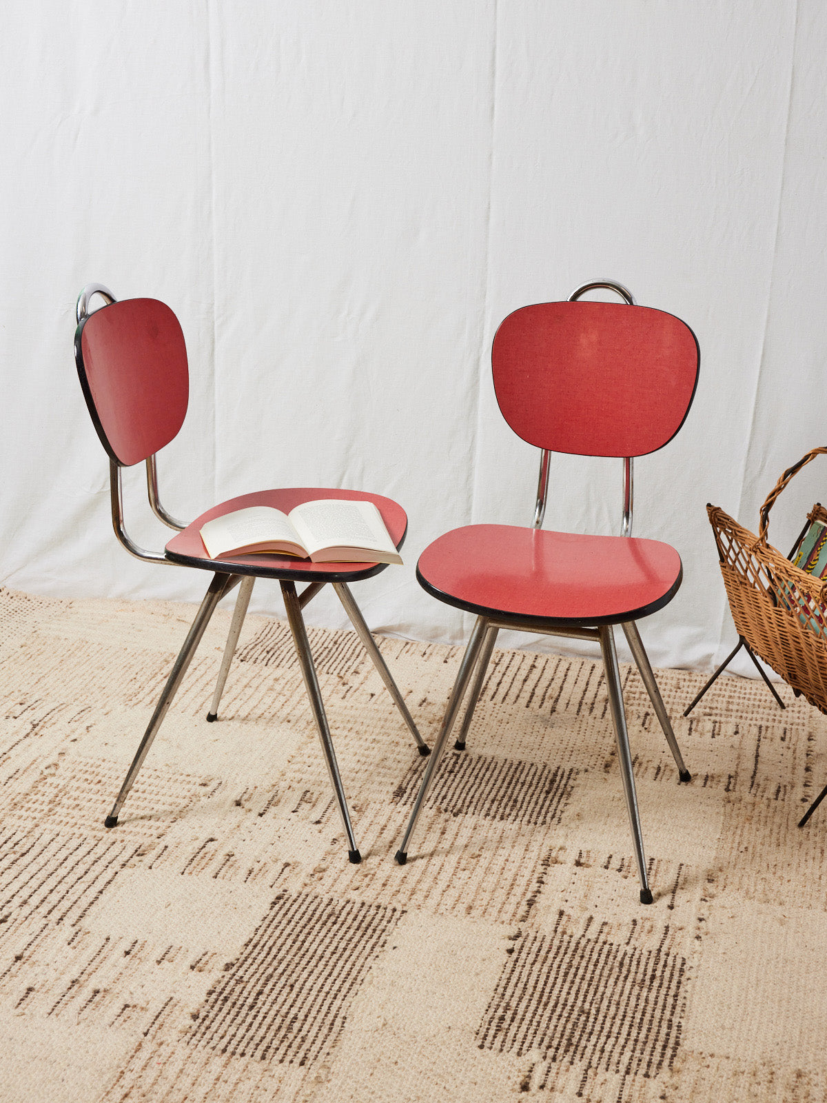 Adoptez cette paire de chaises des années 70 en formica rouge et structure chromée, symbole d'un design graphique et lumineux. Leur assise aux proportions équilibrées offre un confort naturel pour une salle à manger, un coin petit-déjeuner ou un bureau contemporain. Le contraste entre le rouge vif du formica et la brillance du chrome apporte une touche rétro raffinée qui anime subtilement l'espace. Ces pièces incarnent une esthétique vintage facile à associer à un intérieur moderne.