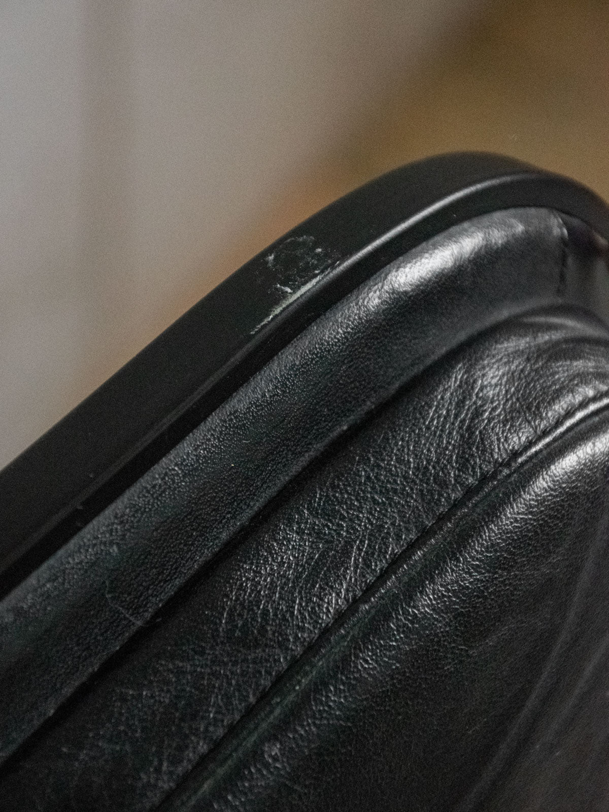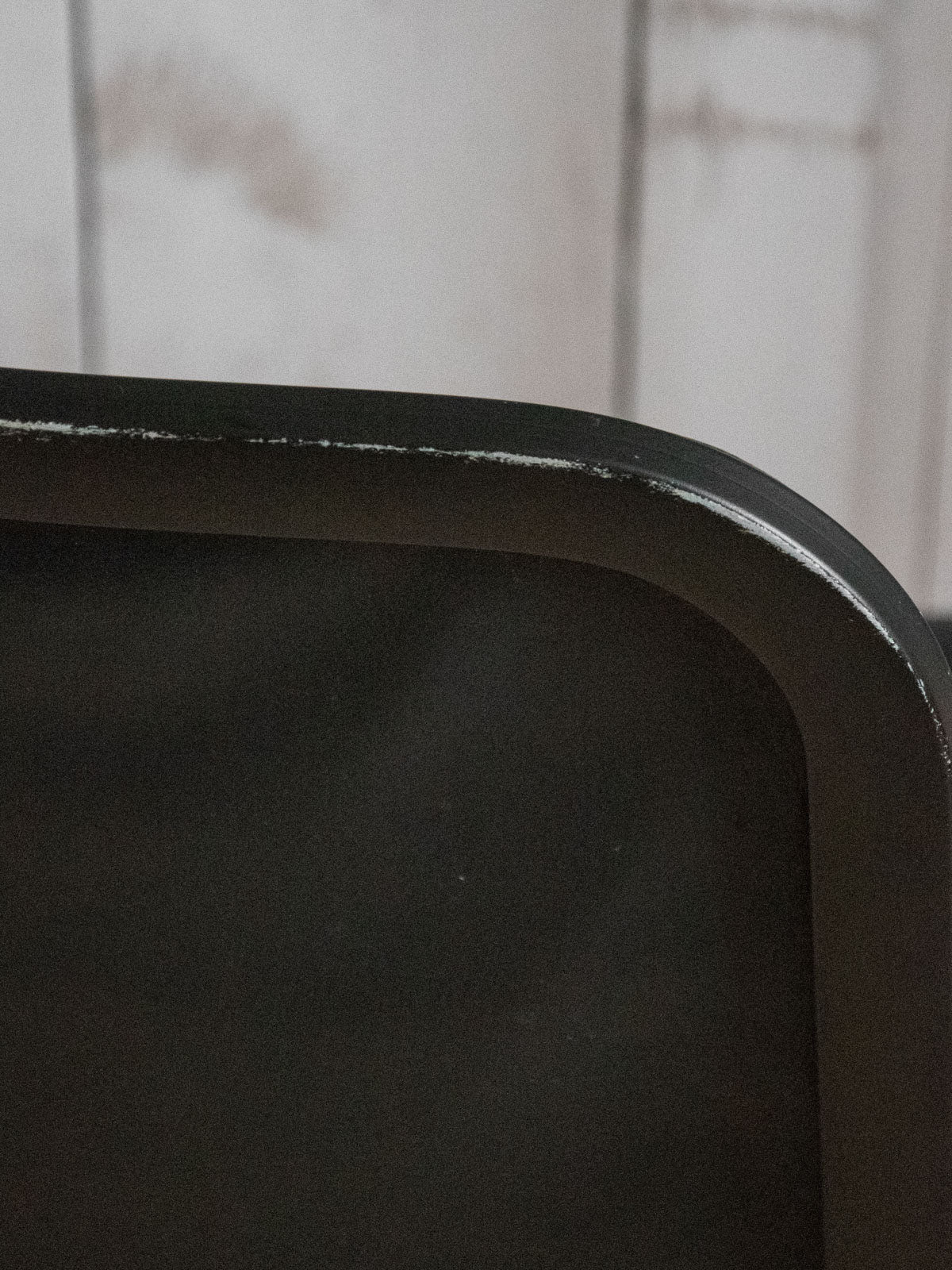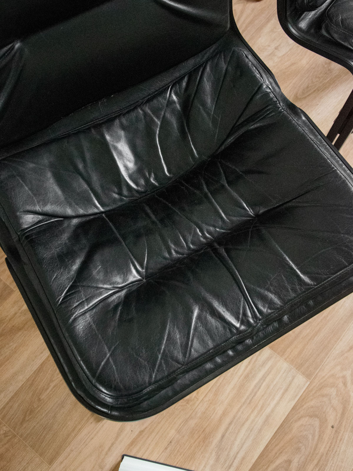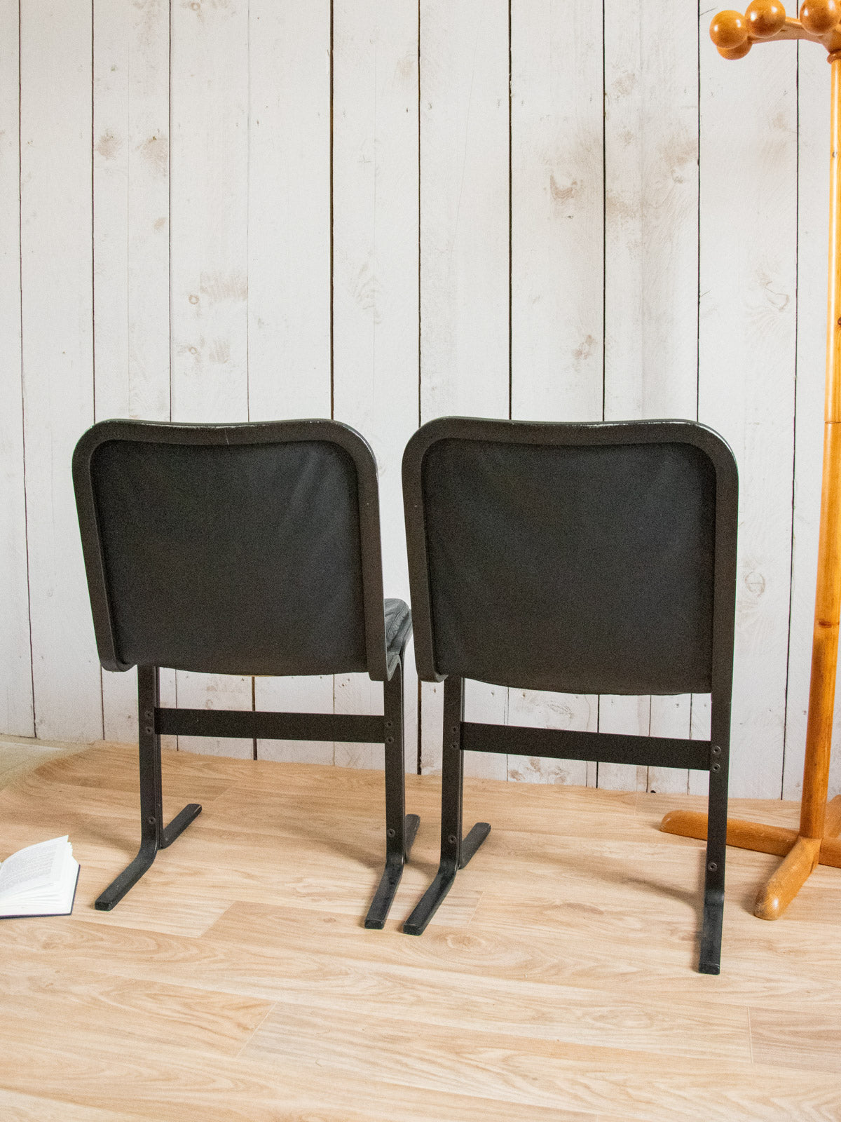 Adoptez cette paire de chaises italiennes des années 70 à structure métal et assise en cuir noir, où l'alliance du métal sombre et du cuir impeccablement conservé crée une allure élégante et raffinée. Leur silhouette légère et proportions mesurées s'intègrent autour d'une table de repas, dans un bureau ou un coin salon, apportant une touche vintage maîtrisée. Le cuir offre un confort immédiat tandis que le métal garantit solidité et caractère. Usure de la peinture et pieds patinés naturellement.