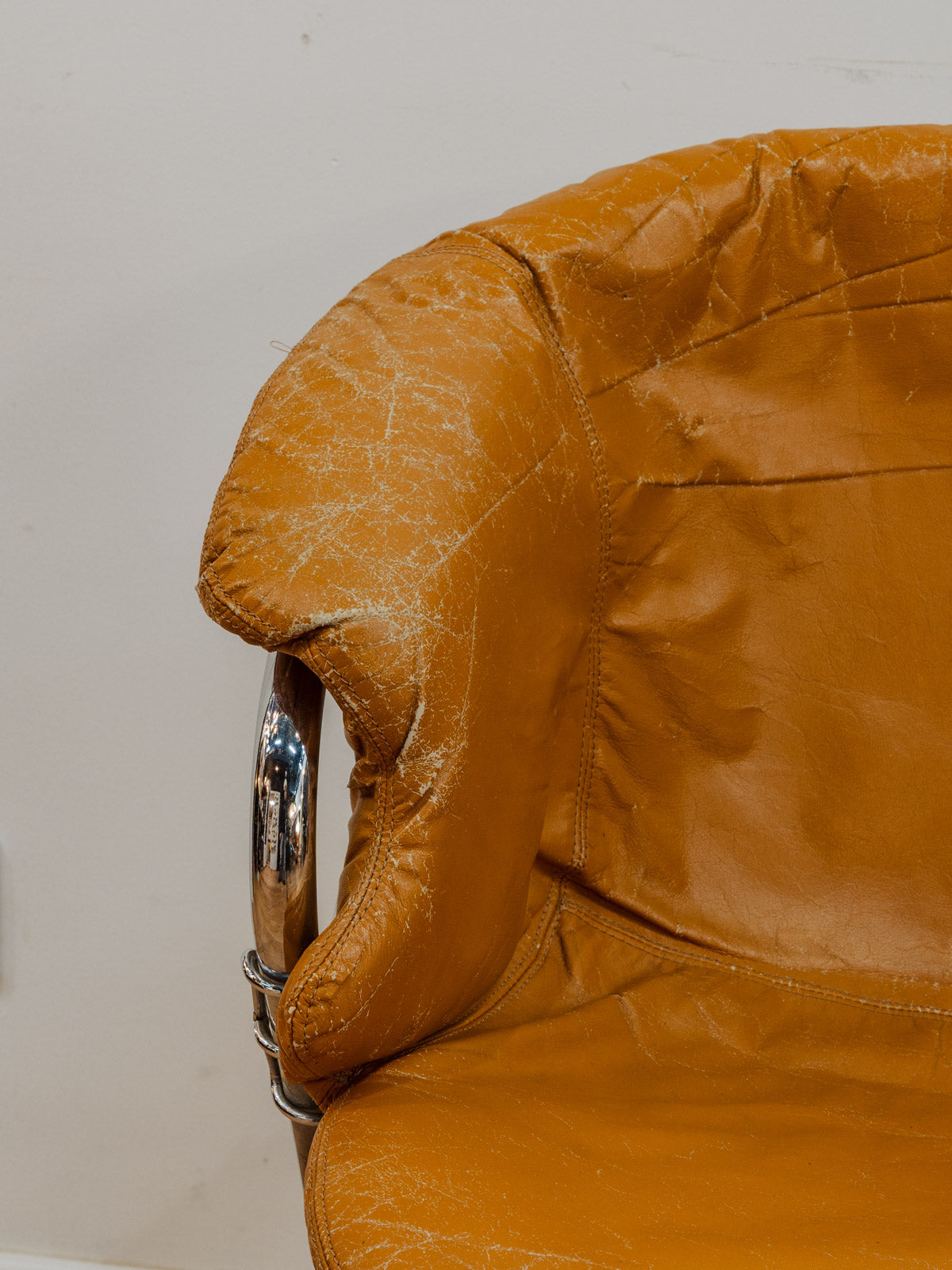Adoptez ce lot de six chaises vintage, modèle Flynn attribué à Gastone Rinaldi, qui marie une structure chromée à une assise et un dossier en cuir beige foncé. Leur silhouette graphique apporte une élégance à une salle à manger ou aux espaces de réception, tandis que le cuir patiné promet confort et chaleur visuelle. Idéals pour composer un ensemble harmonieux mêlant modernité et raffinement. Quelques traces du temps qui font leur authenticité.