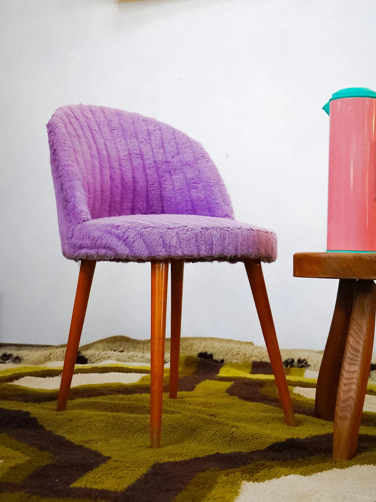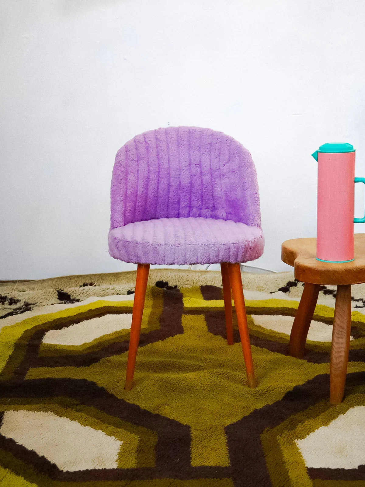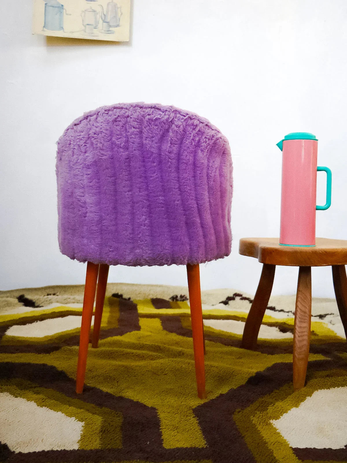 Adoptez cette chaise cocktail au piètement en hêtre et à l'assise en tissu moumoute violette, qui marie chaleur du bois et douceur du textile pour une présence accueillante. Son format compact et son assise enveloppante invitent à la détente, idéale en coin lecture, près d'une table basse ou comme touche colorée dans un salon contemporain. Le contraste entre le bois clair et la fourrure crée une ambiance rétro-chic, sobre et élégante.