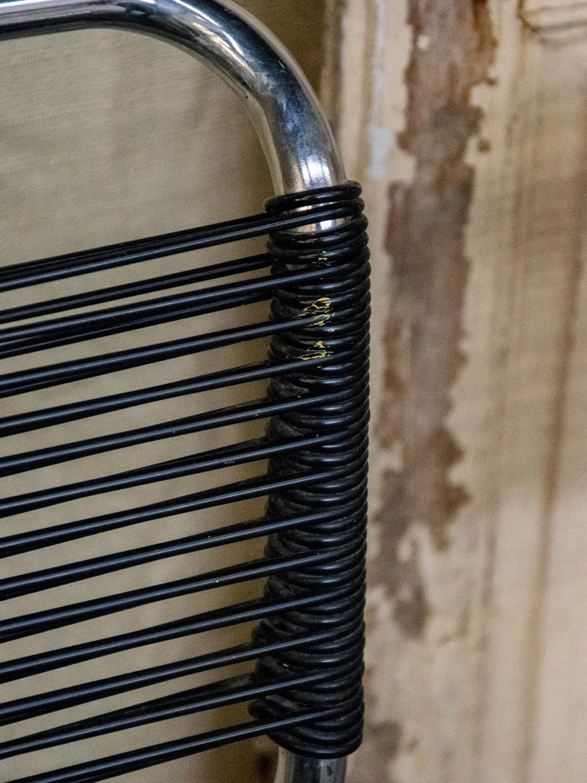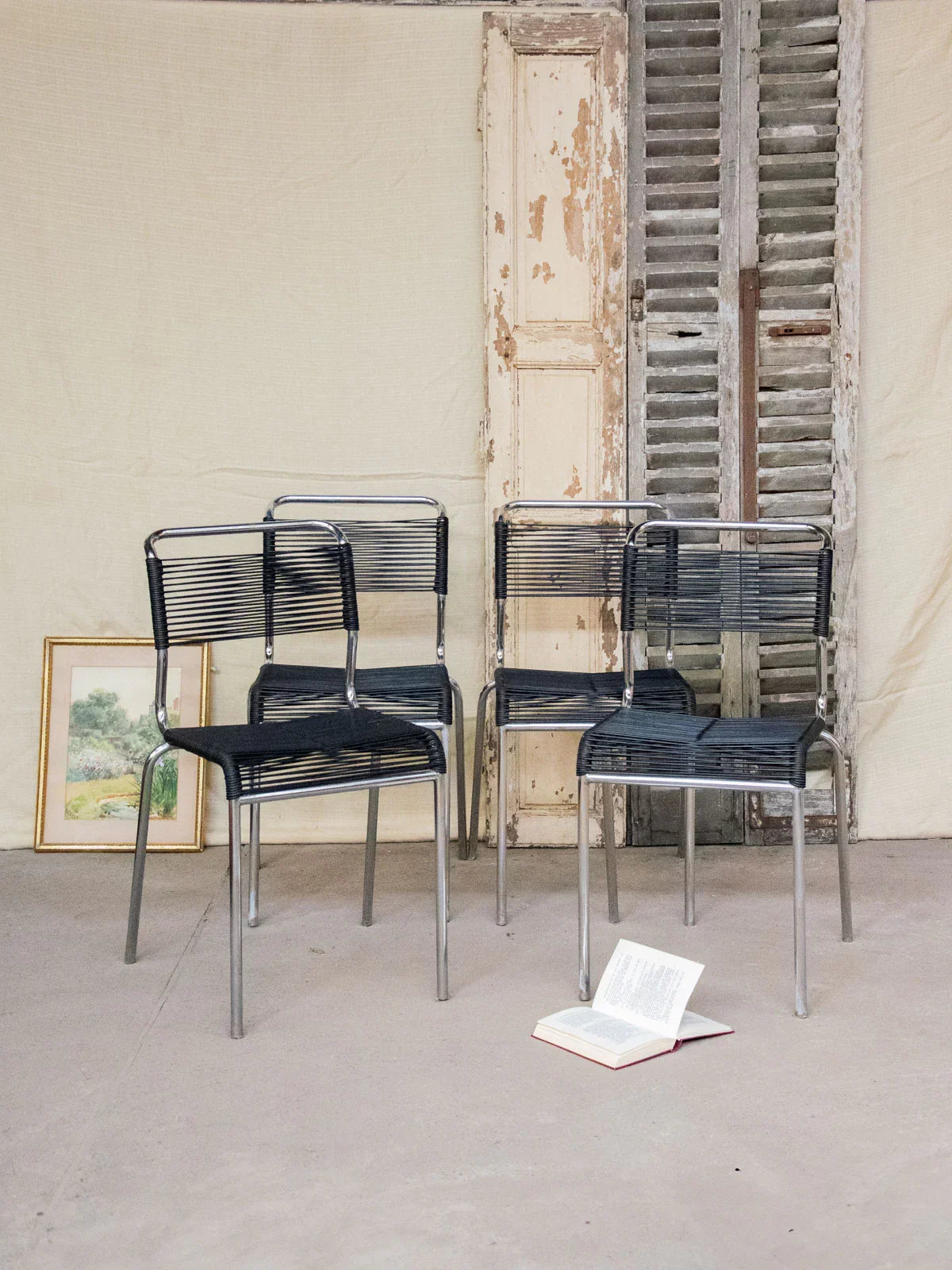 Invitez ces quatre chaises au design rétro en métal chromé, assise et dossier en scoubidou noir tressés et croisés pour un effet graphique et chaleureux. Le dossier recourbé élance la silhouette et assure un maintien agréable, parfait autour d'une table, dans un coin repas ou pour ponctuer un bureau contemporain. Le contraste du chrome et de la matière synthétique crée une ambiance vintage, conviviale et raffinée. Légères traces du temps présentes.